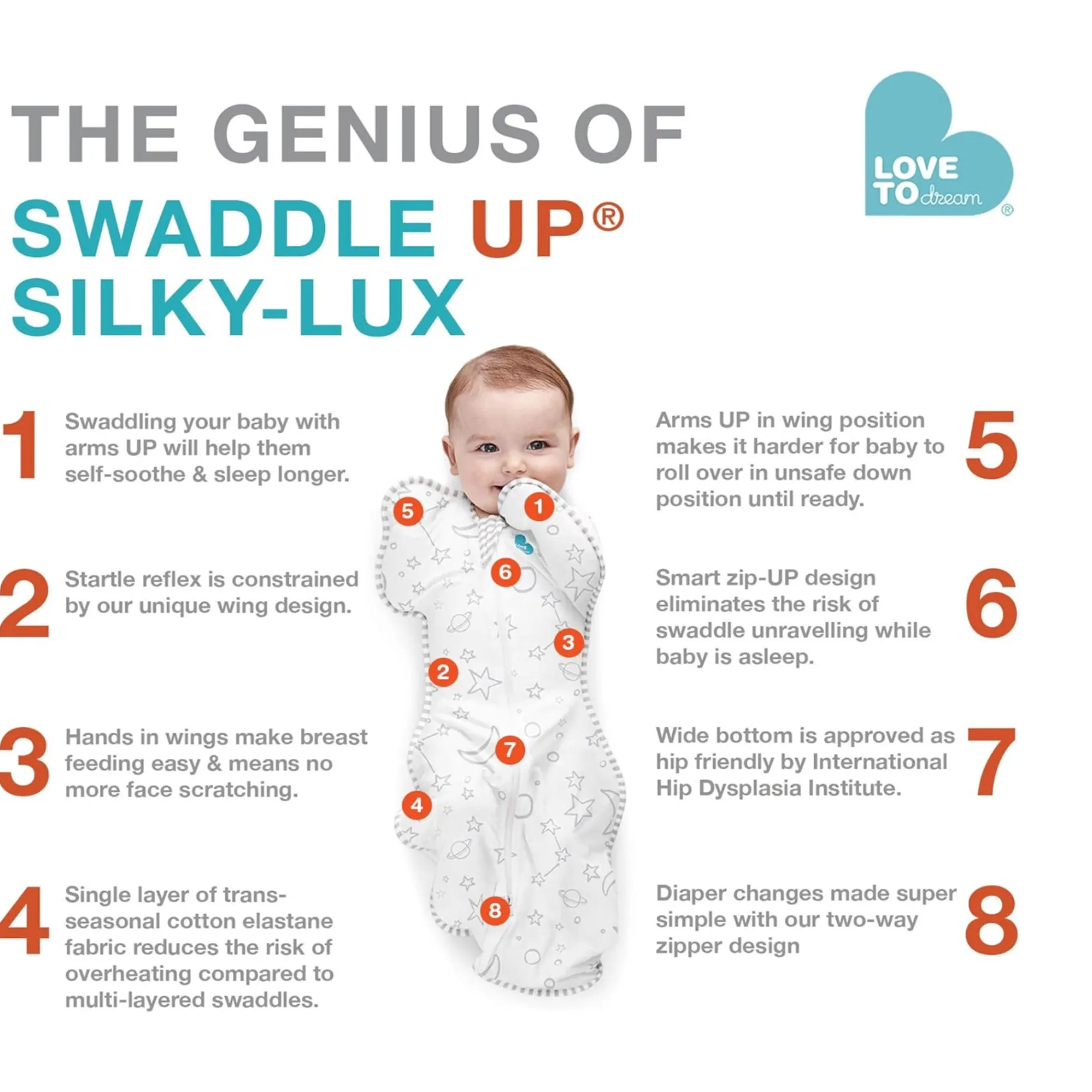 The innovative SWADDLE UP SILKY-LUX™ with patented wings allows babies to sleep in a more natural position, with their ARMS UP™, so they can self-soothe by sucking their hands and touching their face. Medical research has shown that when babies can self-soothe, they sleep longer. The SWADDLE UP™ is intended for use from day one™ and can help parents establish a solid foundation for sleep, right from birth.