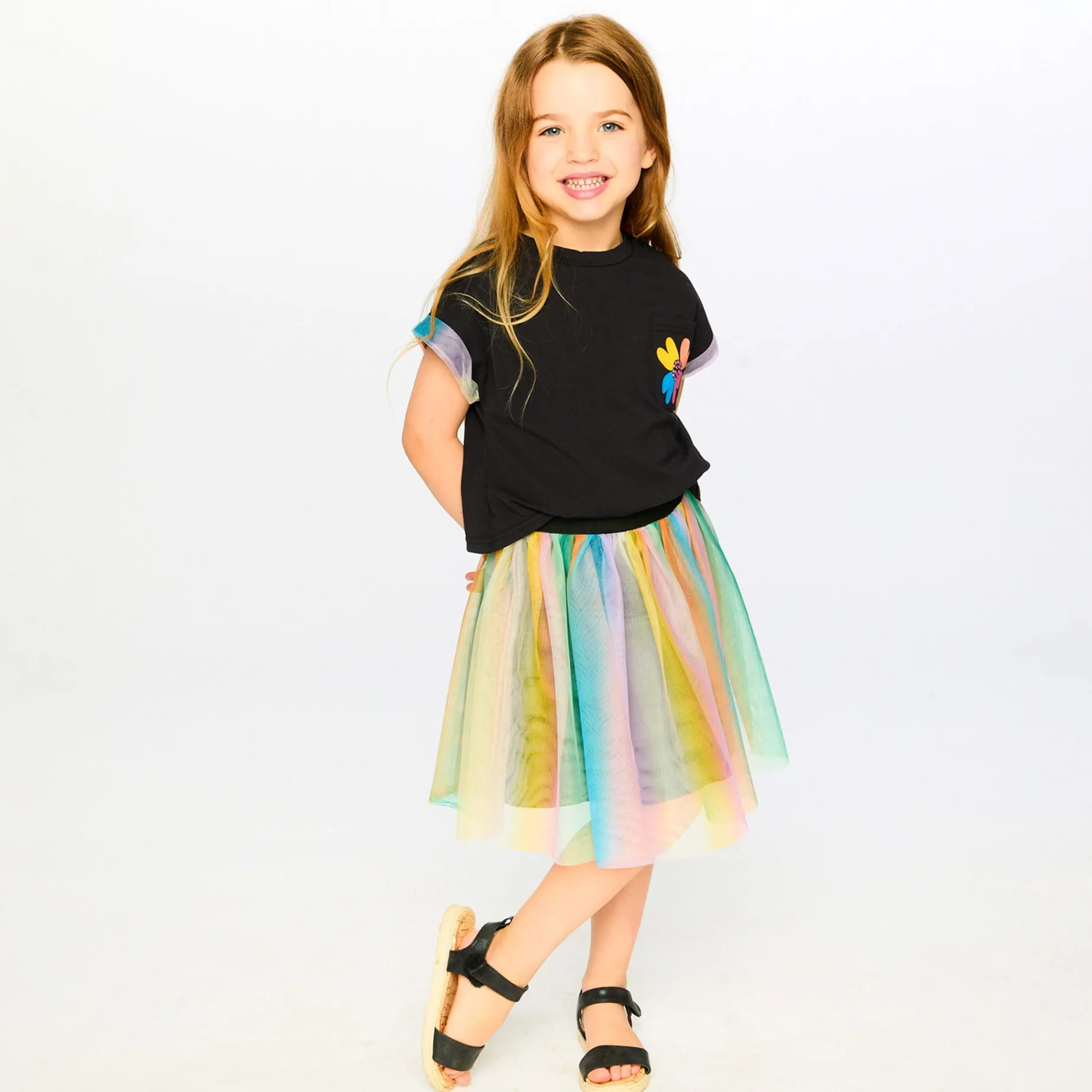 The bi-material dress in black brings a fun twist to everyday wear with its playful mix of textures. This short-sleeve dress combines a soft organic cotton jersey top with a rainbow-hued mesh skirt and features a round neckline, rainbow-colored sleeve borders and a small flower detail on the chest pocket. Made from a blend of breathable organic cotton with a polyester mesh skirt and lining, it ensures comfort and flair for every adventure.Sizes 2 and 3 years are designed without detachable 3D embellishments to ensure young children’s safety.