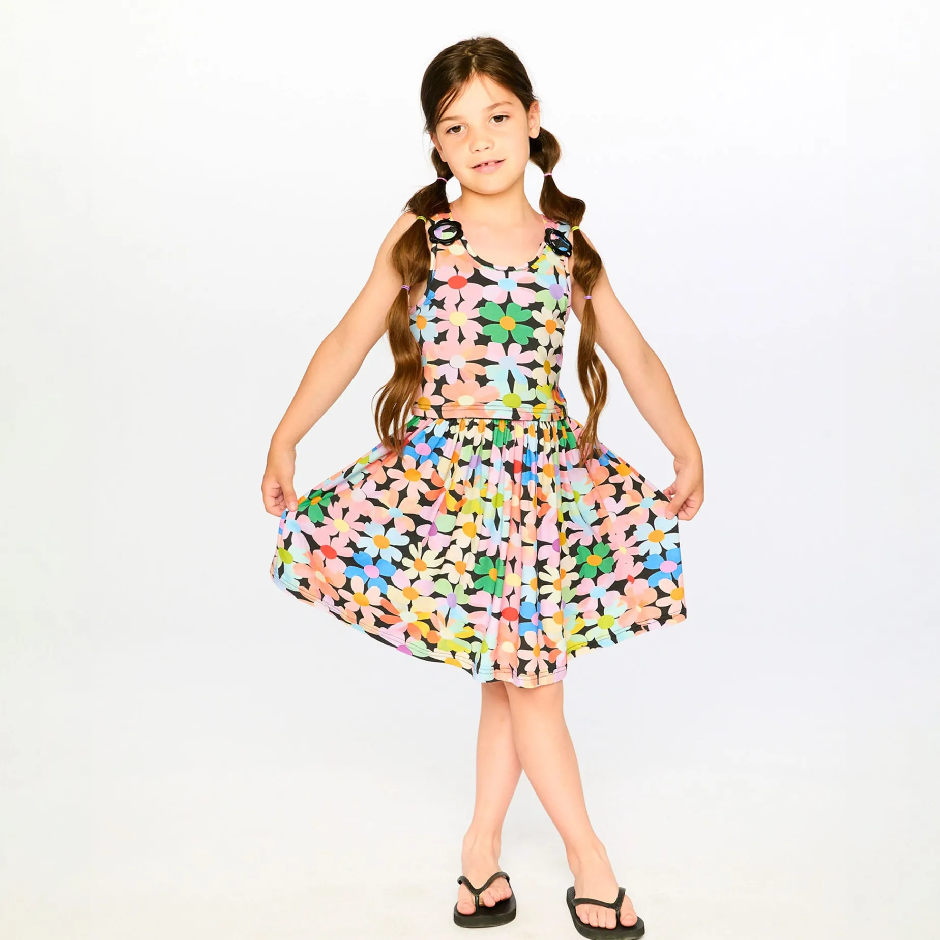 This dress bursts with charm thanks to its all-over colorful flower design on a black background. This sleeveless dress features playful shoulder straps with flower-shaped buckles and a softly gathered flowy skirt for a twirl-ready look. Made from breathable viscose with a soft polyester lining, it offers both comfort and style for sunny outings.