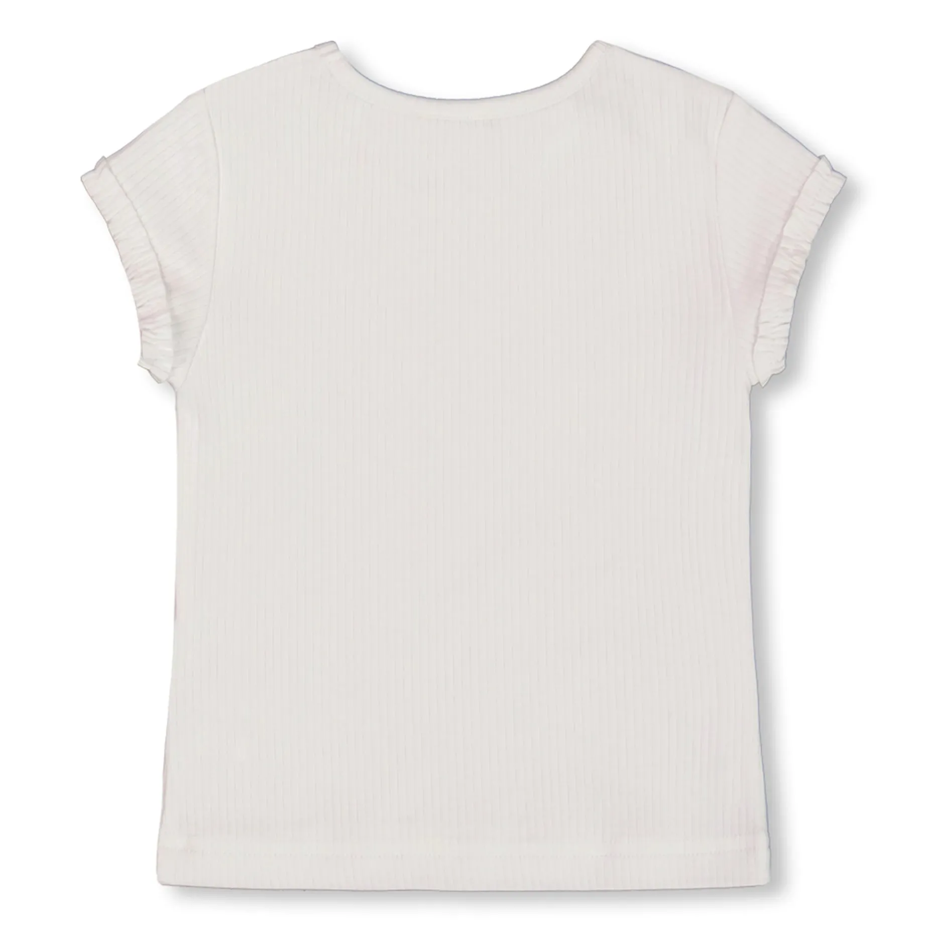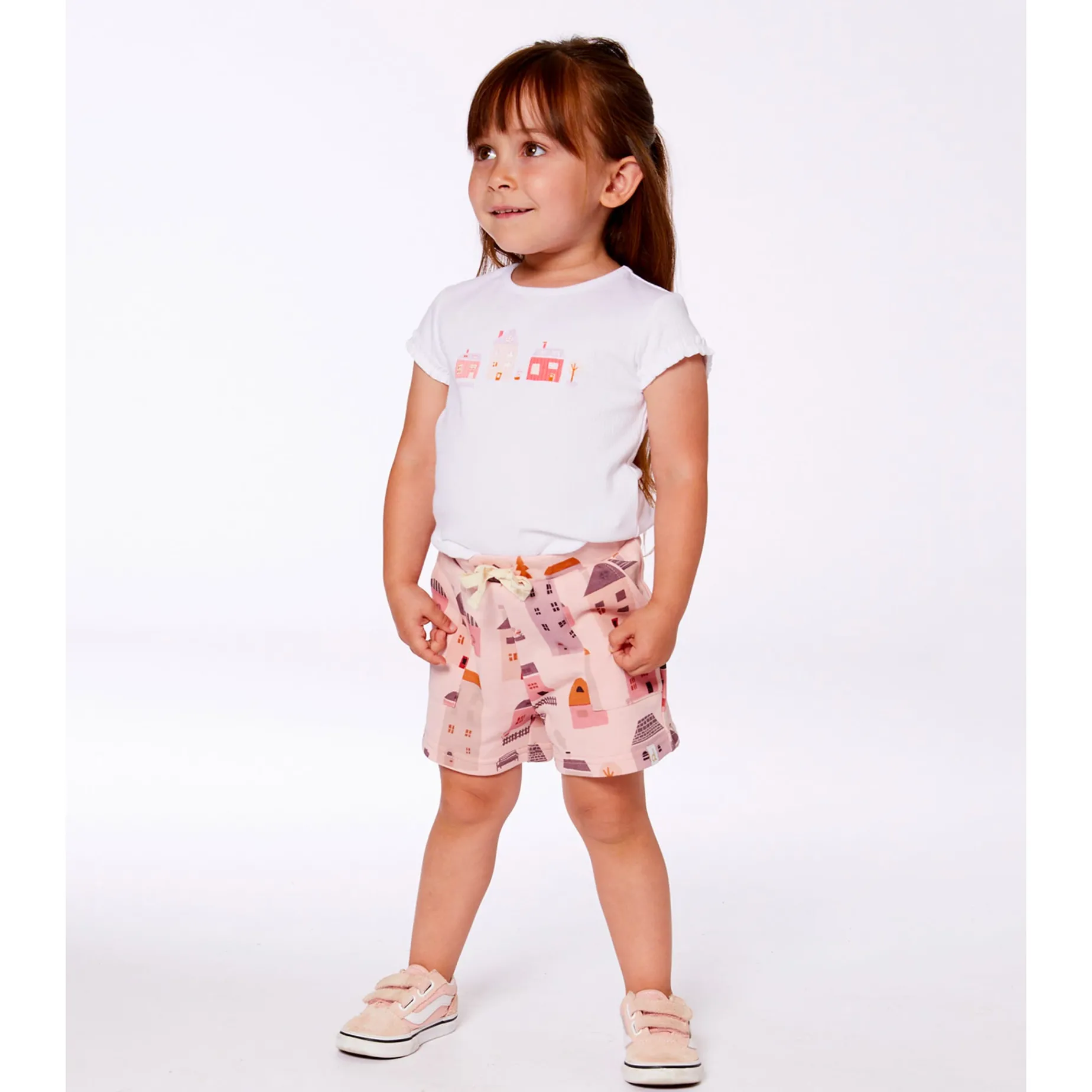 Its vertical ribbing adds subtle texture to our ribbed T-shirt with white print and pink houses. Very soft and comfortable to wear, this versatile t-shirt has a short-sleeved silhouette in stretch cotton with a round neck, gathered elastic sleeves and a house print on the chest. It goes perfectly with any bottom from our “La maison du Bonheur” collection!