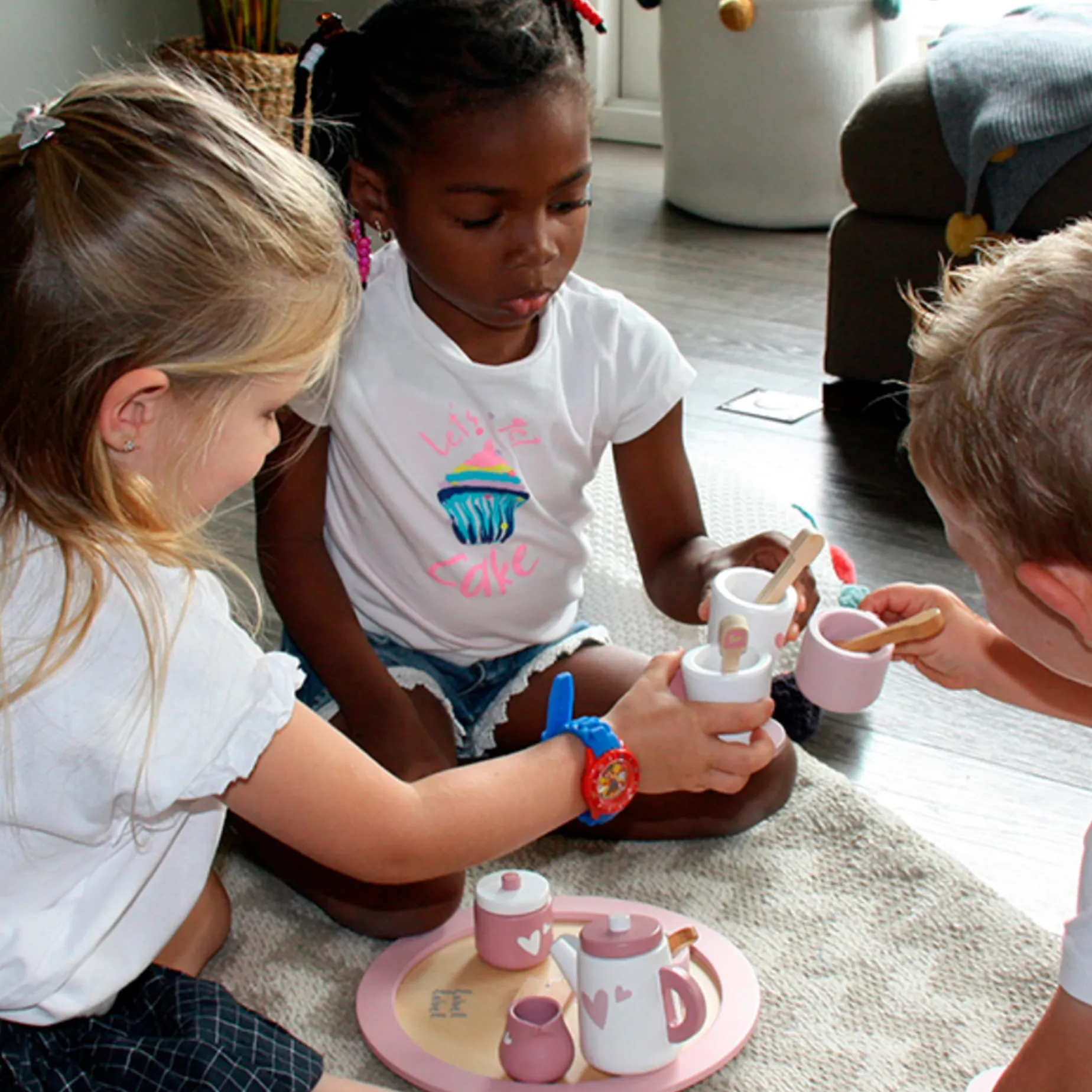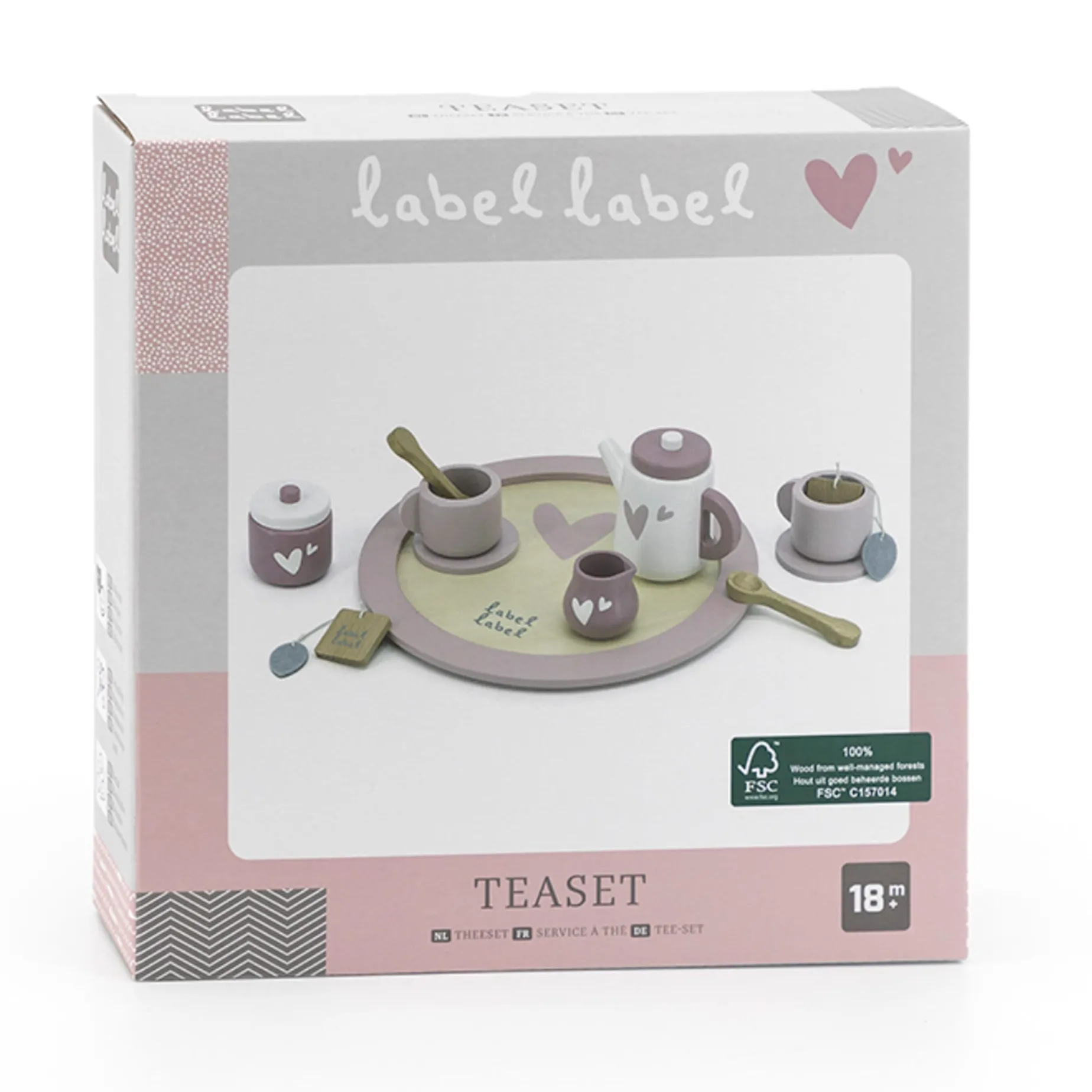 Such a cute tea set! Not only mom & dad, brother & sister, but also the dolls are being served with the most delicious home-made tea. And who knows… with some pastry. You will see the most cozy role-playing games. The set consists of a teapot, 2 cups + saucer, 2 spoons, 2 tea pouches, a sugar bowl and milkjug. Everything is served on a fabulous wooden tray, maybe a bit balancing in the beginning, but your little waitress will master this in no time. This festive occasion is the ideal complement for the fantasy game of each child. Both imagination and creativity are stimulated. Children will learn to interact with others while playing and practice logical reasoning and eye-hand coordination.Â
