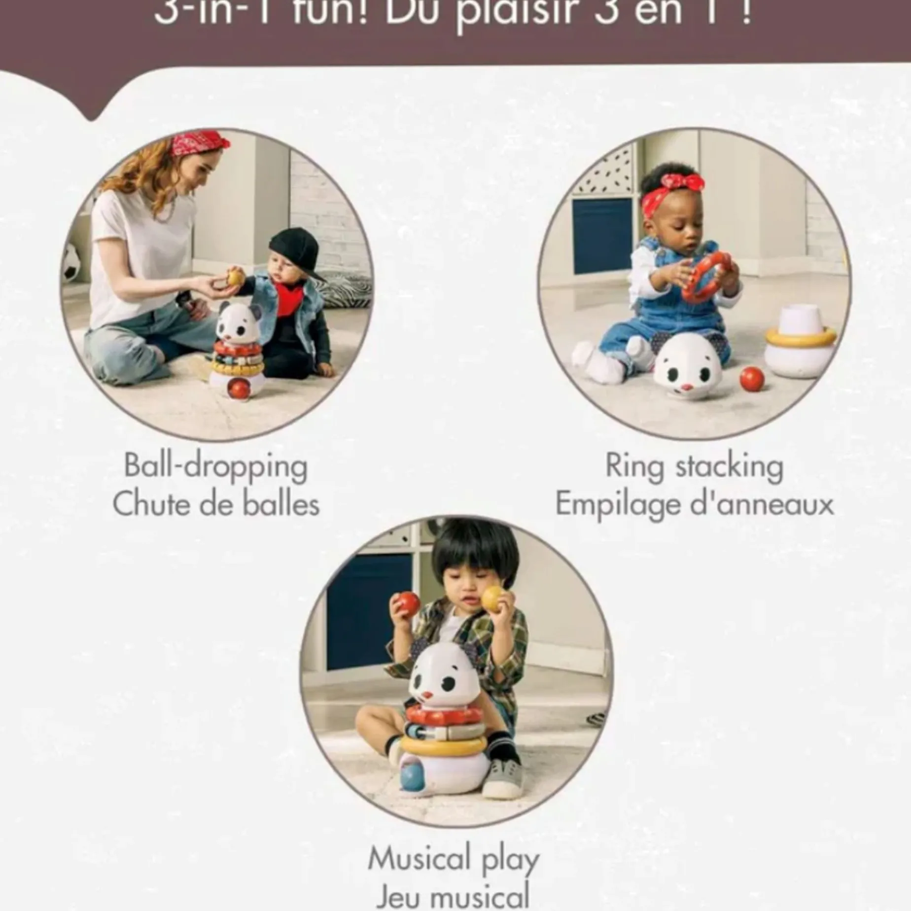 With its playful panda design, versatile features, and vibrant energy, the Tiny Rockers 3-in-1 Stacking Toy is the ultimate developmental toy for your baby. This 3-in-1 toy combines ball dropping, ring stacking, and freestyle musical play in one product. Providing little rockers with exciting audio and visual feedback through exciting lights and groovy sounds, this panda encourages babies to keep trying to drop the rattling balls into the funnel, improving their motor skills and advancing their cognitive abilities.