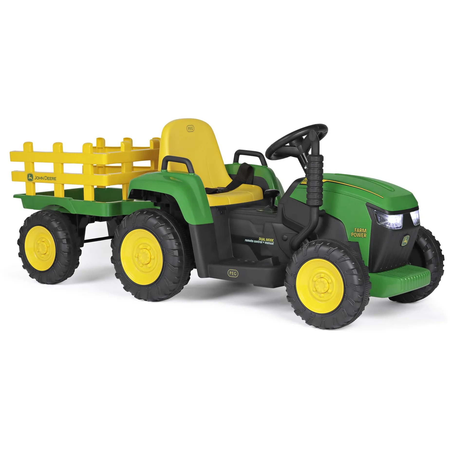The electric tractor with trailer driven by children and radio-controlled by adults! John Deere Farm Power is the electric tractor most desired by children and… adults. From 1.5 to 3 years, the tractor can be driven by an adult via radio control; from 3 years, it can be driven by children for fantastic adventures. The electric tractor travels at great speed thanks to the power of the 2-wheel drive with a total of 70W with sculpted tread wheels.