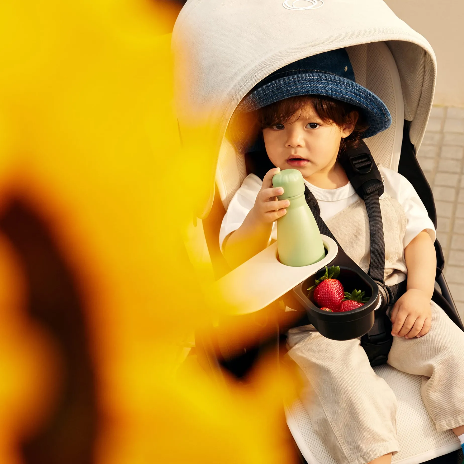 The Bugaboo snack tray is the stroller essential for your toddler’s food and drinks on the go. Featuring a snack compartment with a slide-open lid and a large cup holder.