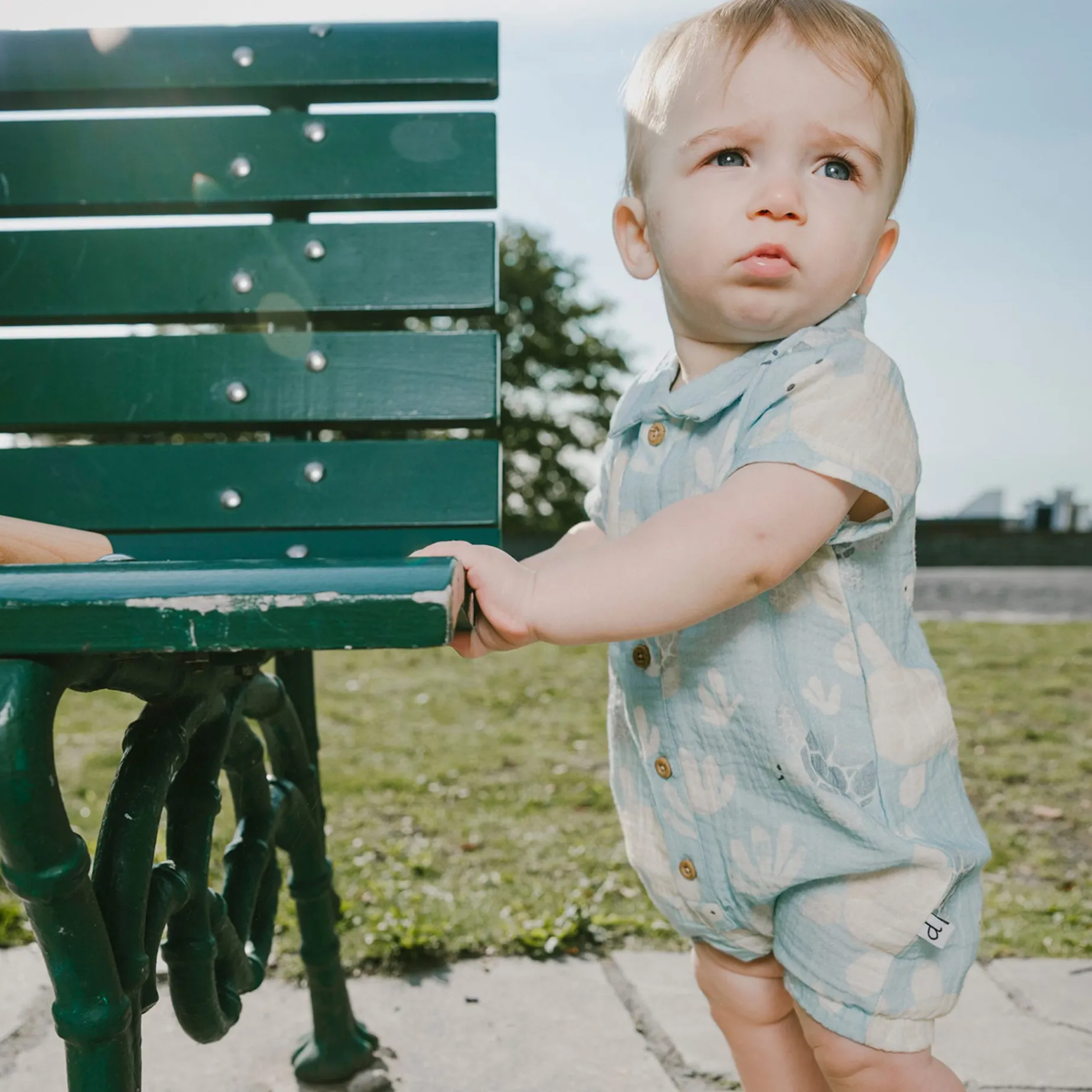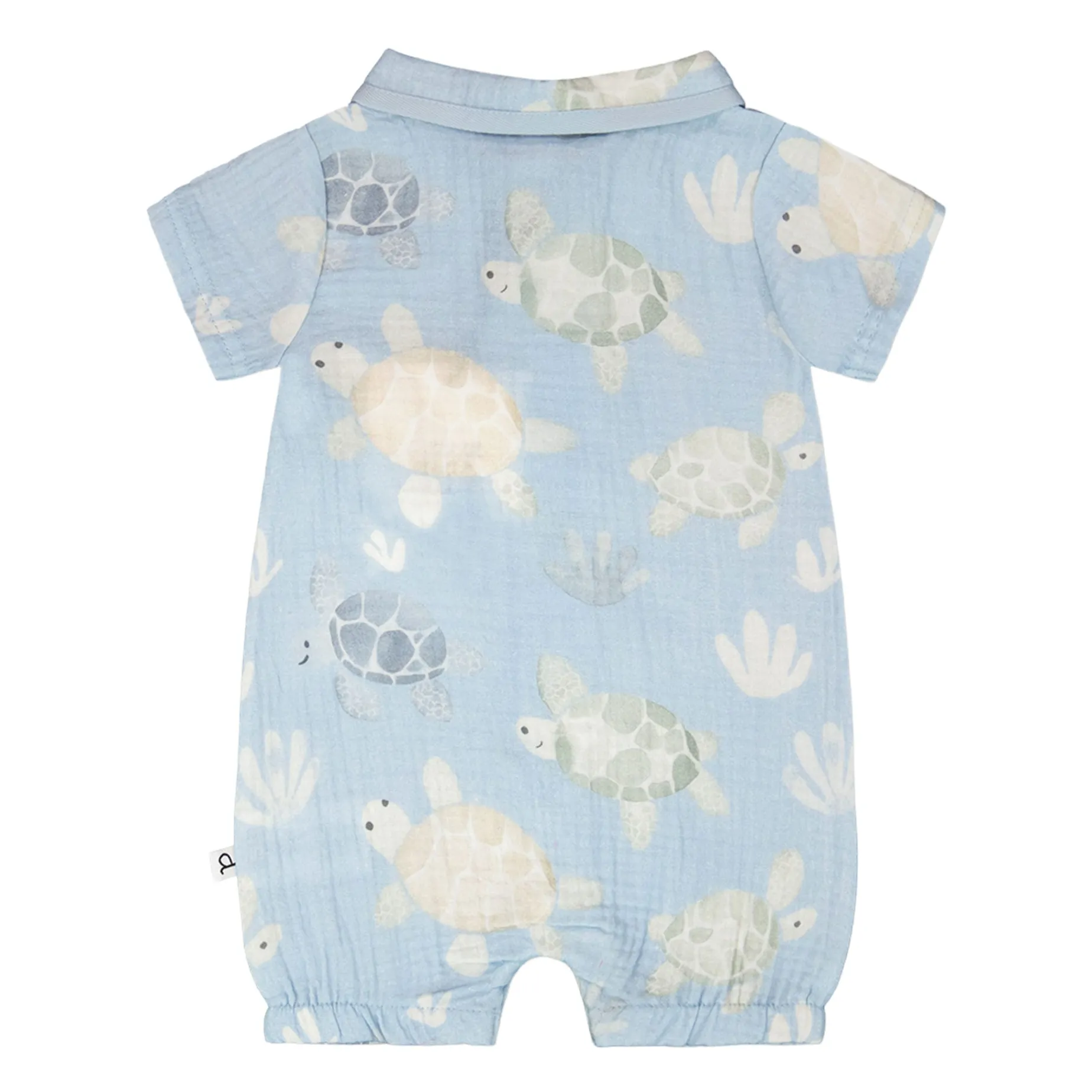 Light and breezy, this muslin romper blue with turtle print is perfect for sunny days and playful outings. This short-sleeve one-piece features a smart shirt collar, wooden-effect buttons down the front, bottom snap closure and a comfortable fit for your little boy. Soft cotton muslin makes it breathable and gentle against delicate skin.