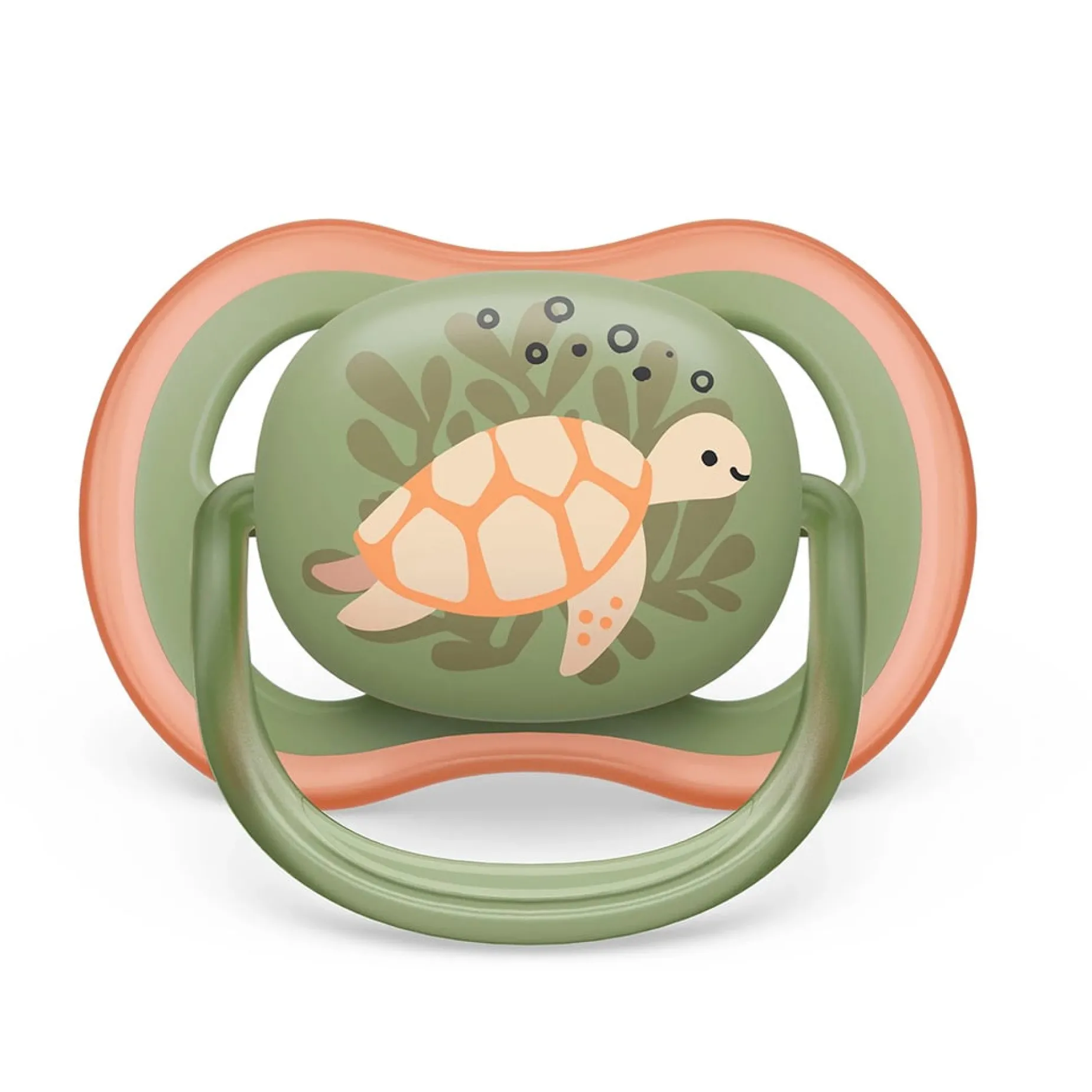 The Philips Avent Ultra Air pacifier for babies 6-18 months is designed with a lightweight, breathable shield for baby’s sensitive skin.