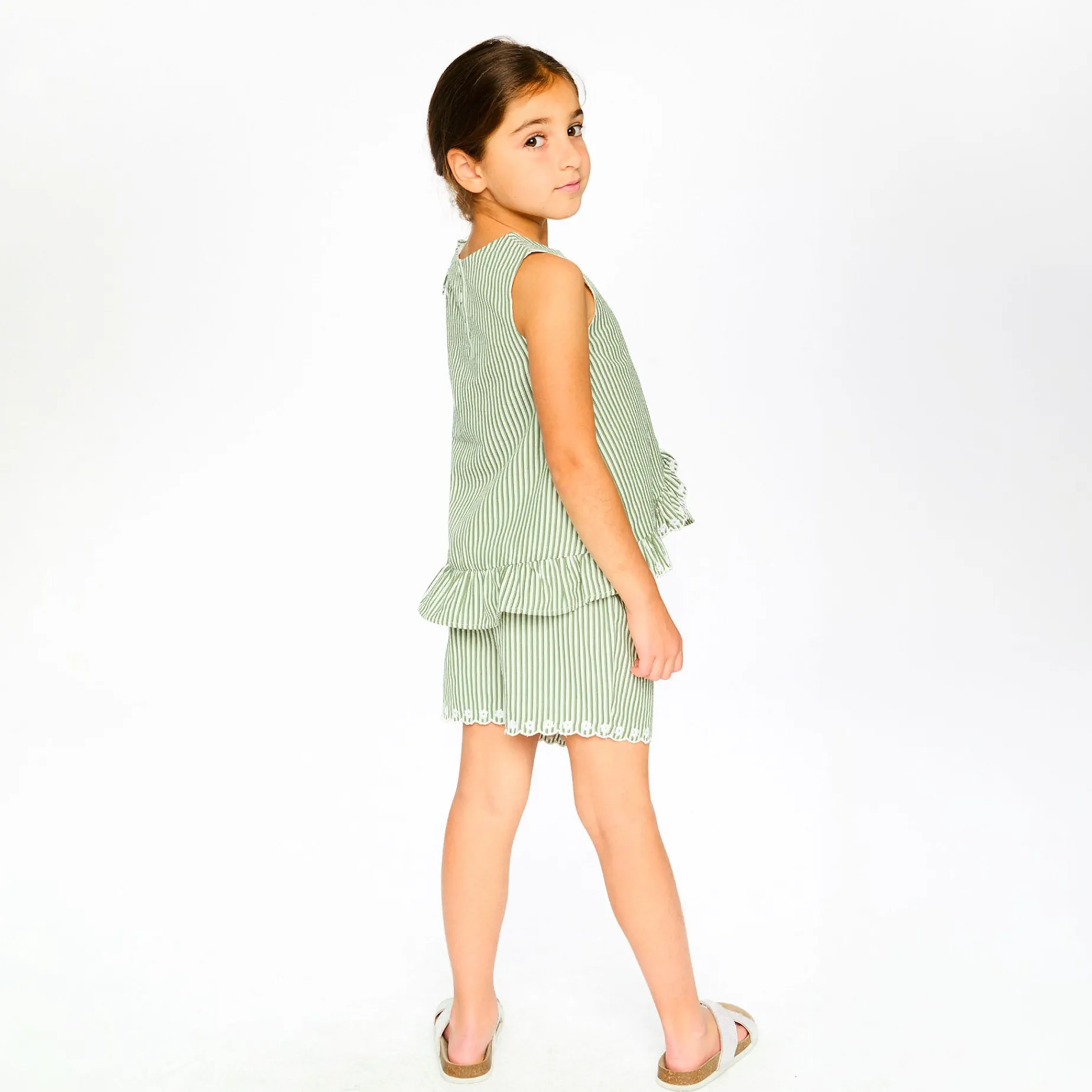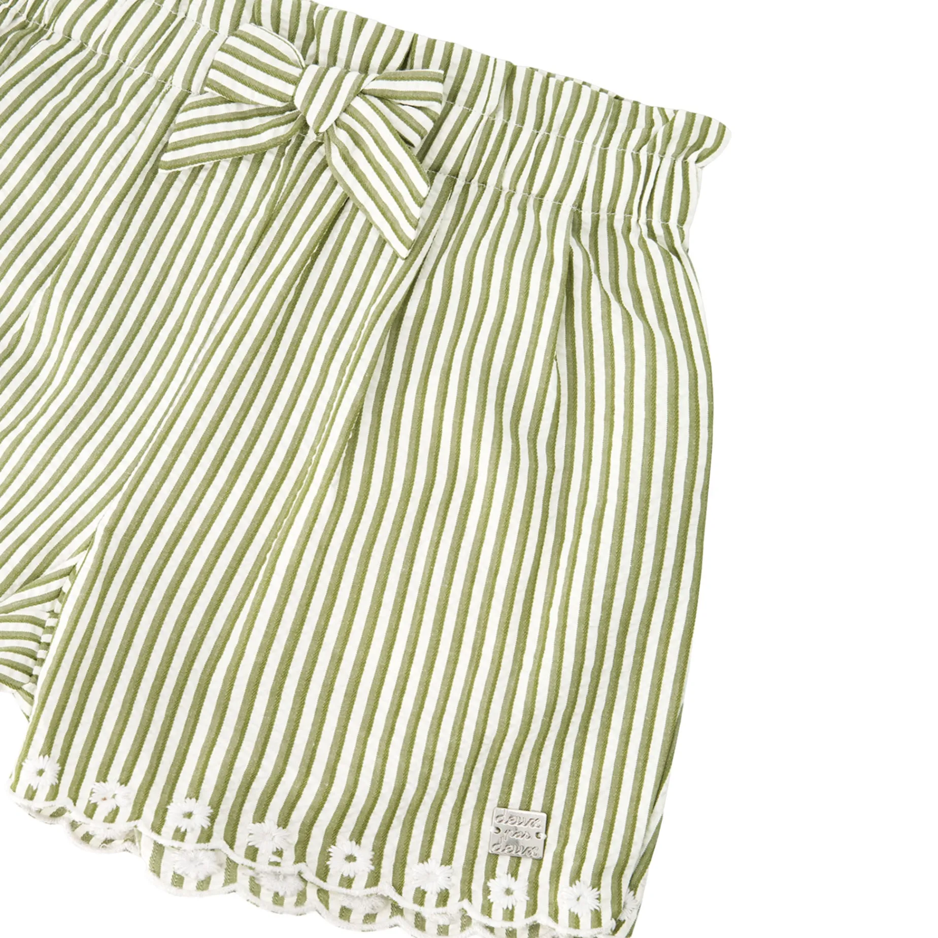 The shorts in green and off white stripes with embroidery bring a chic twist to casual wear. These bottoms are designed with delicate embroidered bottom hems, an adjustable tie at the waist, and a breezy striped fabric that gives both comfort and style. Made from a soft polyester and cotton blend, they are ideal for pairing with any top from the “Under My Straw Hat” collection.
