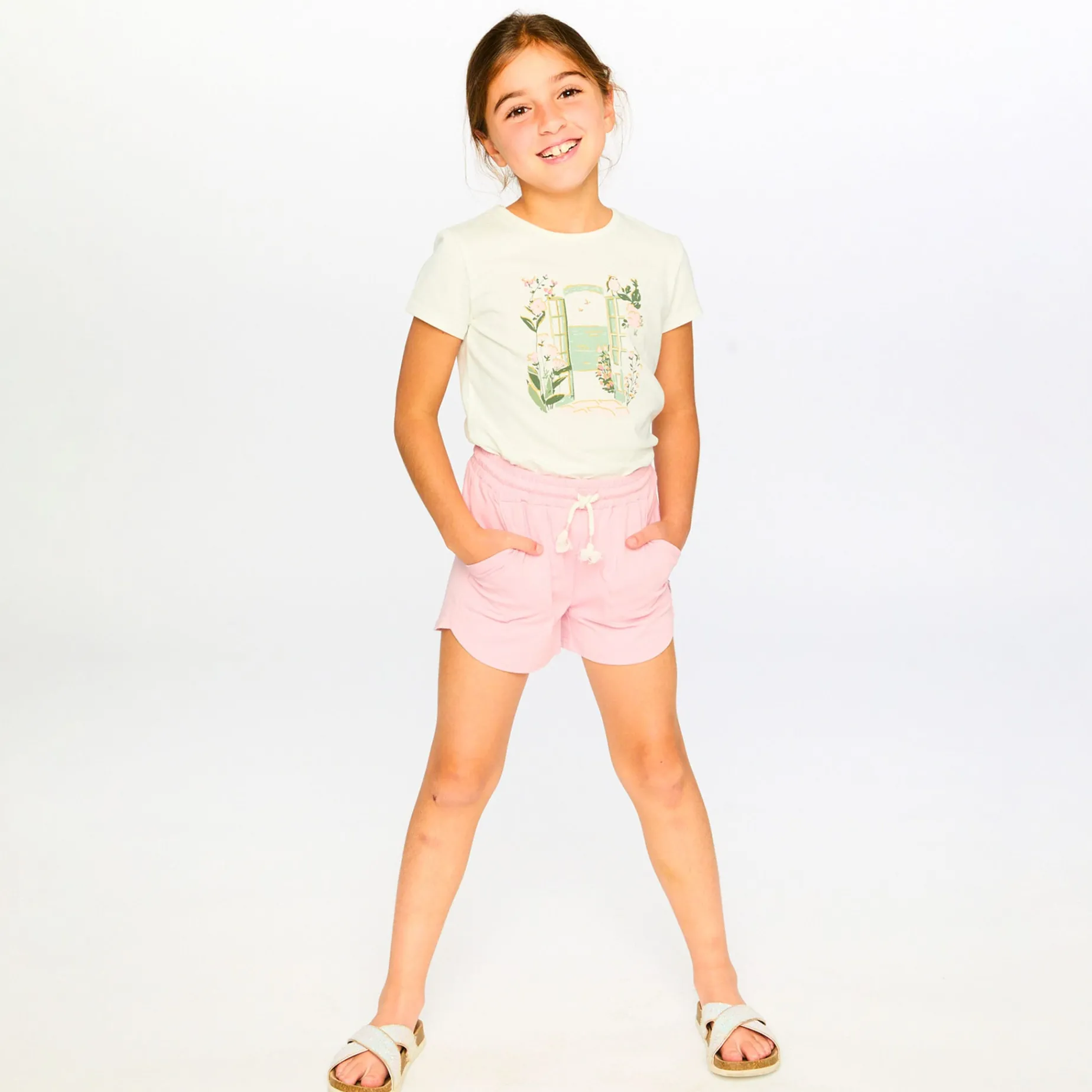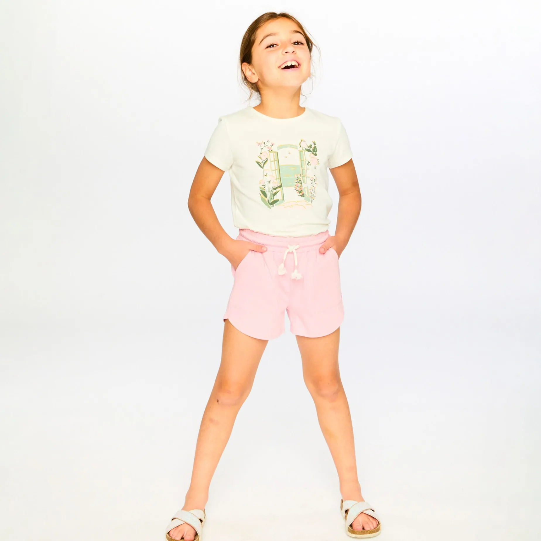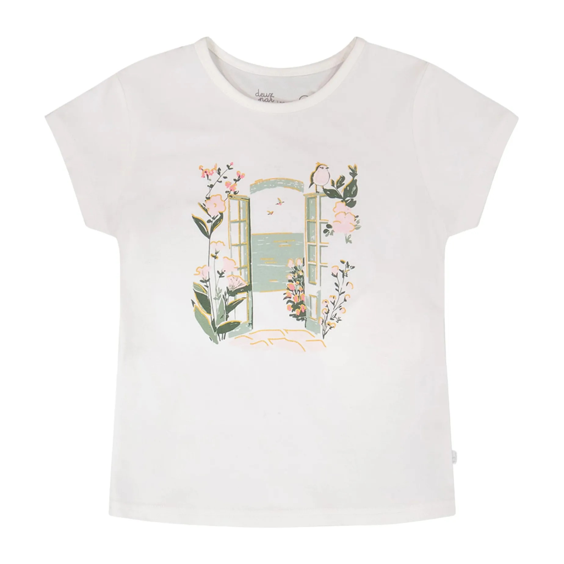 Our organic cotton jersey t-shirt in off-white is a soft and playful piece for warm-weather days. This tee features a straight cut with short sleeves, a round neckline, and a dreamy window-and-garden print on the chest. Made from organic cotton with a touch of stretch, it offers natural comfort and ease for everyday adventures.