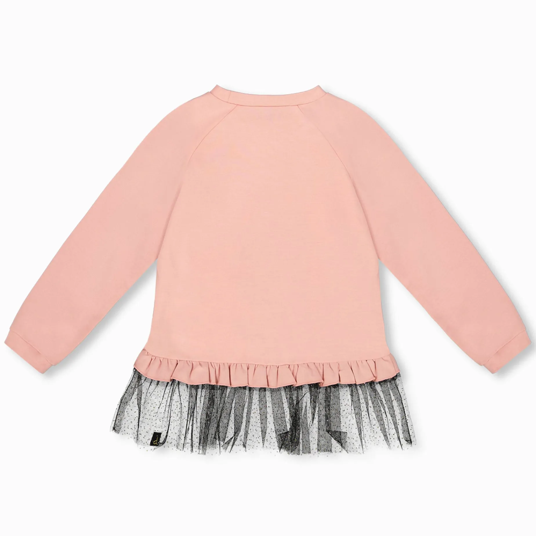 The Long Bi-Material Top Dusty Pink With Mesh Ruffle Hem and Leopard Print brings fun and flair to everyday dressing. This long t-shirt is made from soft organic cotton jersey with a lightweight mesh ruffle hem at the bottom, raglan sleeves, and a dazzling leopard graphic on the chest. With its extended length and flouncy finish, it’s perfect for pairing with leggings for a playful yet polished look.