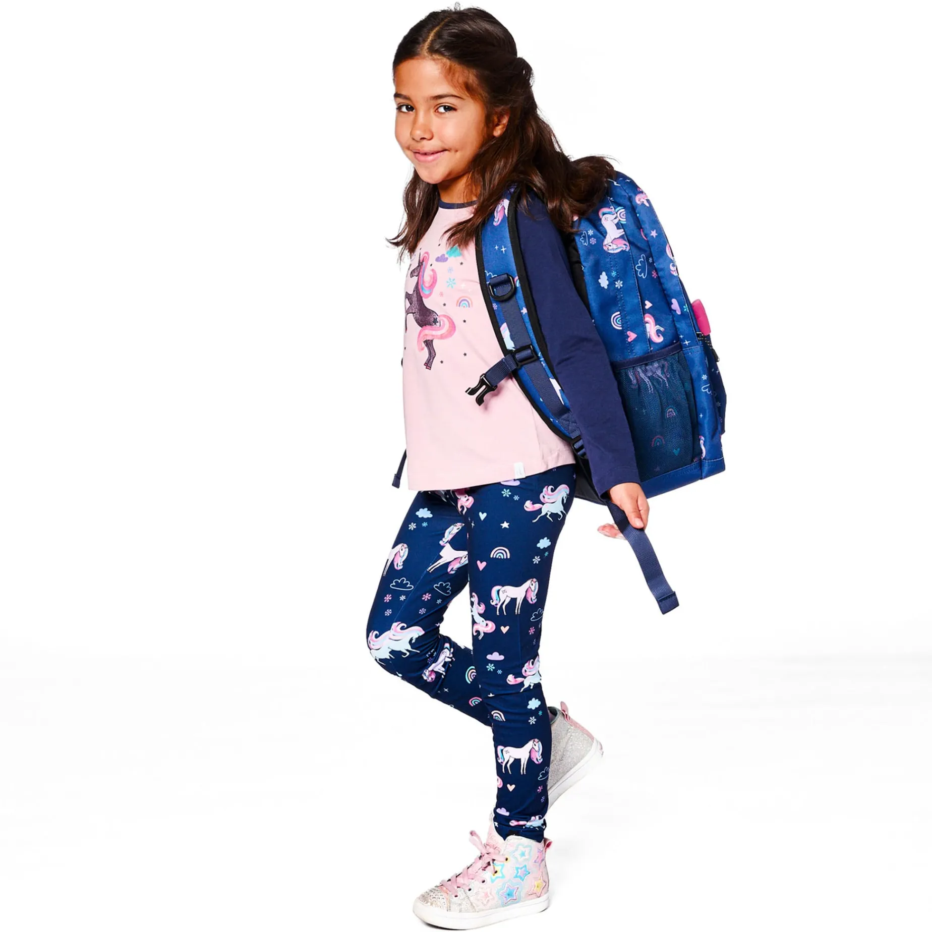 A whimsical unicorn and rainbow print makes these stretch pants a fresh, fun addition to any little girl’s wardrobe! In stretch jersey fabric, these leggings feature an easy pull-on fit with a comfy elastic waistband, a logo label at the hem, and an eye-catching allover print. Team with a matching dress or a coordinating tee to create a variety of playful looks!