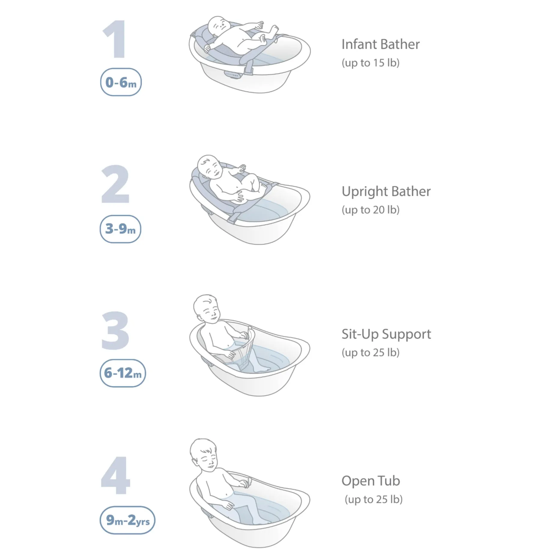 4 Grow-With-Baby Stages: Infant Bather (0-6m; up to 15 lbs/7 kg; Upright Bather (3-9m; up to 20 lbs/9 kg); Sit-up Support (6-12m; up to 25 lbs/11,5 kg); Open Tub (9m-2yrs; up to 25 lbs/11,5 kg)