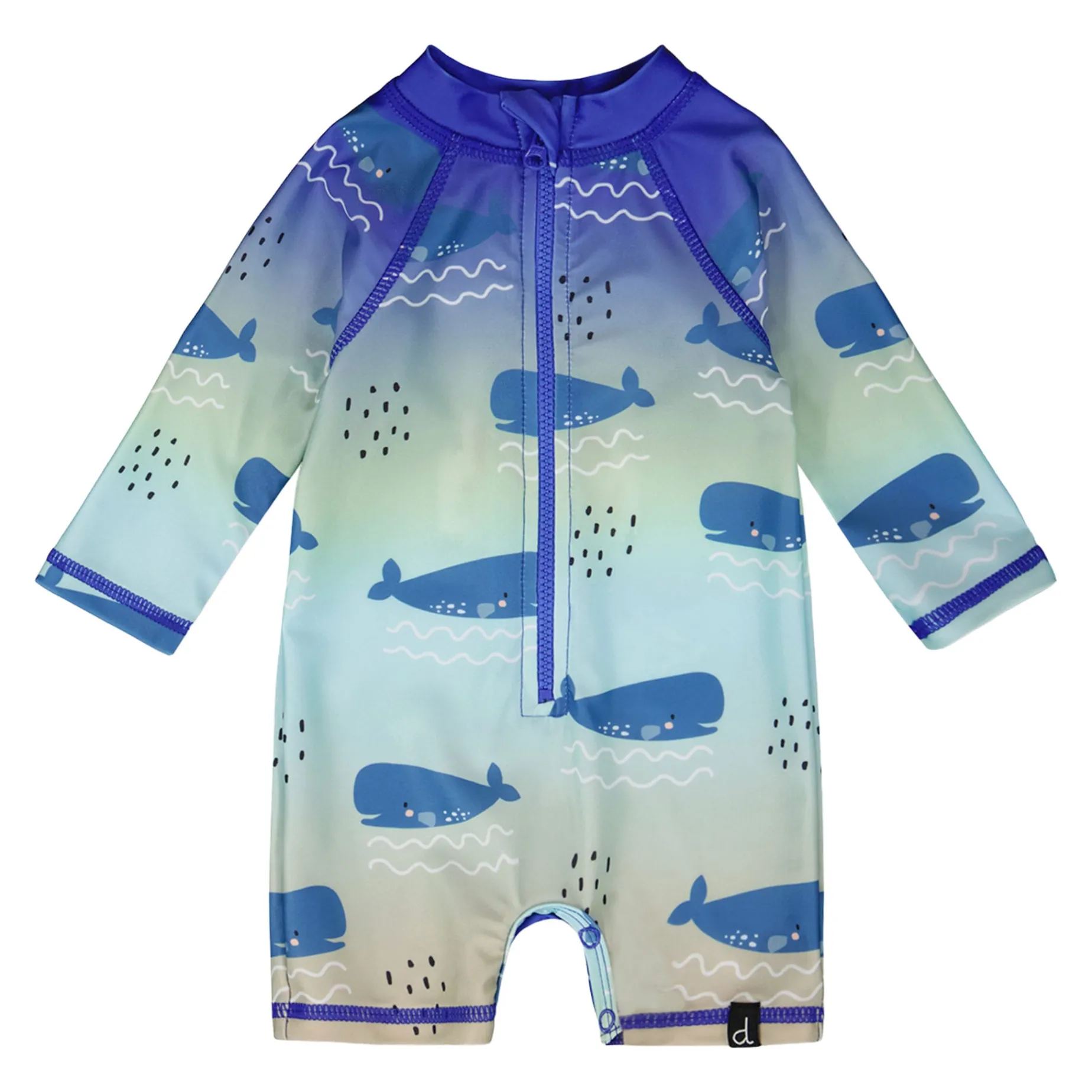 Our baby and toddler one-piece long sleeve rashguard in blue with whale print makes a splash in summer style. This one-piece swimsuit features long sleeves and a playful allover whale pattern in shades of blue, made from recycled polyester with added stretch for comfort and easy movement. A front zipper makes dressing simple while providing extra protection under the sun for boys and baby boys.