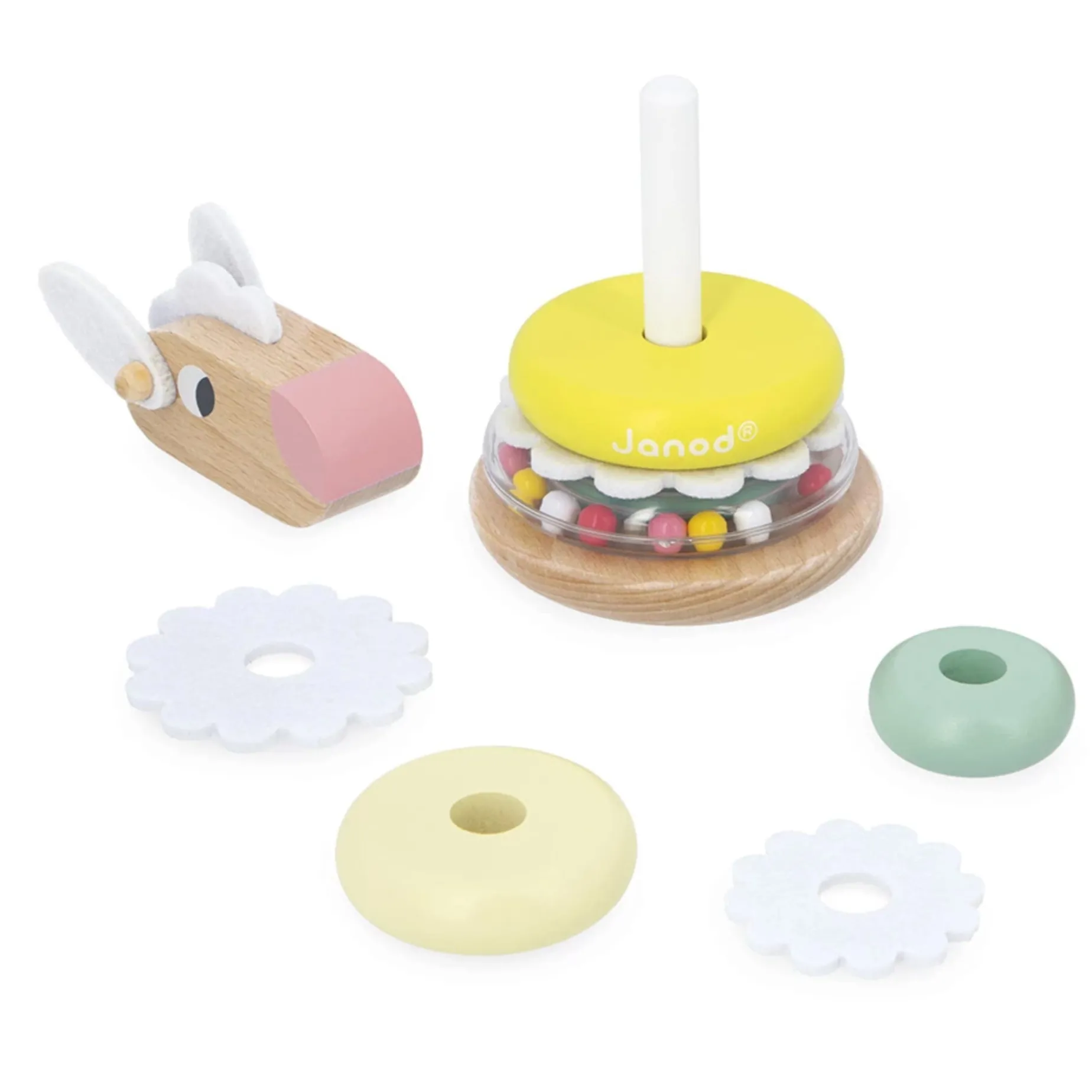 One piece, two pieces… the sheep takes shape again! With this stacking sheep, children as young as 1 year old discover the joys of building, while developing their motor skills and hand-eye coordination. The child gradually assembles each piece: the transparent ring filled with colorful beads, the wooden rings, the felt elements to insert, and finally the sheep’s head. Once the toy is fully stacked, they can shake it to make the beads move inside the ring, adding a sound and sensory dimension to the game. But that’s not all! The sheep also transforms into a roly-poly toy thanks to its rounded base: it rocks gently without ever falling over. An activity that extends the fun! This stacking sheep is from the Zigolos range: a joyful and colorful collection with playful shapes, designed to awaken the senses and accompany toddlers in their first discoveries. This developmental toy is made with FSC™ certified wood and water-based paint.