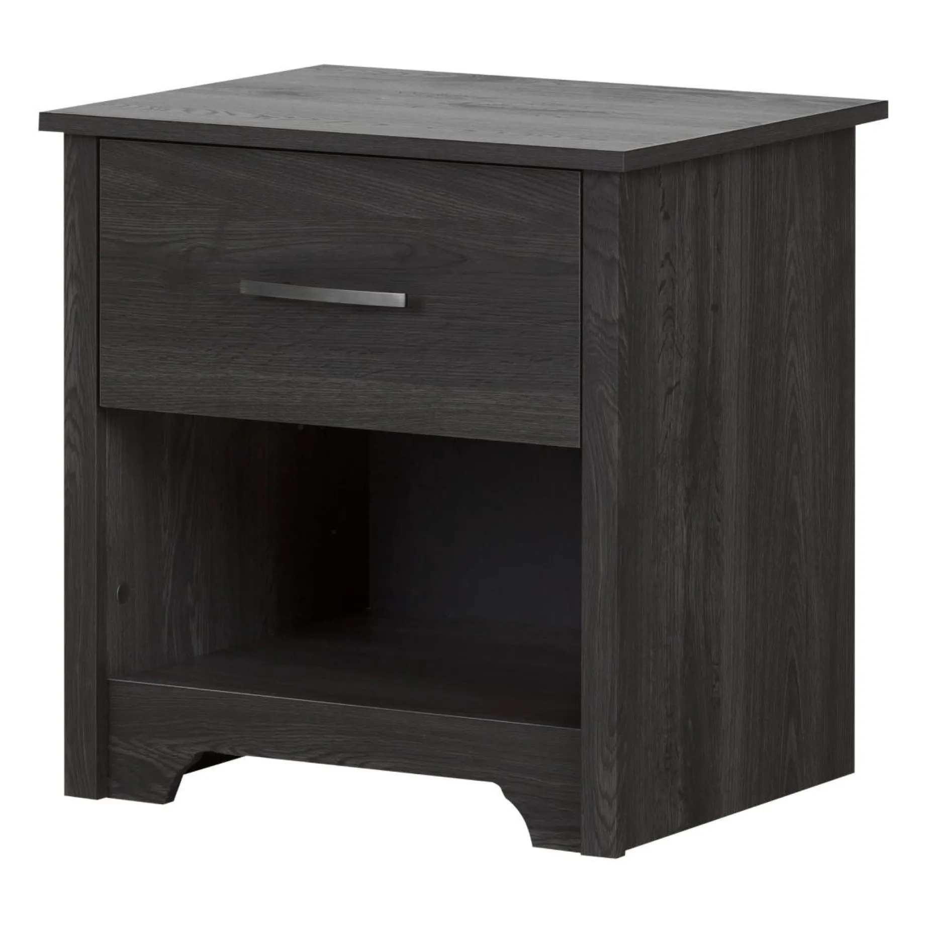This nightstand with a cutout kickplate will give your bedroom a contemporary and distinguished look. In order to maximize bedside storage it features an open storage space and a drawer decorated with an elegant metal handle. With a sturdy table top suitable for a lamp, cell phone and books, the bedroom cabinet meets all your storage needs.