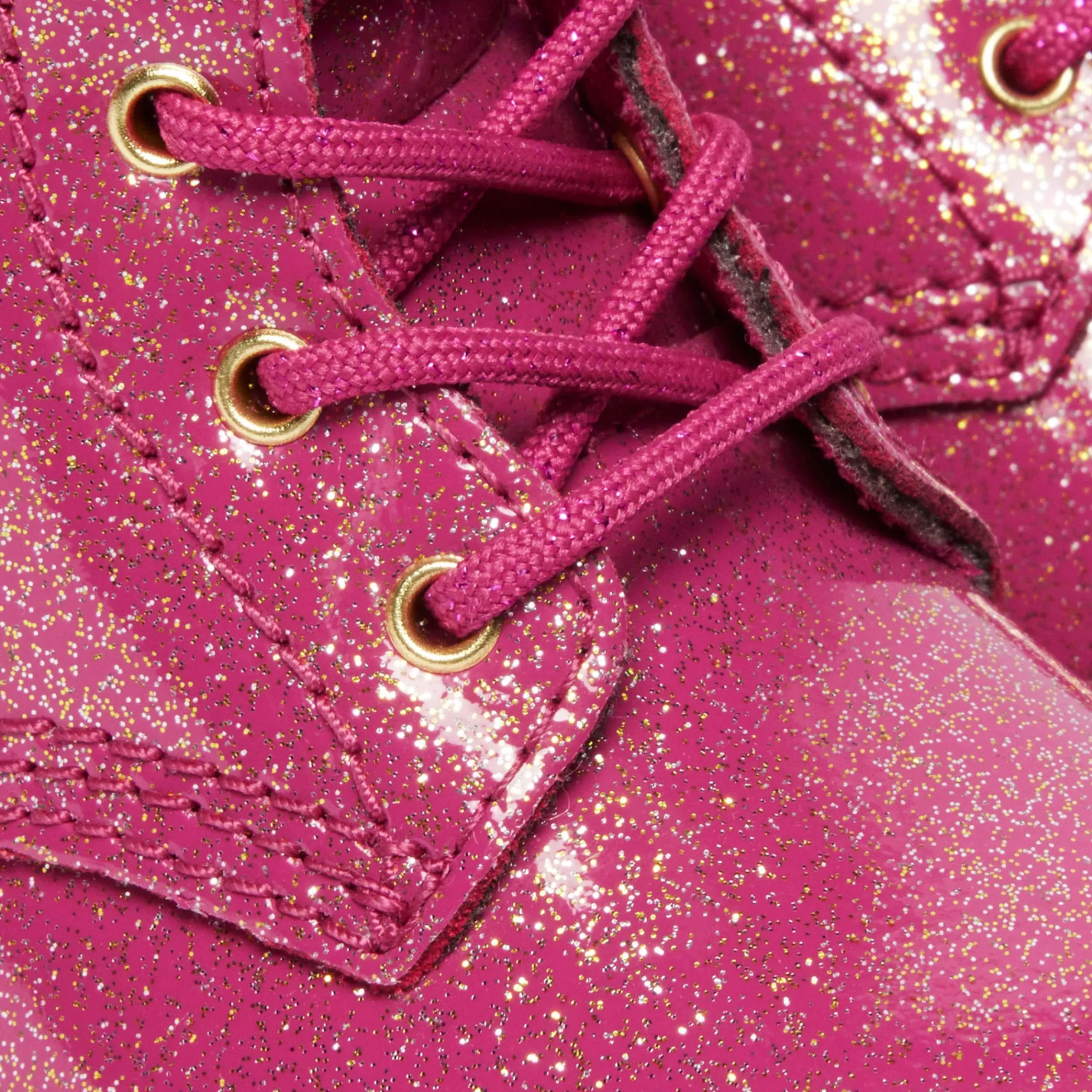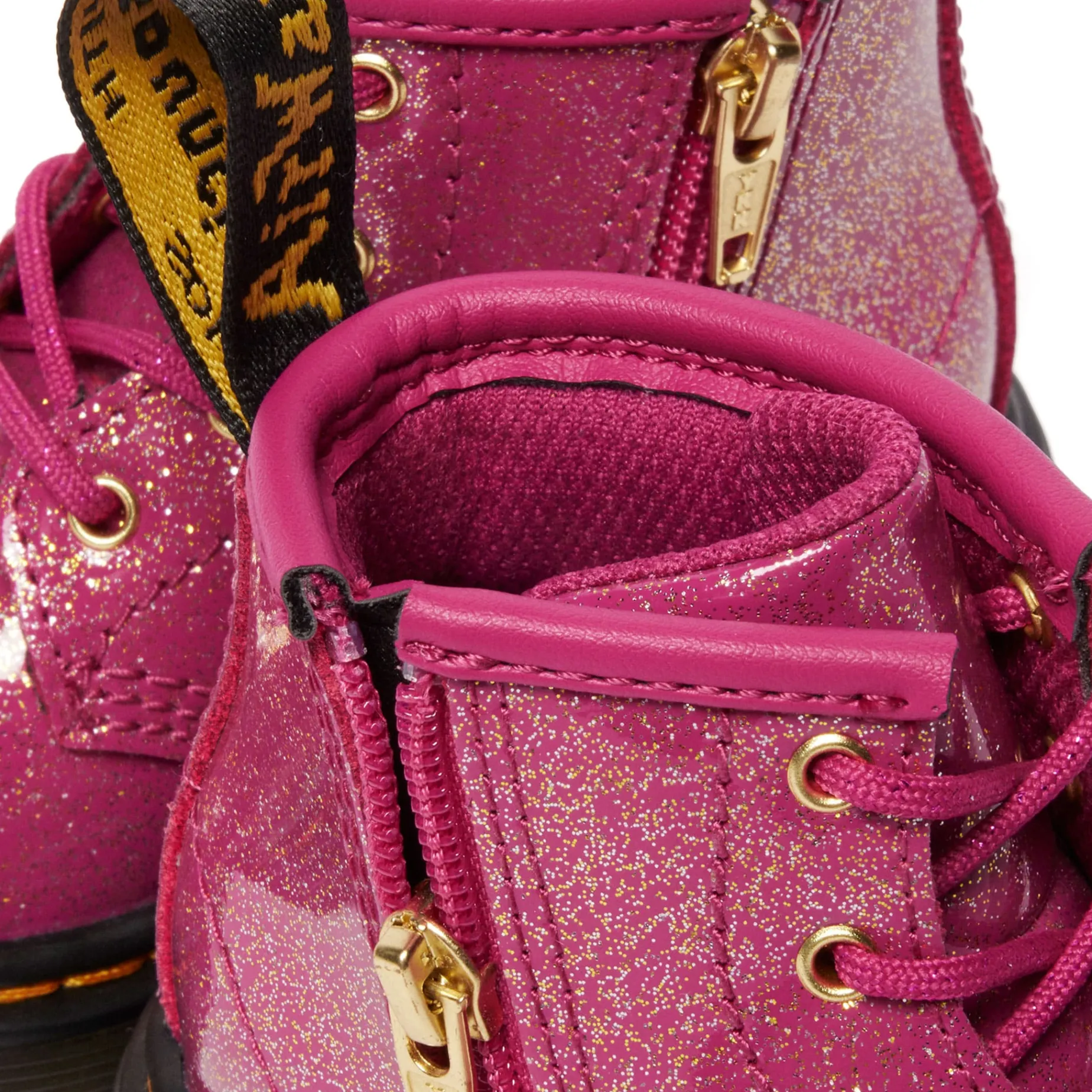 The original DM’s boot — glittered for tiny feet. This revamped design is built for personalities that shine early on. Using Nebula Glitter, a classic patent leather with a high-shine finish and a sparkle effect. The silhouette has all the signature 1460 8-eye boot features you’d expect: a scripted heel loop and yellow faux welt stitching. Along with shiny silver eyelets, an inside zip and a cemented smoke DMS Kids sole.