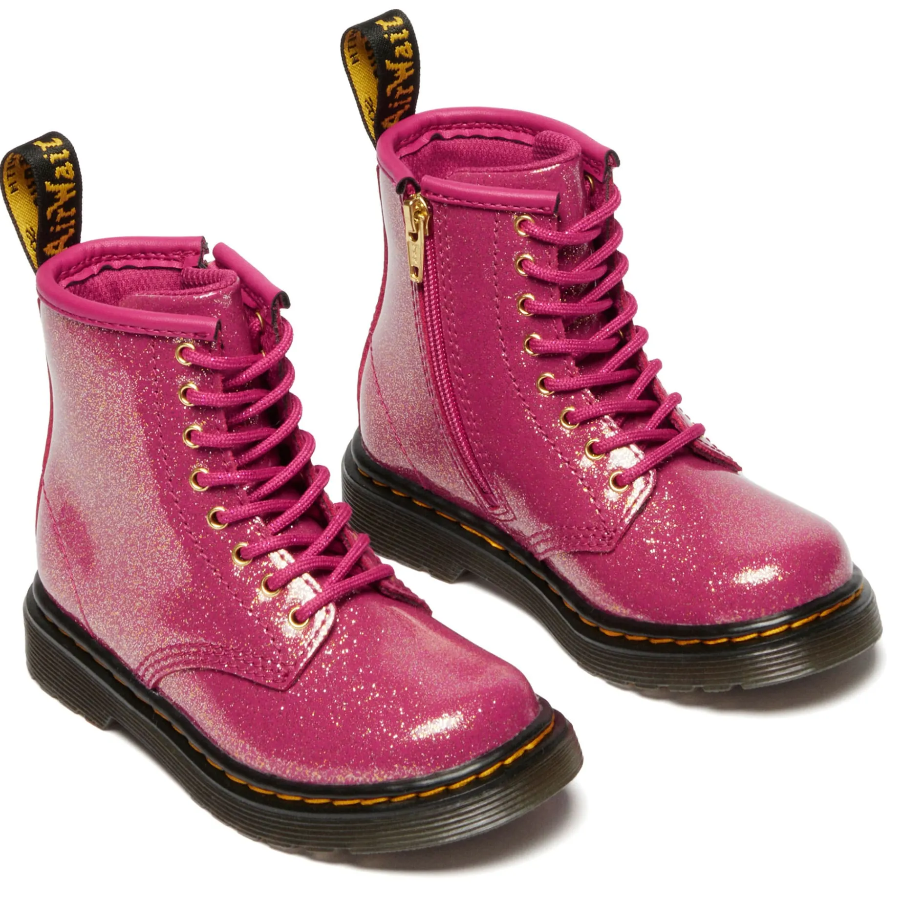 The original DM’s boot — glittered for tiny feet. This revamped design is built for personalities that shine early on. Using Nebula Glitter, a classic patent leather with a high-shine finish and a sparkle effect. The silhouette has all the signature 1460 8-eye boot features you’d expect: a scripted heel loop and yellow faux welt stitching. Along with shiny silver eyelets, an inside zip and a cemented smoke DMS Kids sole.