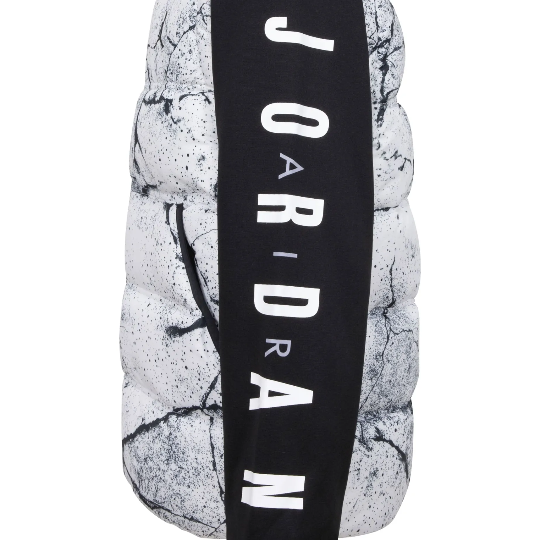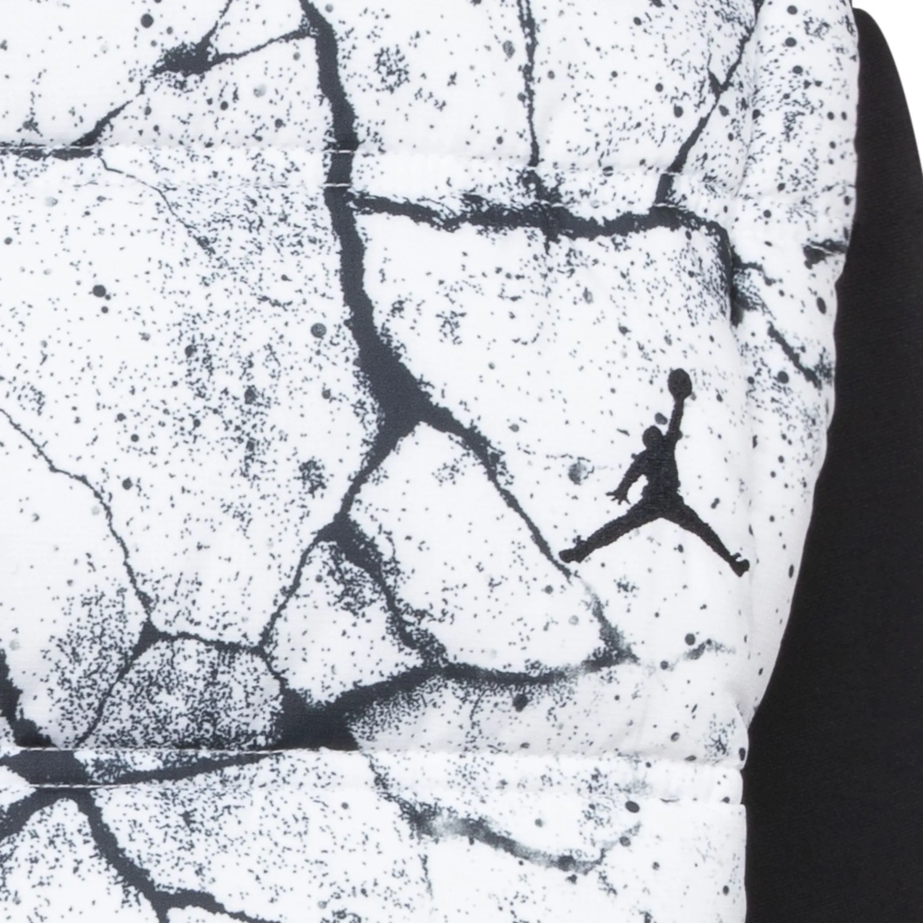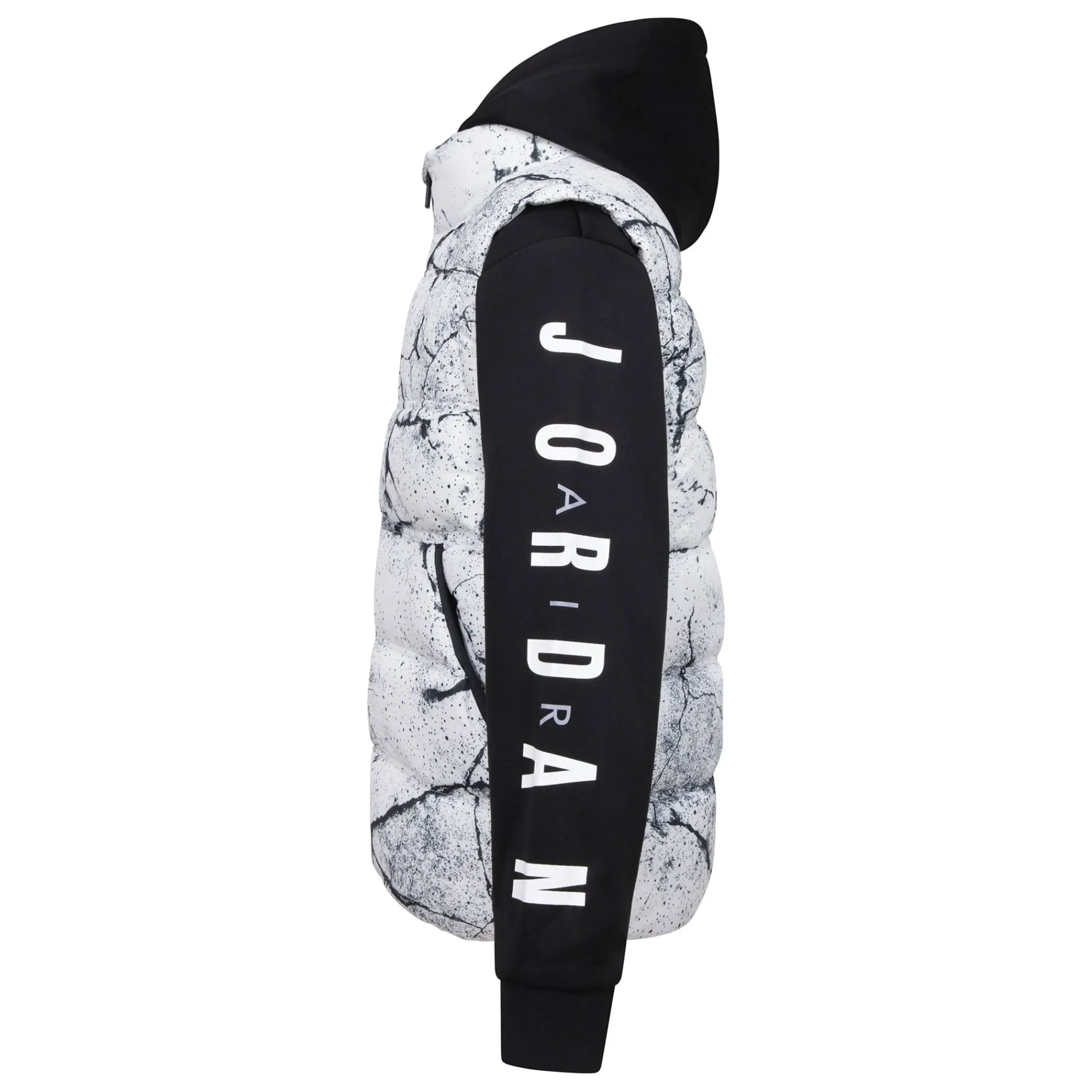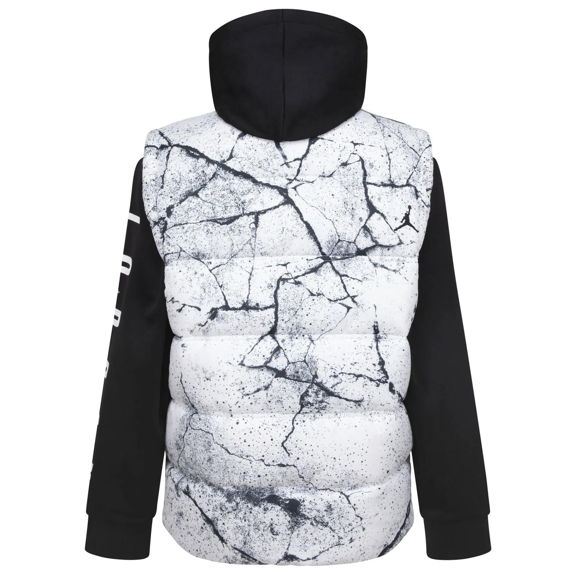 This Jordan jacket has the look of a vest layered over a hoodie. The vest is made of woven poly ripstop fabric and filled with soft faux down for a cozy feel. It has a full-zip closure and pockets at the sides to stash small items or help keep their hands toasty and the water resistant finish helps them stay dry in light rains. The hood and sleeves are made of soft poly fleece enhanced with heat-retaining, quick-drying, moisture-wicking Therma-FIT technology to help them stay comfy in cooler weather.