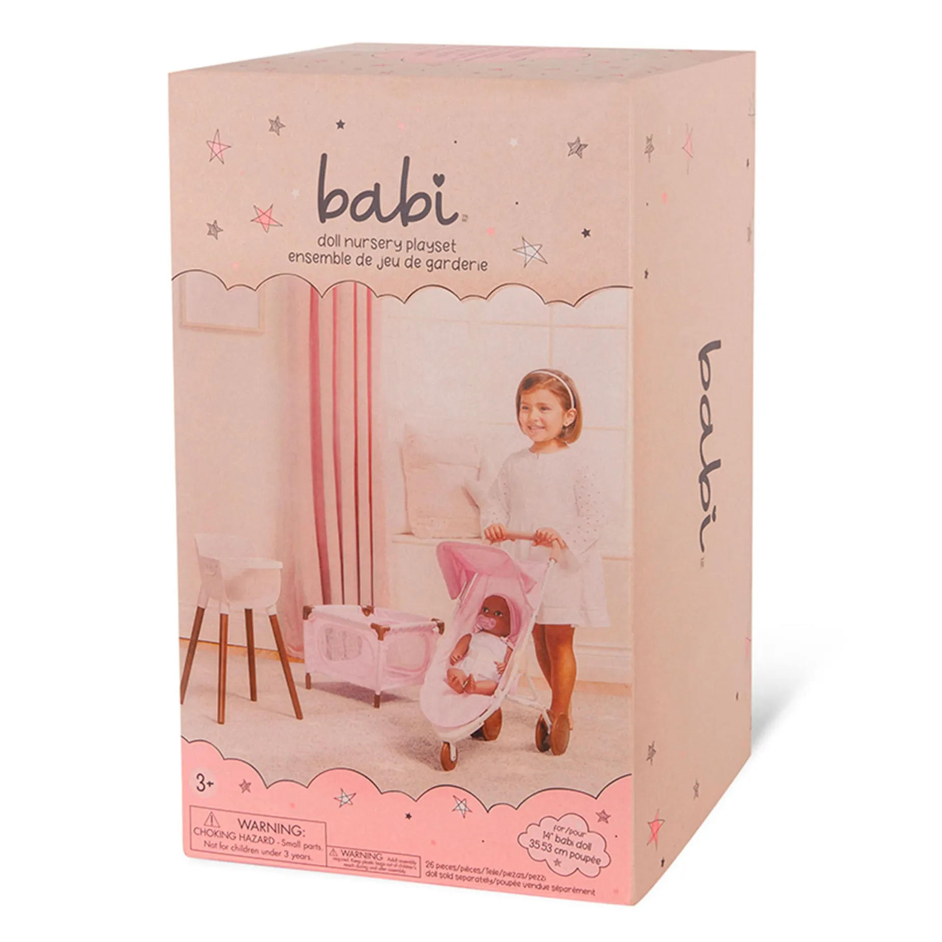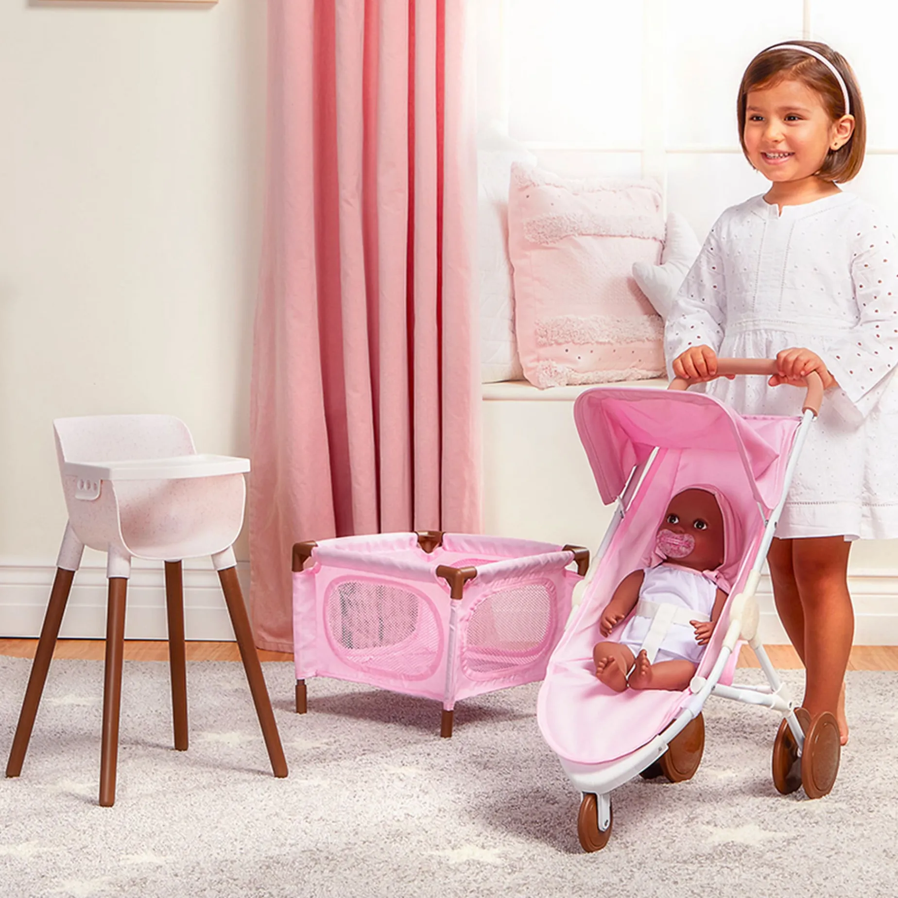 -This doll nursery playset includes: 1 stroller, 1 high chair and 1 playpen