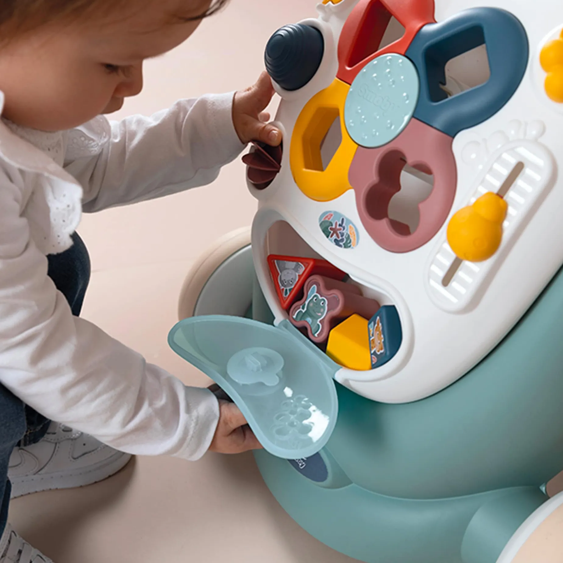-3in1 product: walking aid, detachable activity board, and pushchair.