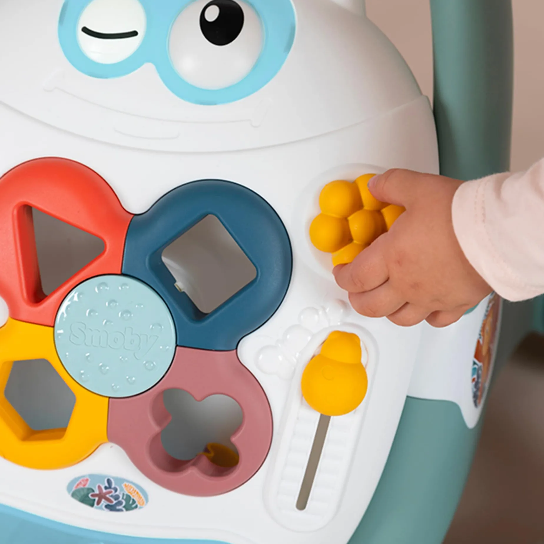 -Several activities: Shape sorter, Cric crac ladybird, Spining eyes, Wheel, Horn, Flower to turn, Mirror door and more!