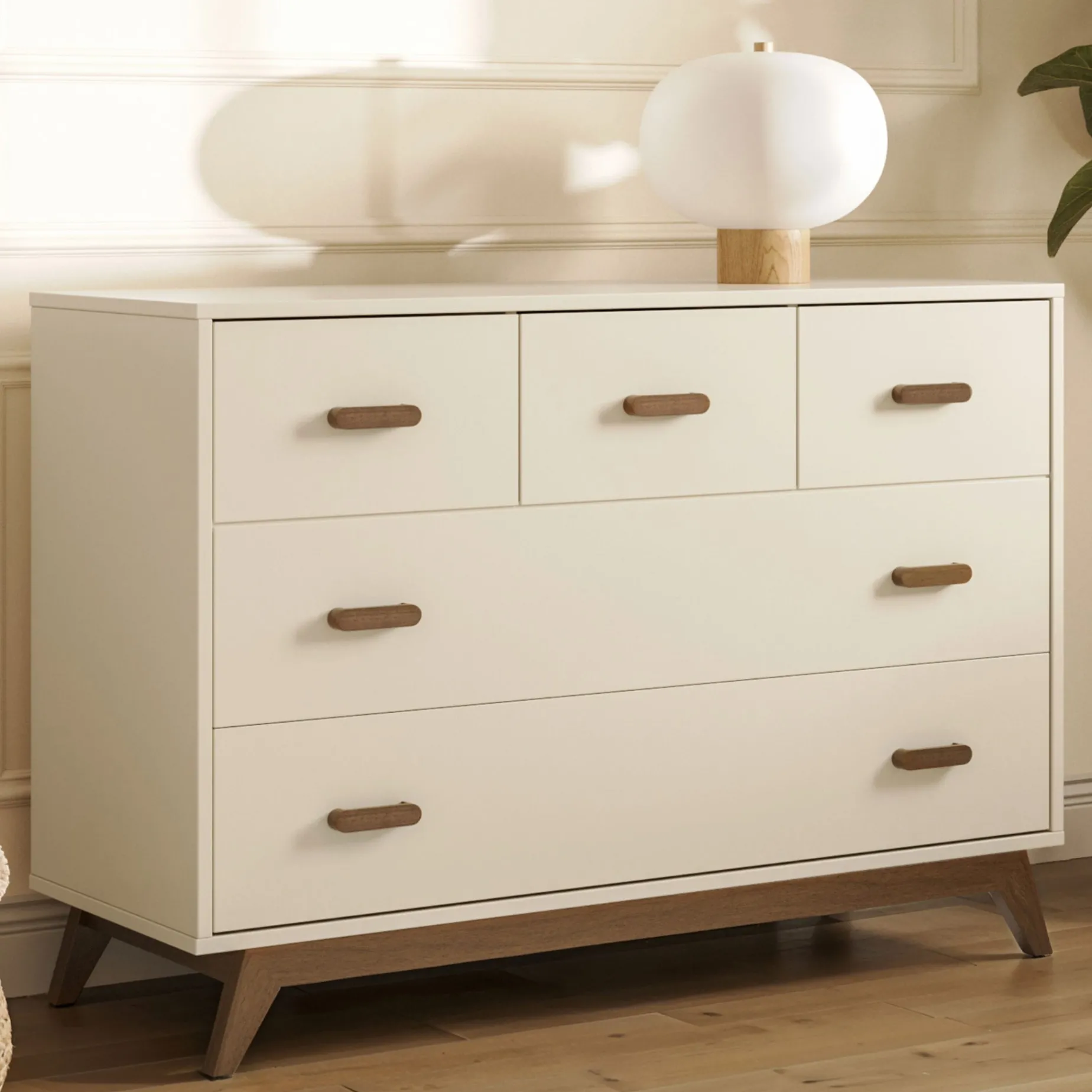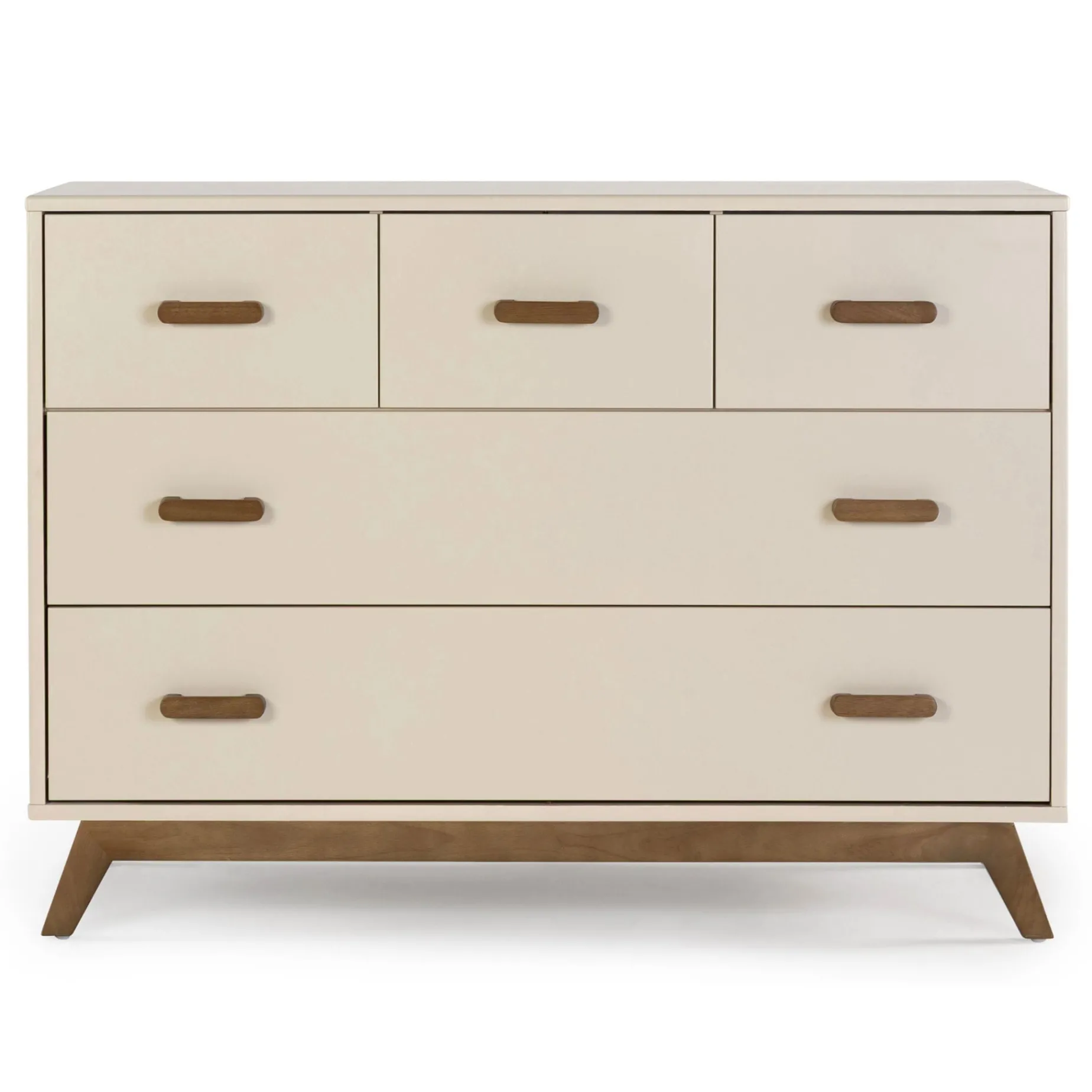 The 47” modern Soho 5-drawer Dresser’s classic style pairs perfectly with the Soho 3-in-1 Crib, or adds a pop of mid-century style to any room on its own. Safe, stable, and strong, with sturdy angled legs and solid wood handles, forged steel support, and a baby-safe painted finish. The removable changing tray (sold separately) fits snugly on top for the diaper years, and extra deep soft-close drawers provide ample storage as baby grows. Built to add beauty to your home for generations with seamless function and timeless style.