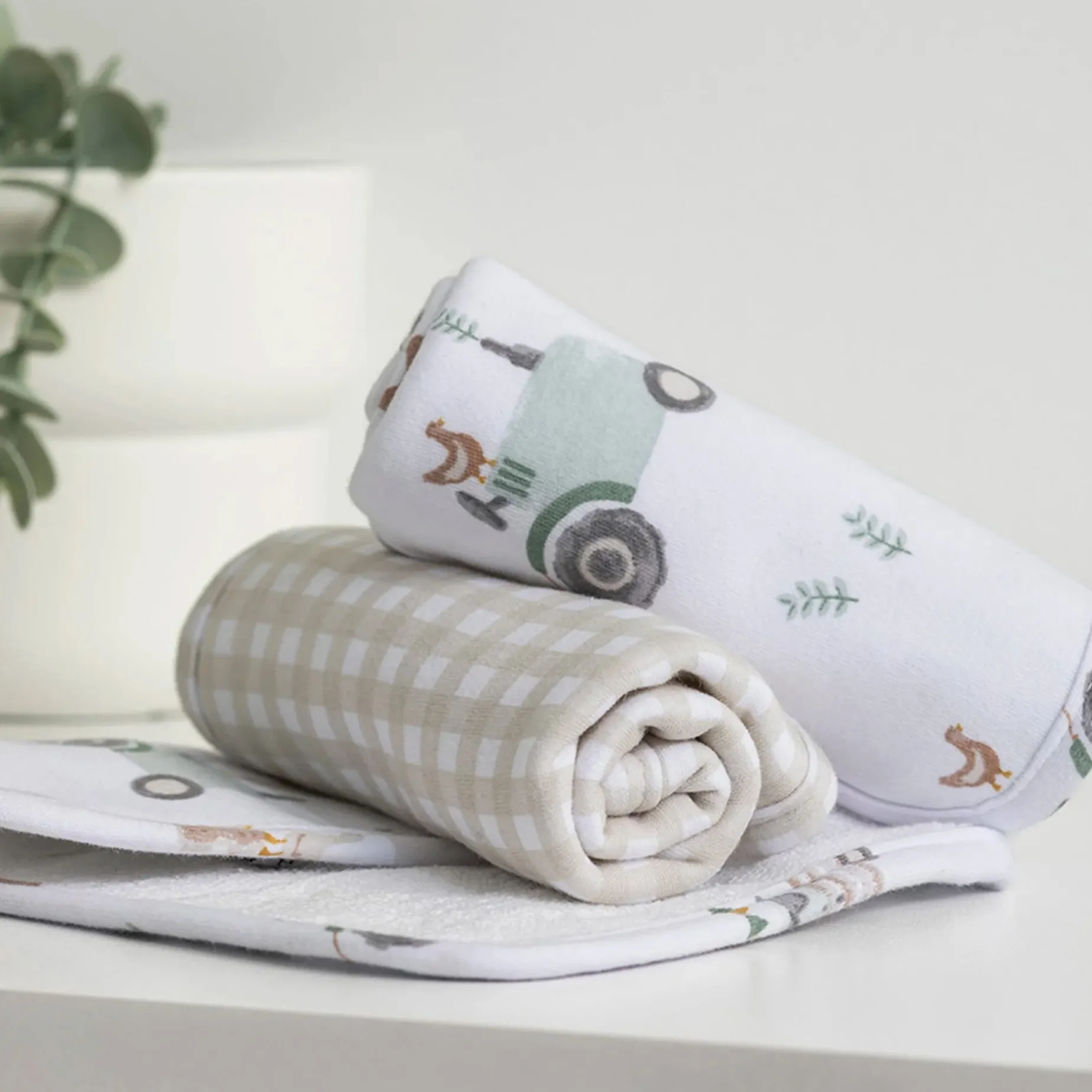 Add a touch of luxury to baby’s bath time with this gorgeous 100% cotton 5-piece baby bath set featuring a hooded towel and four washcloths. Soft and gentle against baby’s delicate skin, this gift set is a practical yet beautiful gift for new parents.