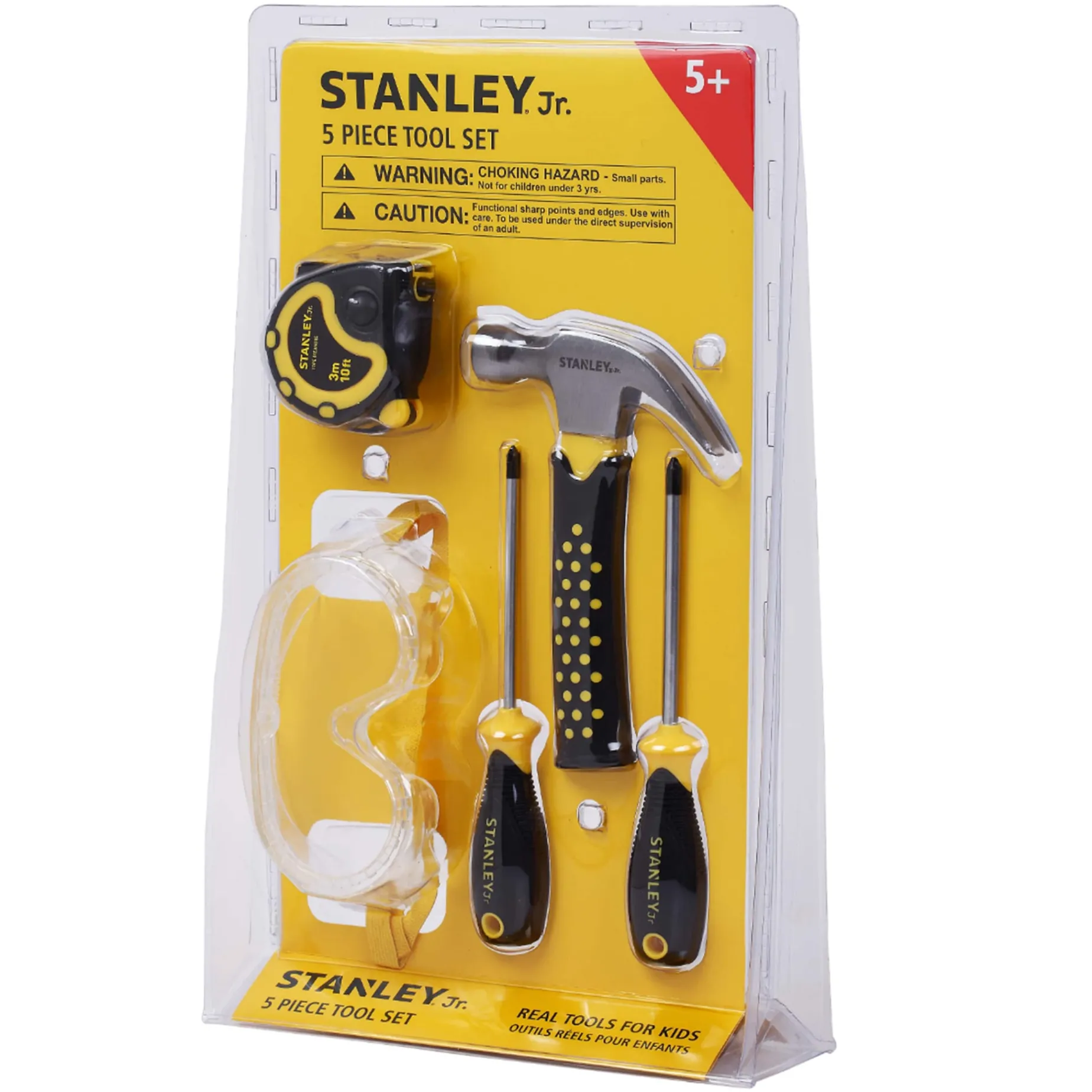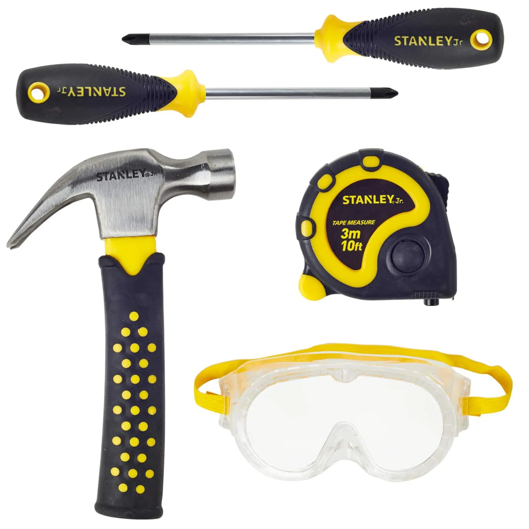 -Set includes hammer, phillips screwdriver no. 1, phillips screwdriver no. 2, tape measure, and safety goggles.