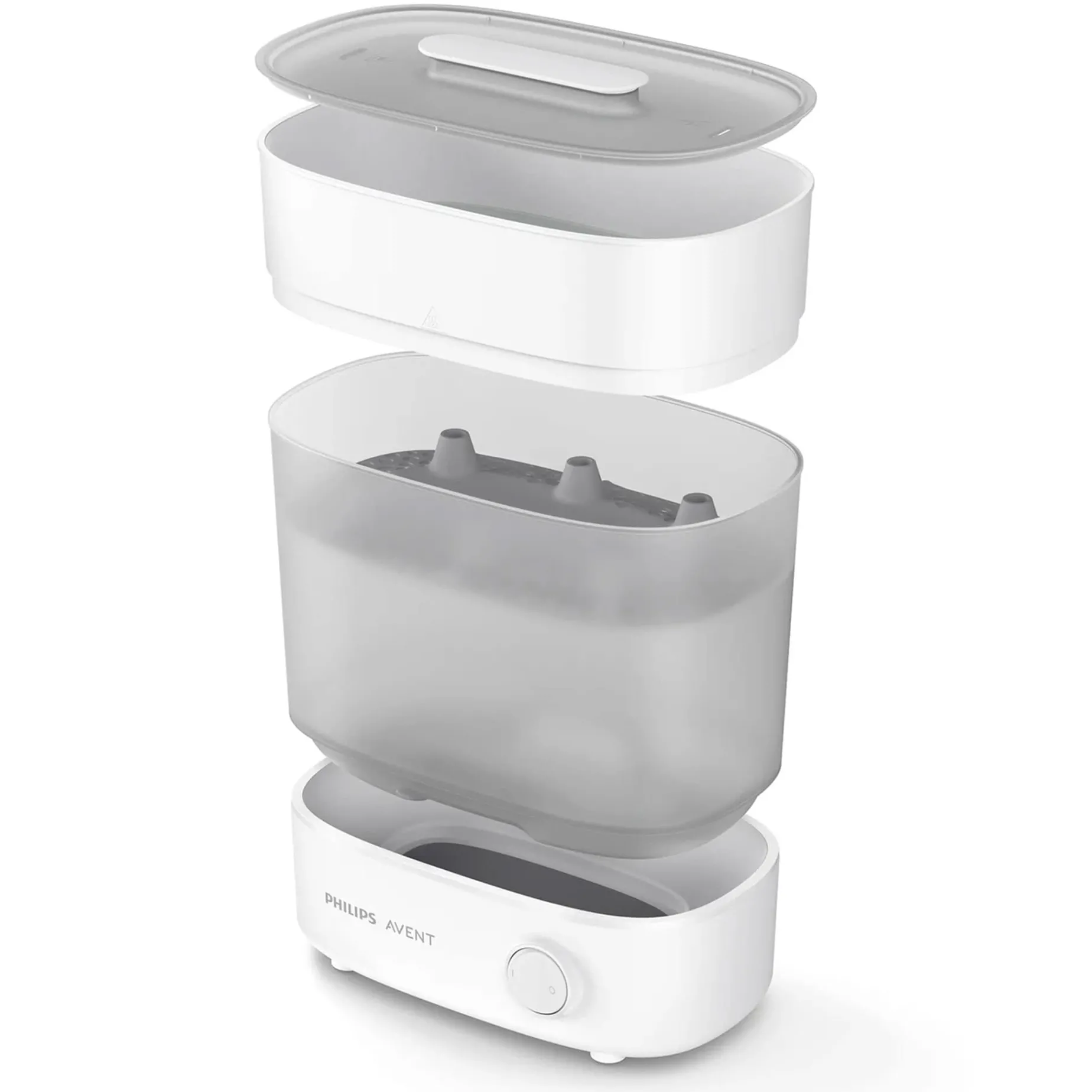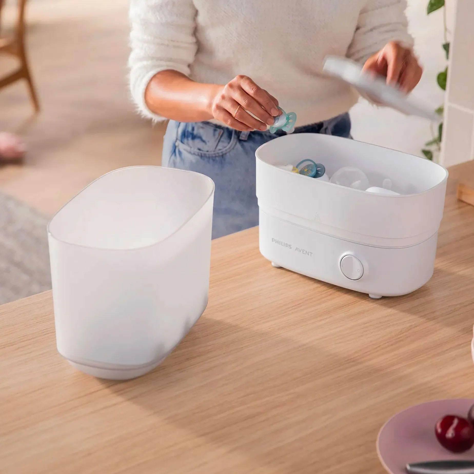 The sterilizer’s thorough, chemical-free cleaning will keep its contents sterile for up to 24 hours. How? Just keep the lid on. Roomy inside, compact outside Our sterilizer is slender and yet still holds up to six Philips Avent baby bottles. It also fits all the other essentials, from teats and soothers to a manual breast pump. This sterilizer is quick and easy to clean Top to bottom, inside and out, the sterilizer is quick and easy to clean – even the heating plate. So you get more time to be with your little one.