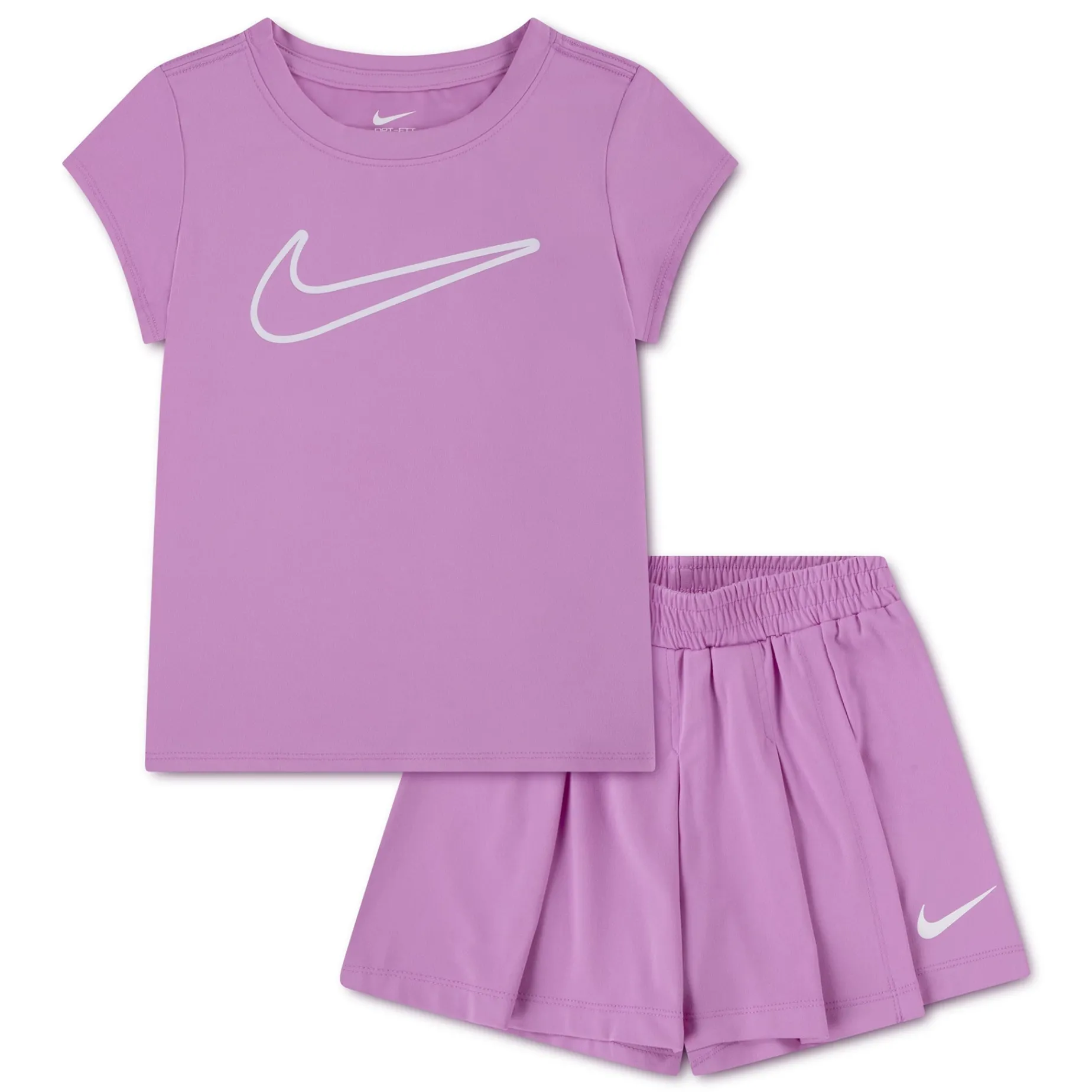 This 2-piece set from Nike is an effortless way to dress your little girl for fun. Both pieces are made of poly jersey knit fabric with added stretch for ease of movement, and enhanced with moisture-wicking Dri-FIT Technology to help keep kids cool and dry during activity. The tee has a tagless crewneck for fuss-free wear and the matching skort features a pleated overlay on the front and a stretchy waistband for a comfy fit that lasts all play, all day.