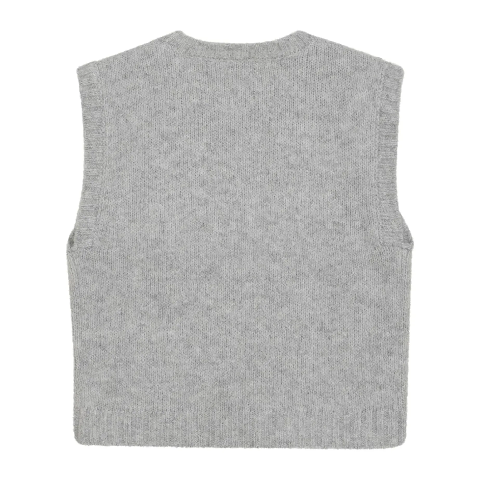 Smart knit slipover with writing on the front from Creamie. It has wide armholes and a round neckline, with a ribbed hem. In the armholes and at the bottom, there are wide ribbed edges. The slipover can be styled over a T-shirt, and is nice and warm on cold days.