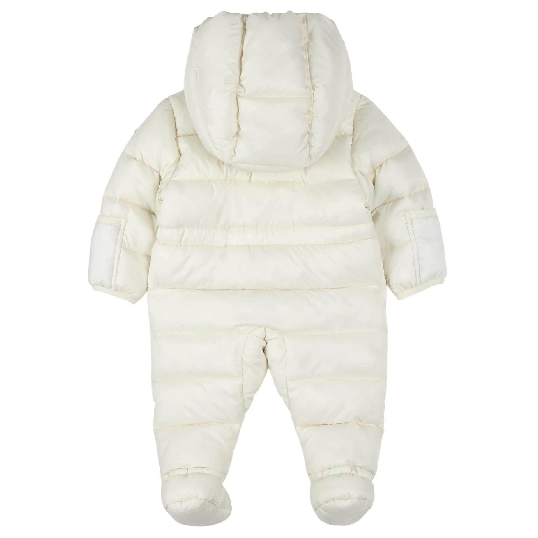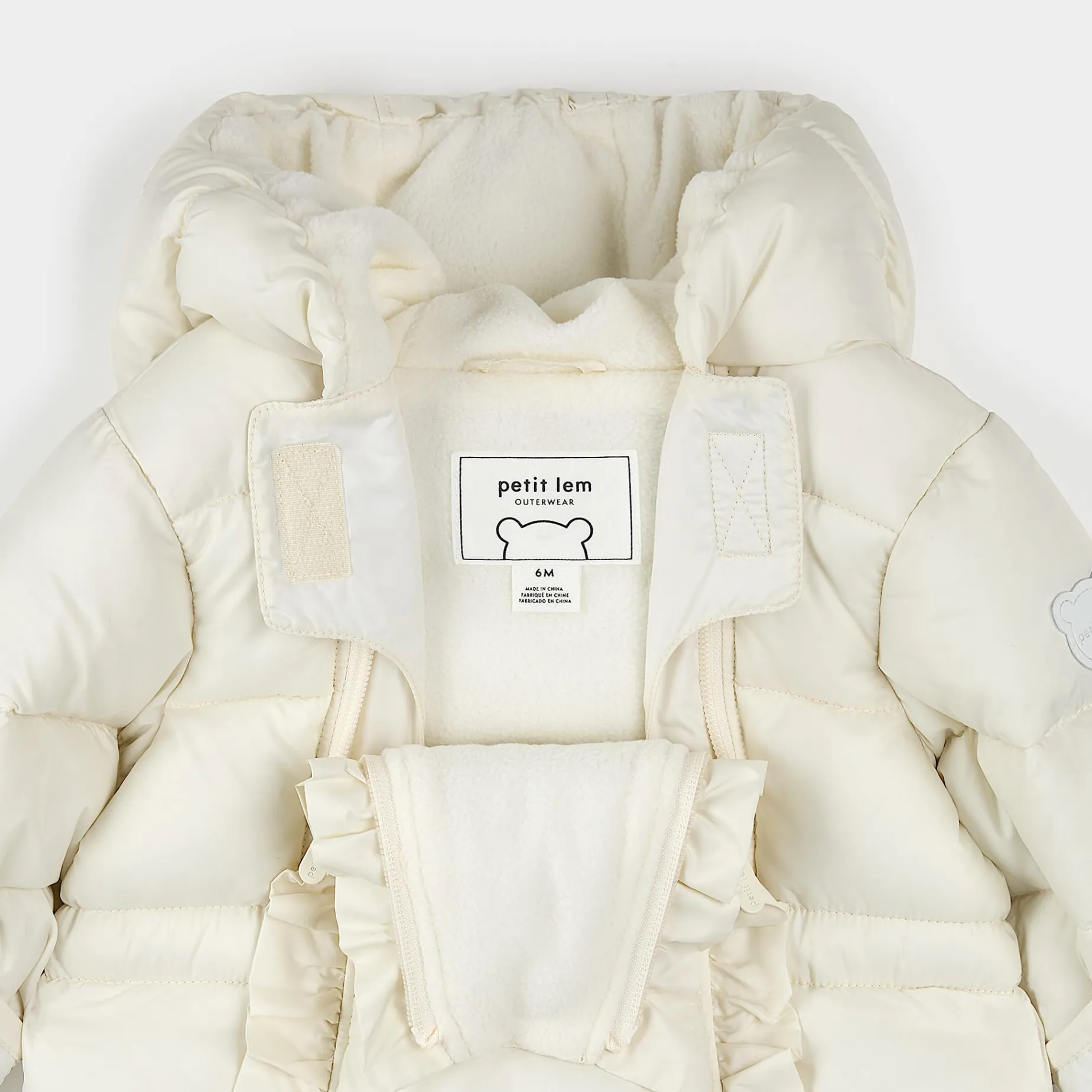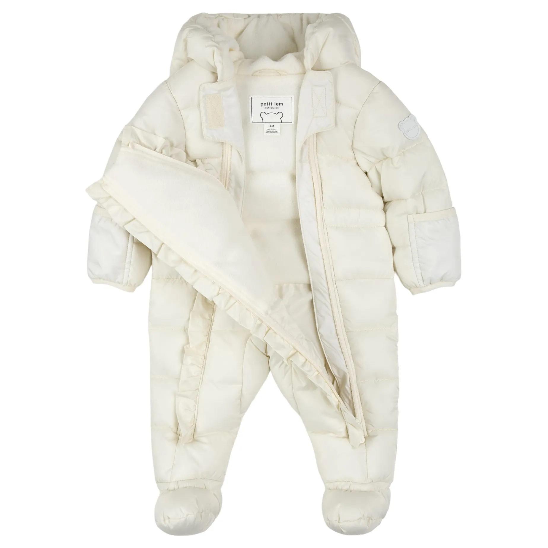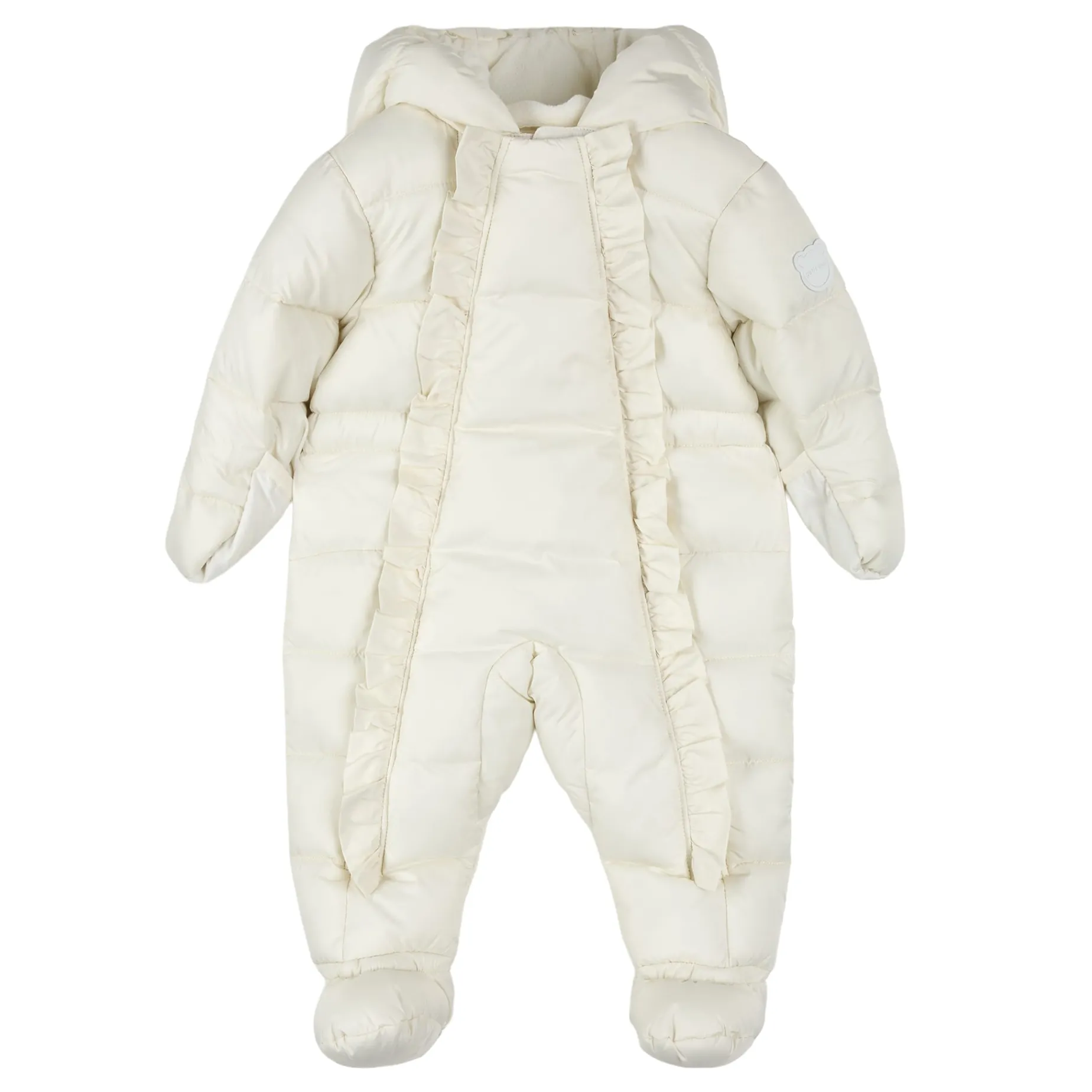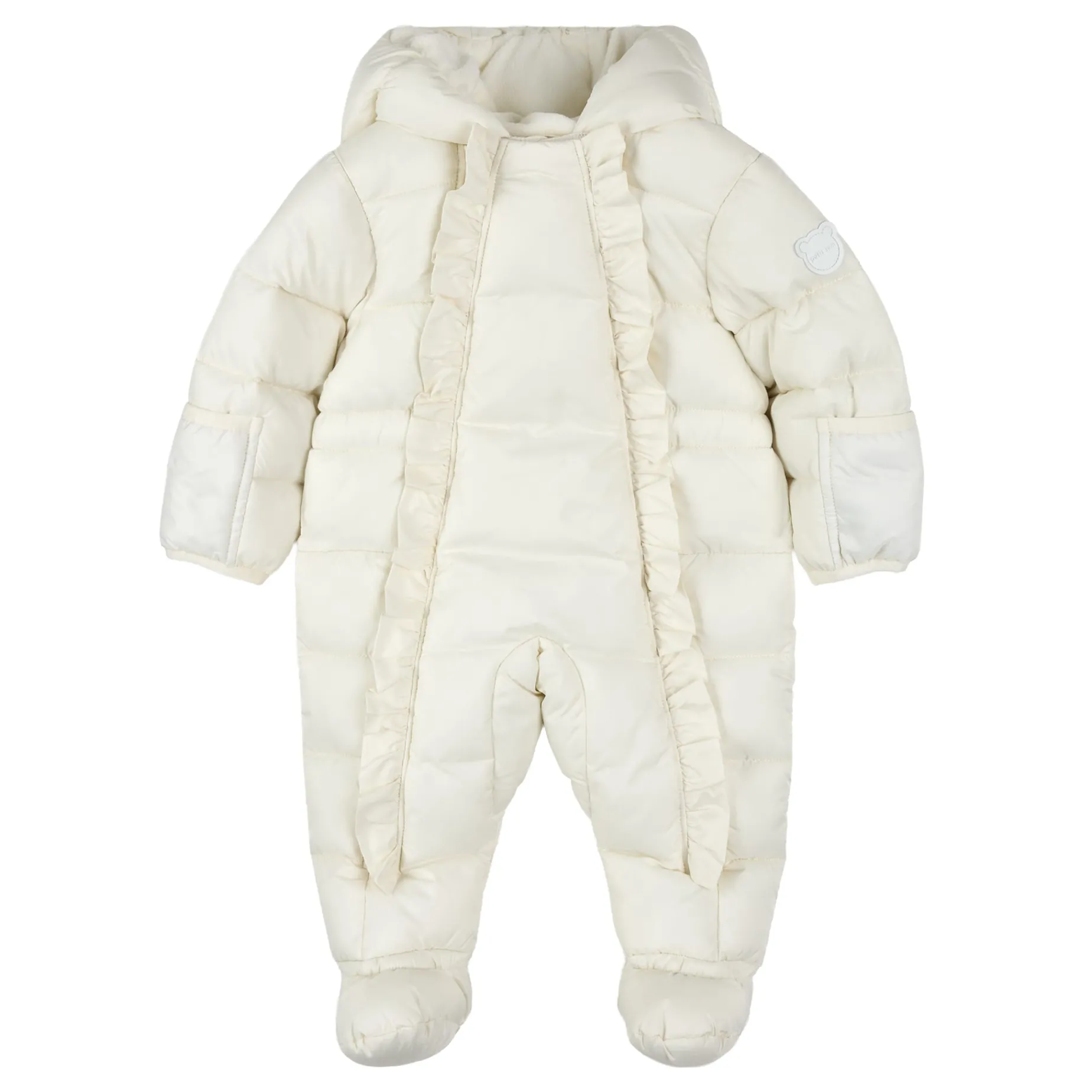 Brave chilly days in style with your little one in tow. Made entirely from recycled materials, our sustainable snow capsule is wind-resistant, water-repellent and designed to withstand temperatures down to -10C, keeping them snug and happy while experiencing their first snow. The polar fleece lining and face-hugging hood provide extra coziness and keeps out the elements while the frilly zip detailing adds a sweet touch. Sizes 3 months to 9 months have integrated booties while sizes 12-24m have elastic at the ankles.