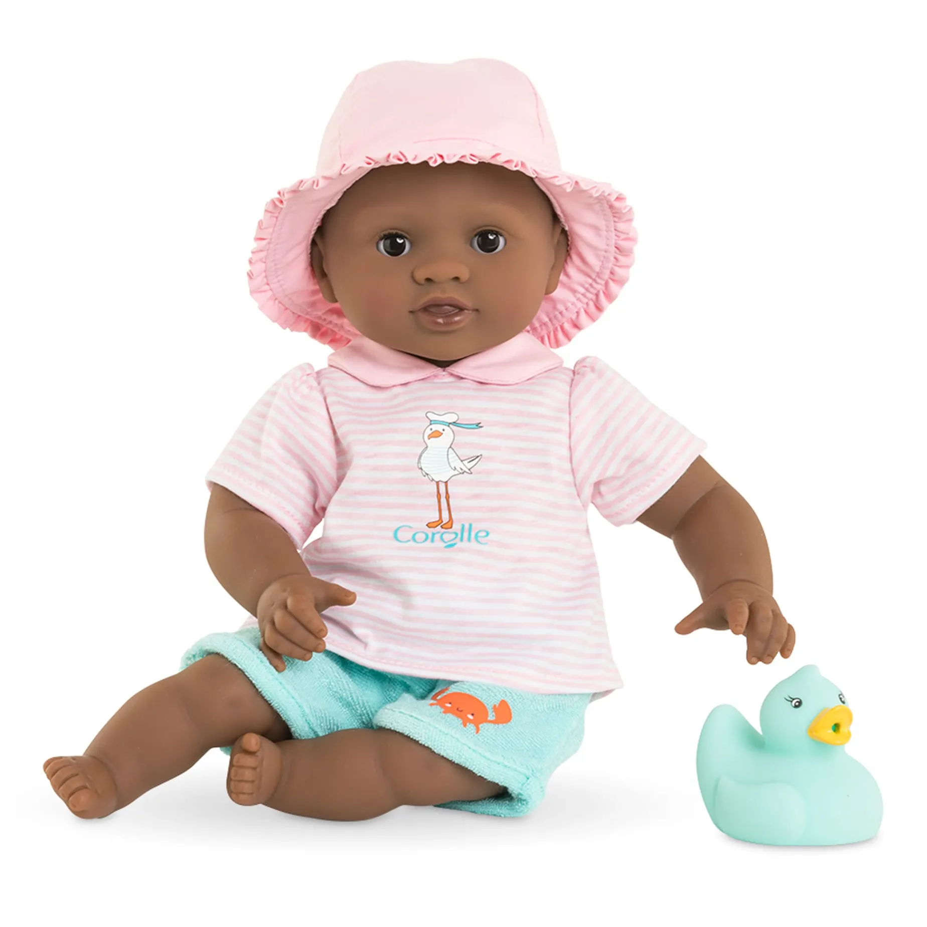 There is a tab sewn onto the doll’s back so it can be hung up to dry when bathtime or water playtime is over. Its 12-inch (30 cm) size fits perfectly in your child’s small arms and is ideal for hugging and cuddling. The doll’s head and limbs are made of soft vinyl that is lightly scented with vanilla, a Corolle signature. Its soft body allows it to take on the same positions as a real baby, and its blue sleepy eyes close when put down for a nap or at bedime, also like a real baby.