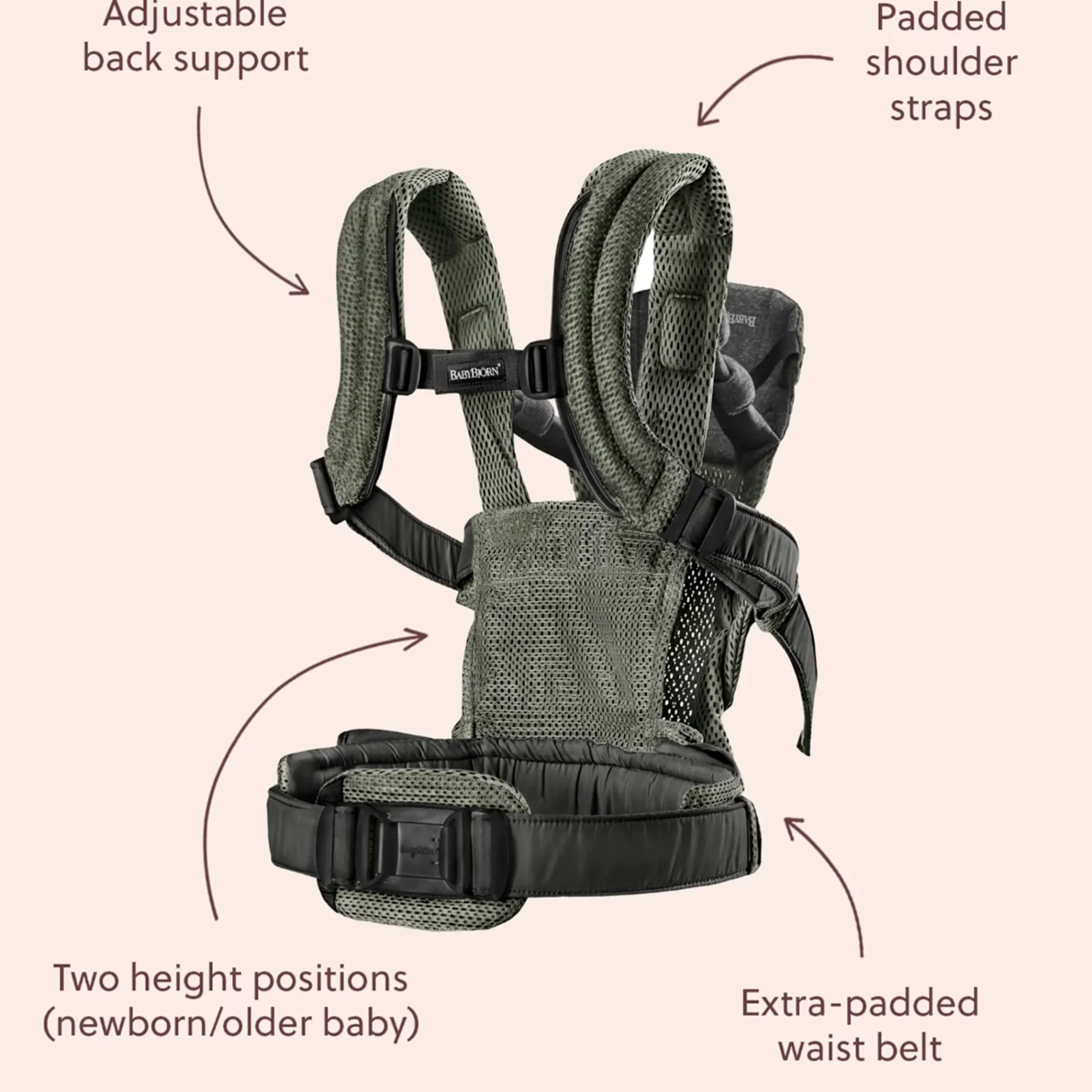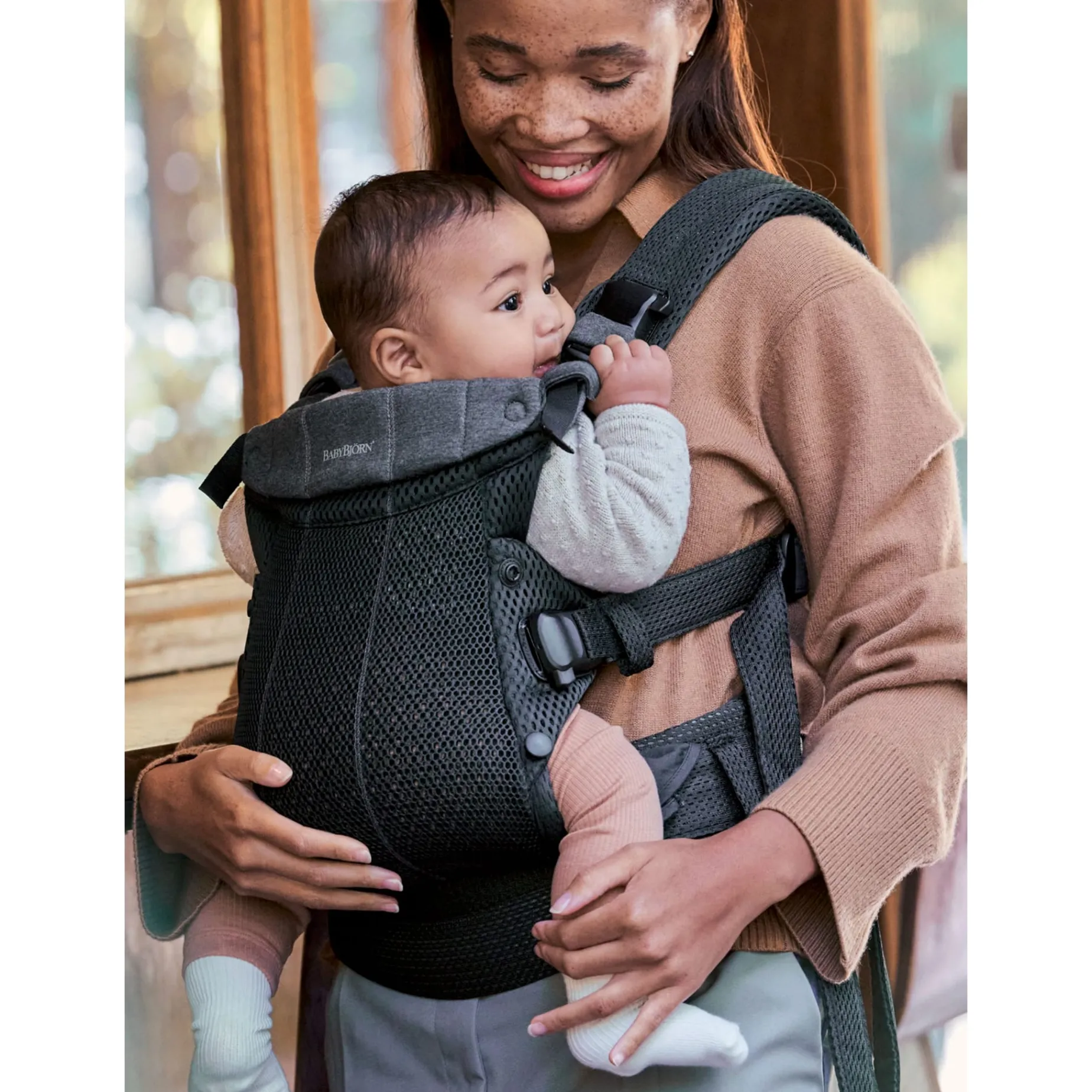 A super-comfy baby carrier in soft-structured, luxurious mesh—ergonomic for you and your baby.