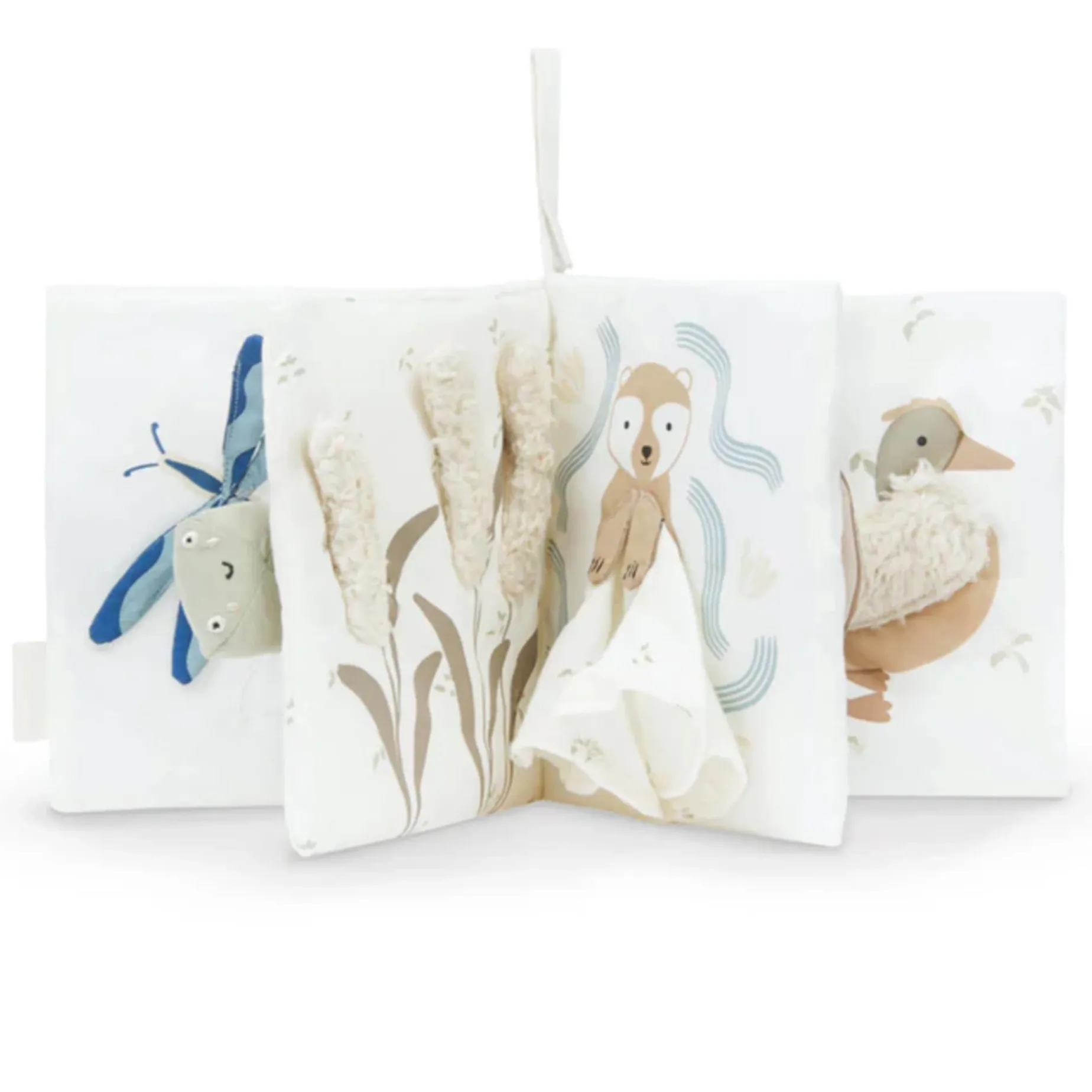 Our Tales of the Riverbank baby fabric book features all our favourite friends from the Riverbank Collection. With sensory elements such as a mirror, frog toy, crinkly leaves and a squeaky fluffy duck, this book is designed to entertain your little ones at home or on the go. Attach it to the pram with the handy velcro loop. Made from 100% organic cotton and recycled polyester filling and packaged in a lovely box, this makes the perfect gift.
