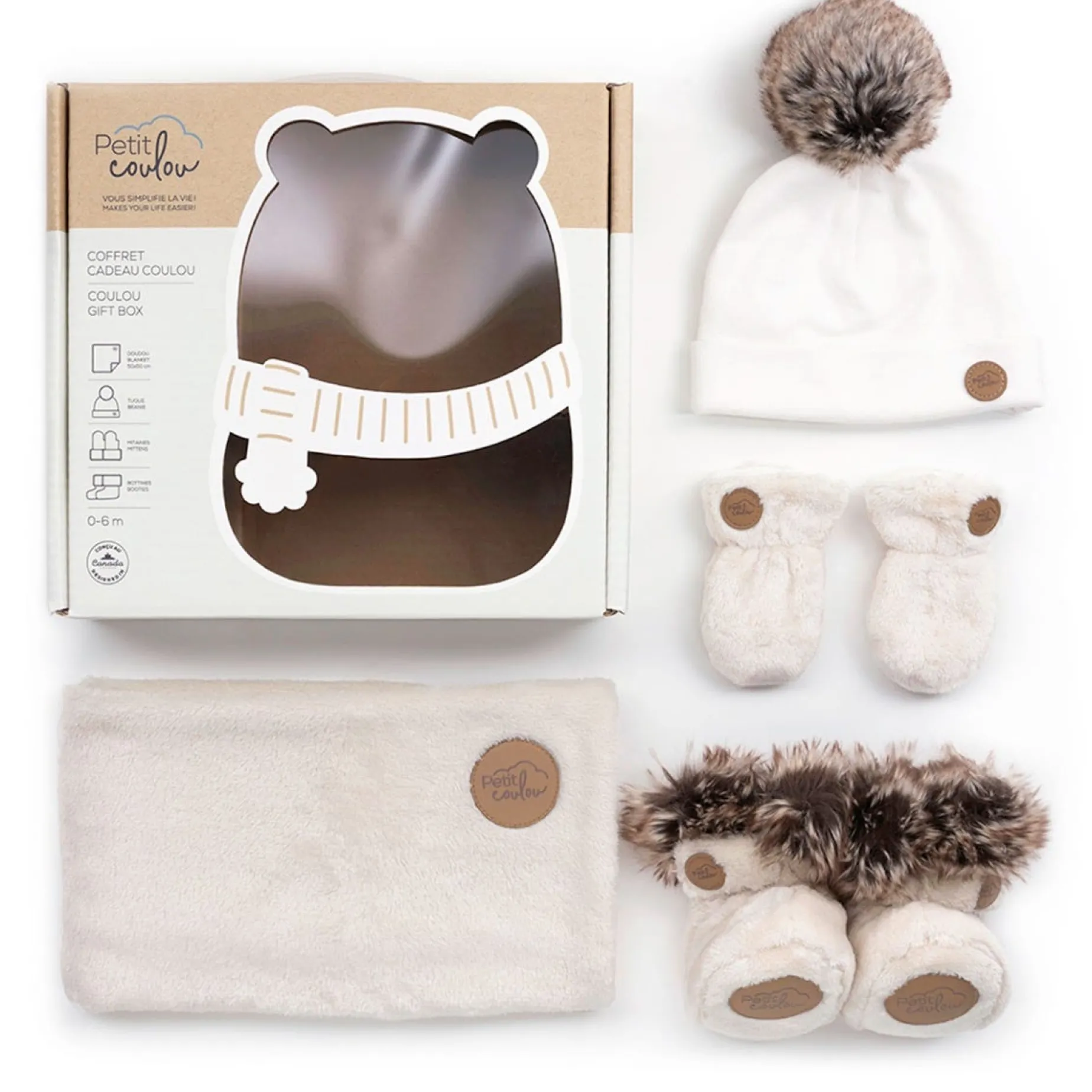 This beautiful baby gift box includes a cute pair of booties adorned with wolf-colored faux fur, a pom-pom beanie made of organic stretch cotton, a pair of mittens and a soft blanket to keep baby cozy and warm during outdoor outings.