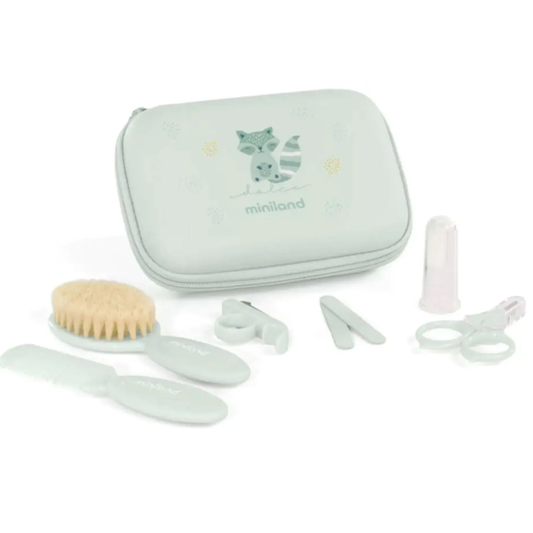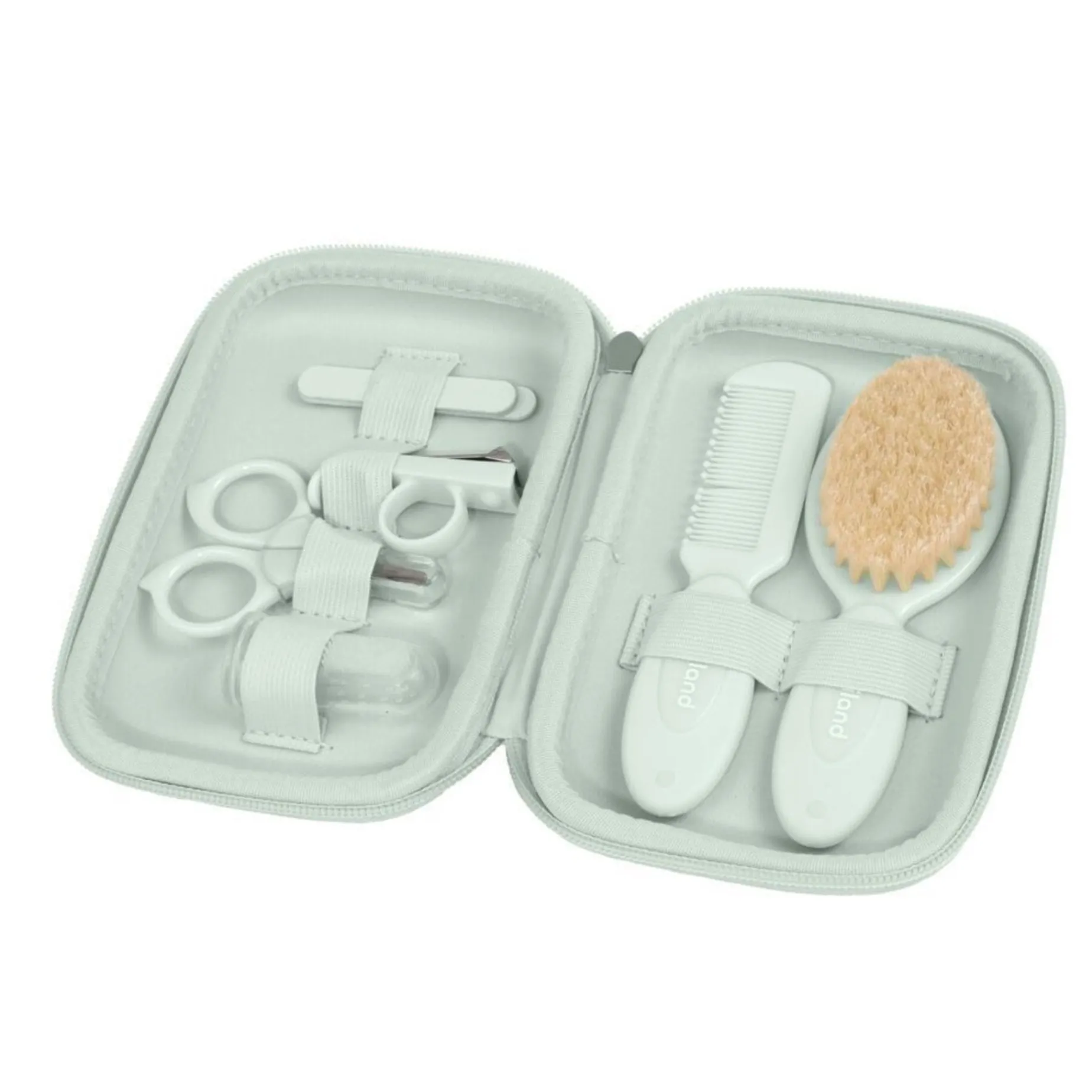 1 soft-bristle brush 1 comb with rounded edges 1 pair of scissors with rounded edges and a protective cover 1 safety nail clipper 2 nail files 1 silicone finger toothbrush with a protective case