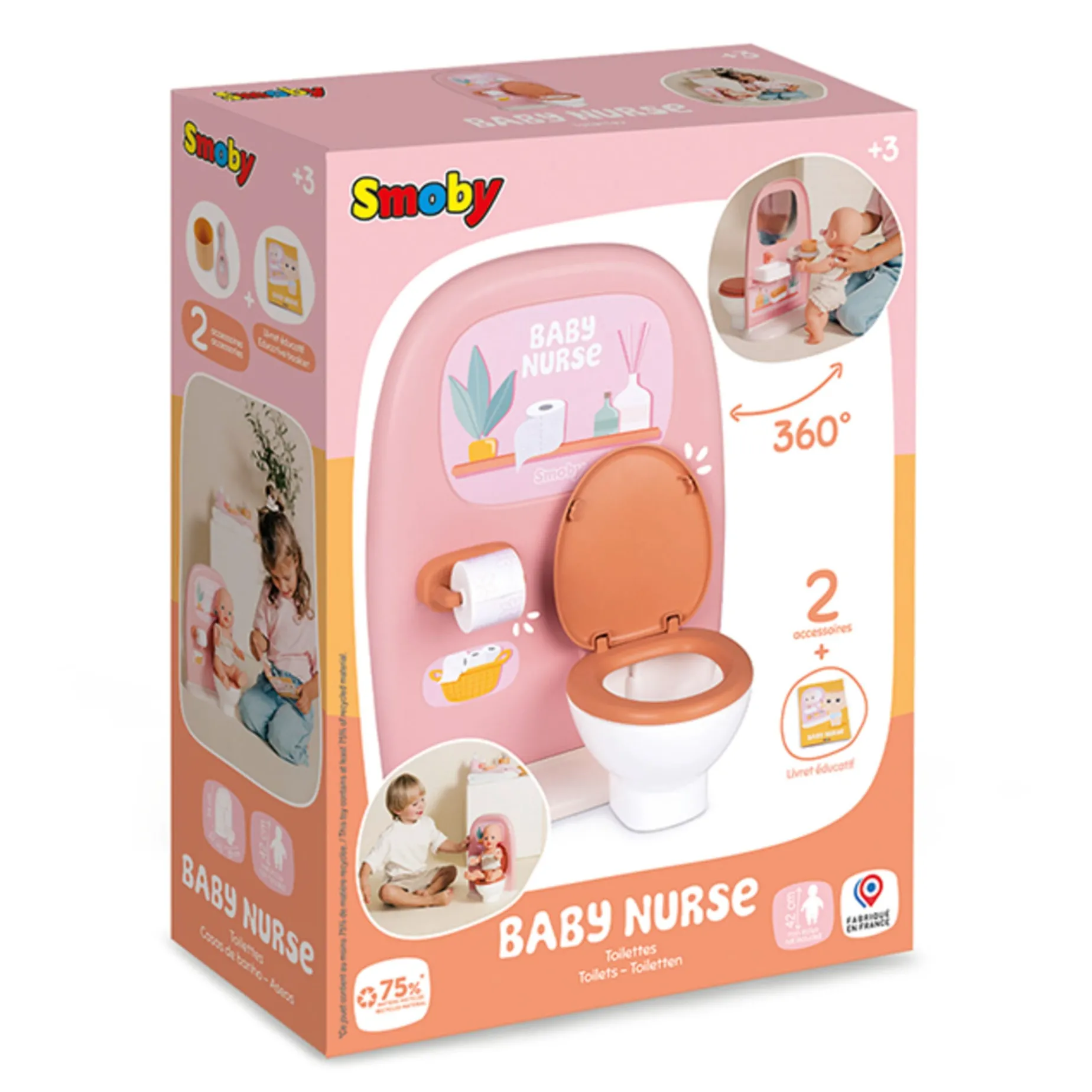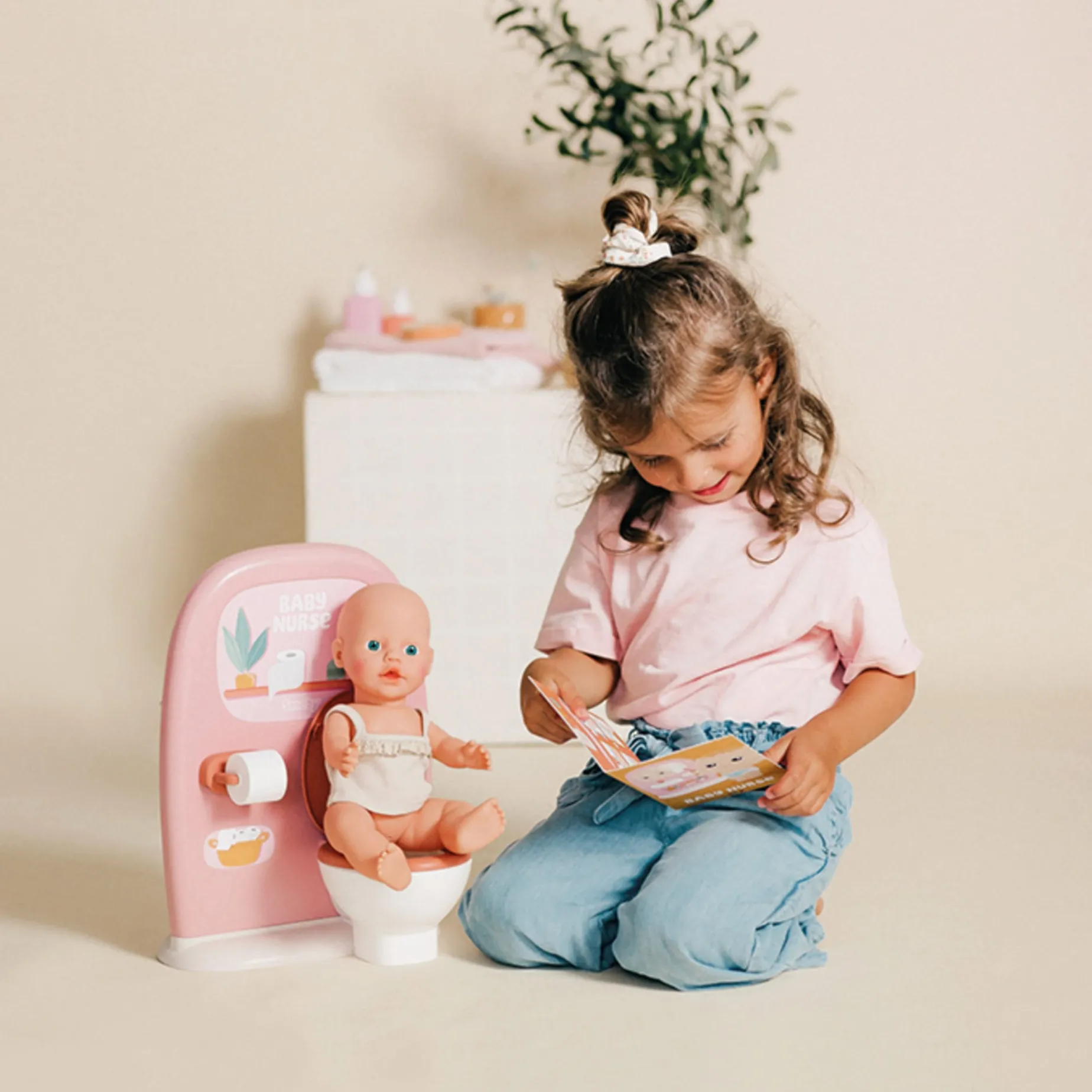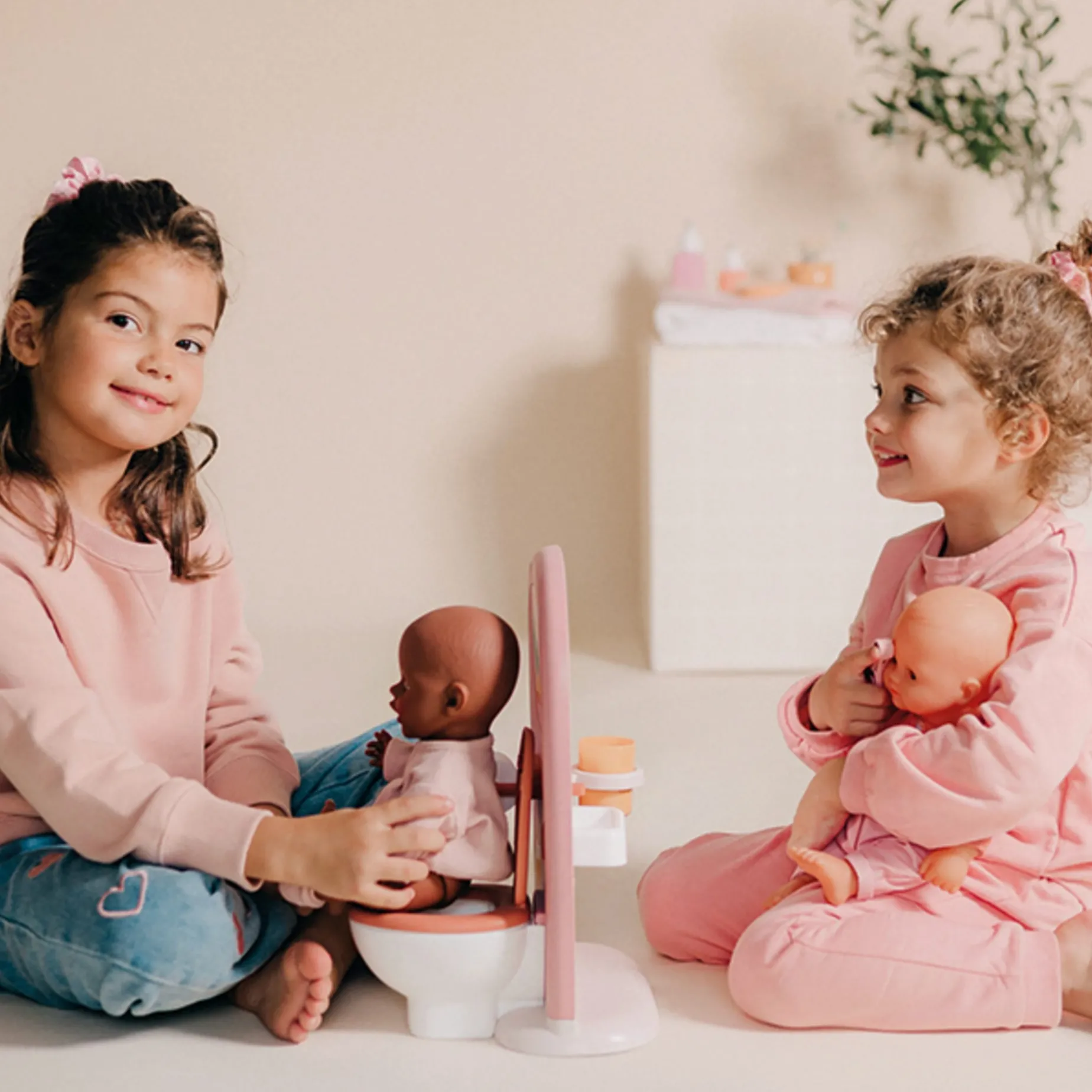 This toy is a doll toilet and sink set, featuring one side toilet with a toilet paper roll and functional lid, and one side sink with mirror and toothbrush set. Doll not included.