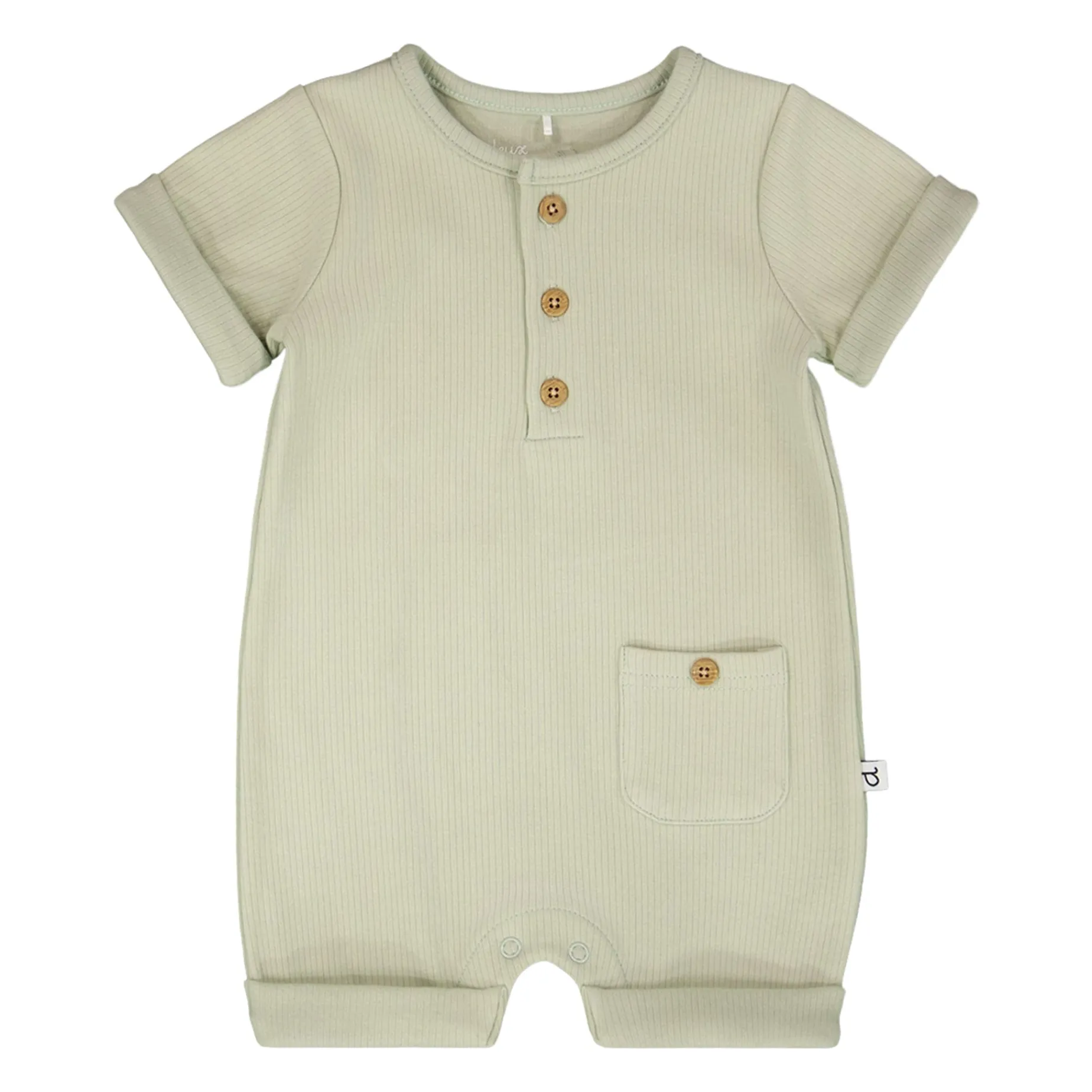 Soft and full of charm, this cotton rib romper in sage green is made for adventurous little boys. The one-piece design features short sleeves, a round neckline, a front button placket, and a small patch pocket for a playful yet practical touch. Snaps at the inseam make changes quick and easy, while the ribbed cotton blend ensures comfort all day long.