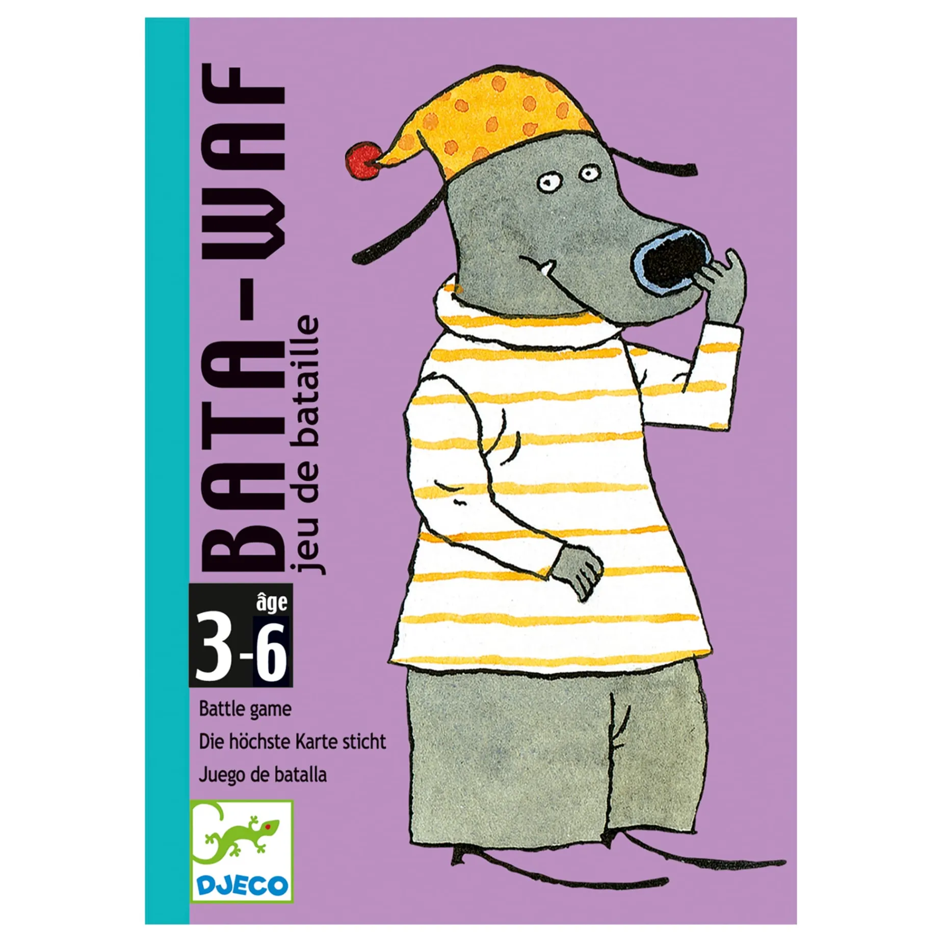 A cute battle game for little ones with fun dog illustrations. On the count of 3, players all turn over a card: the biggest dog wins the round. If several dogs are the same size, then that’s “Bata-Woof”! The first player to win all the cards wins the game.