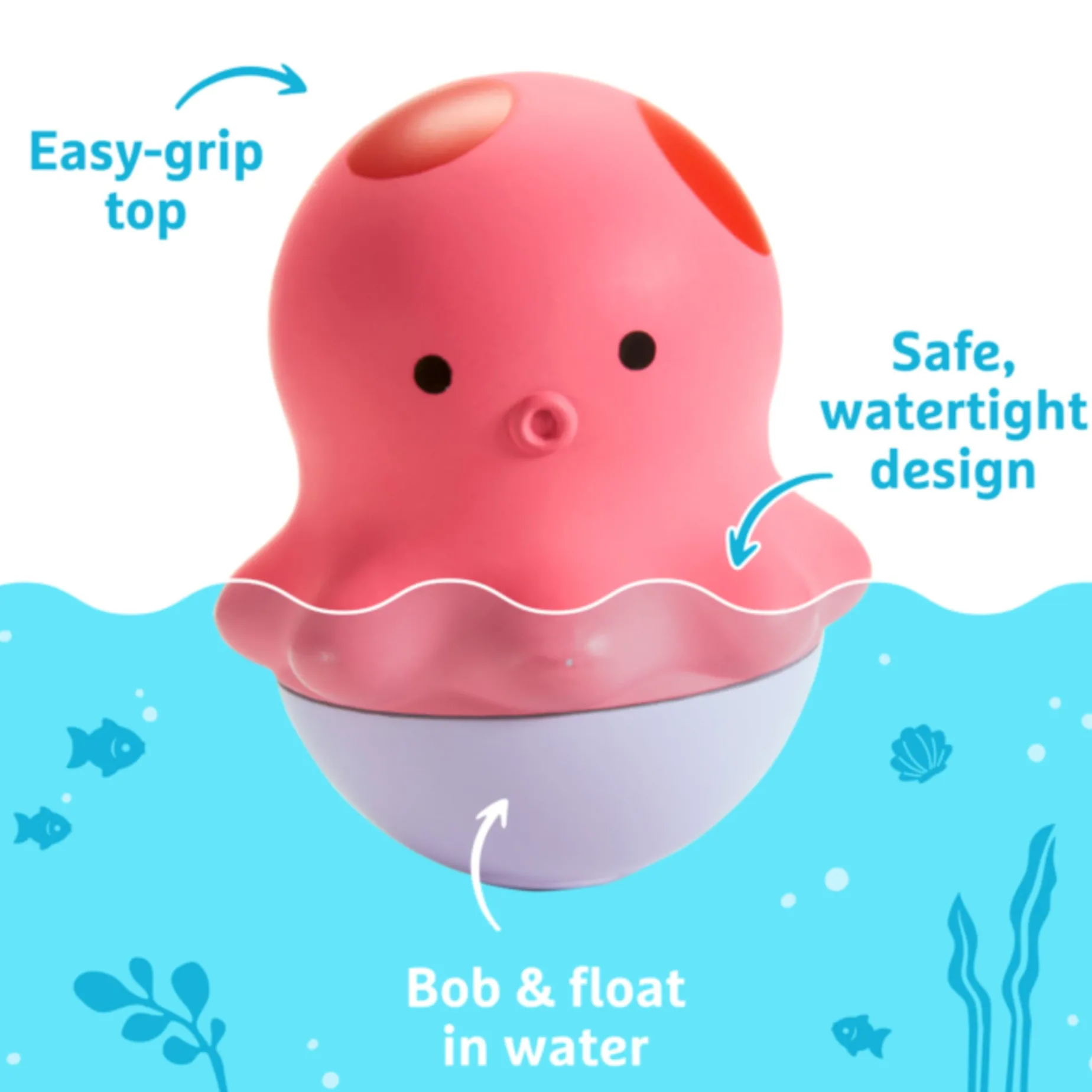 -Set of three bath toys includes (1) Octopus bobber, (1) Walrus bobber and (1) Dolphin bobber