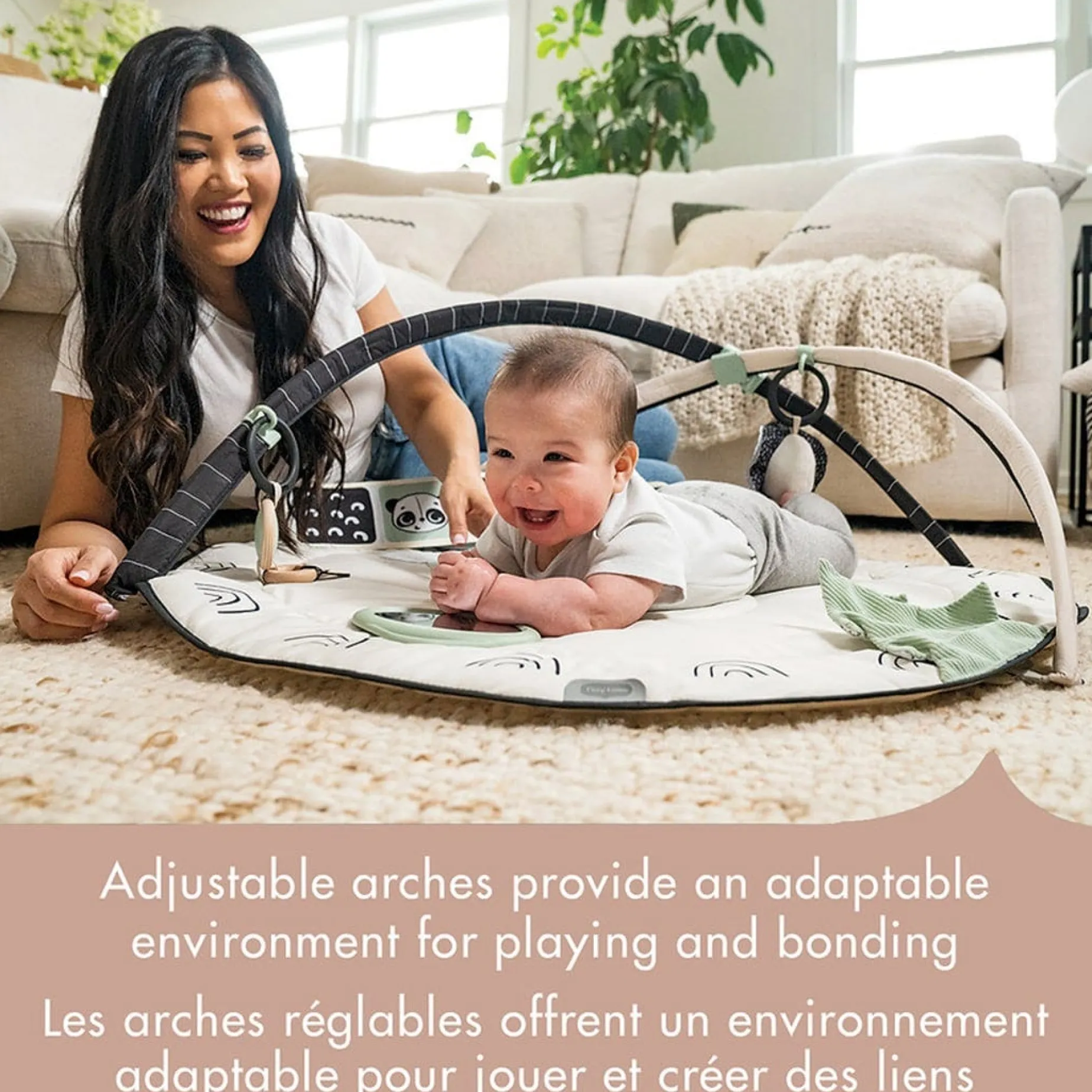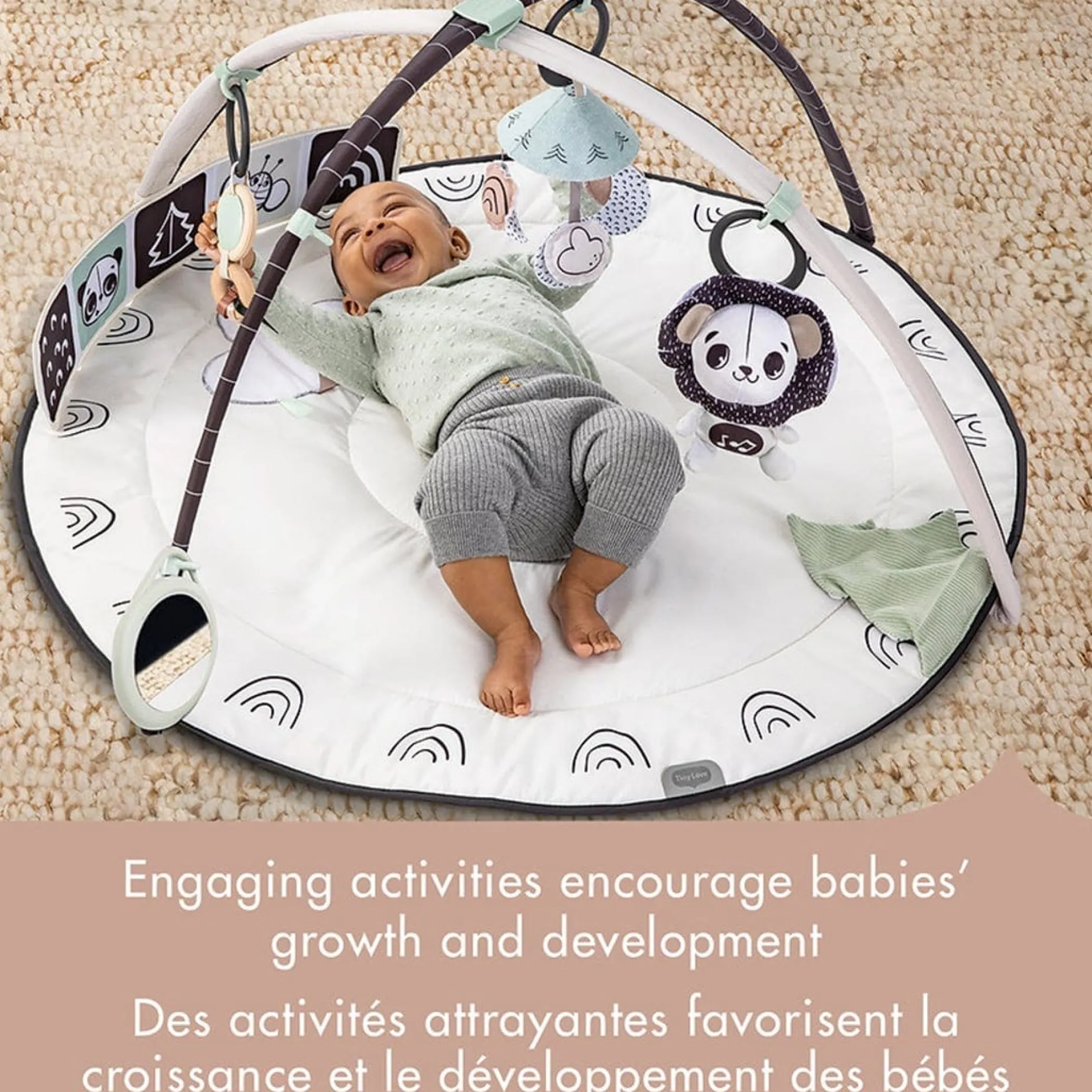 Featuring a charming responsive musical lion doll, geometric contrasting mobile, soft black and white take along book and tummy time mirror and uniquely designed with adjustable arches and sliding rings, this gymini creates an adaptable envonment for playing and bonding.