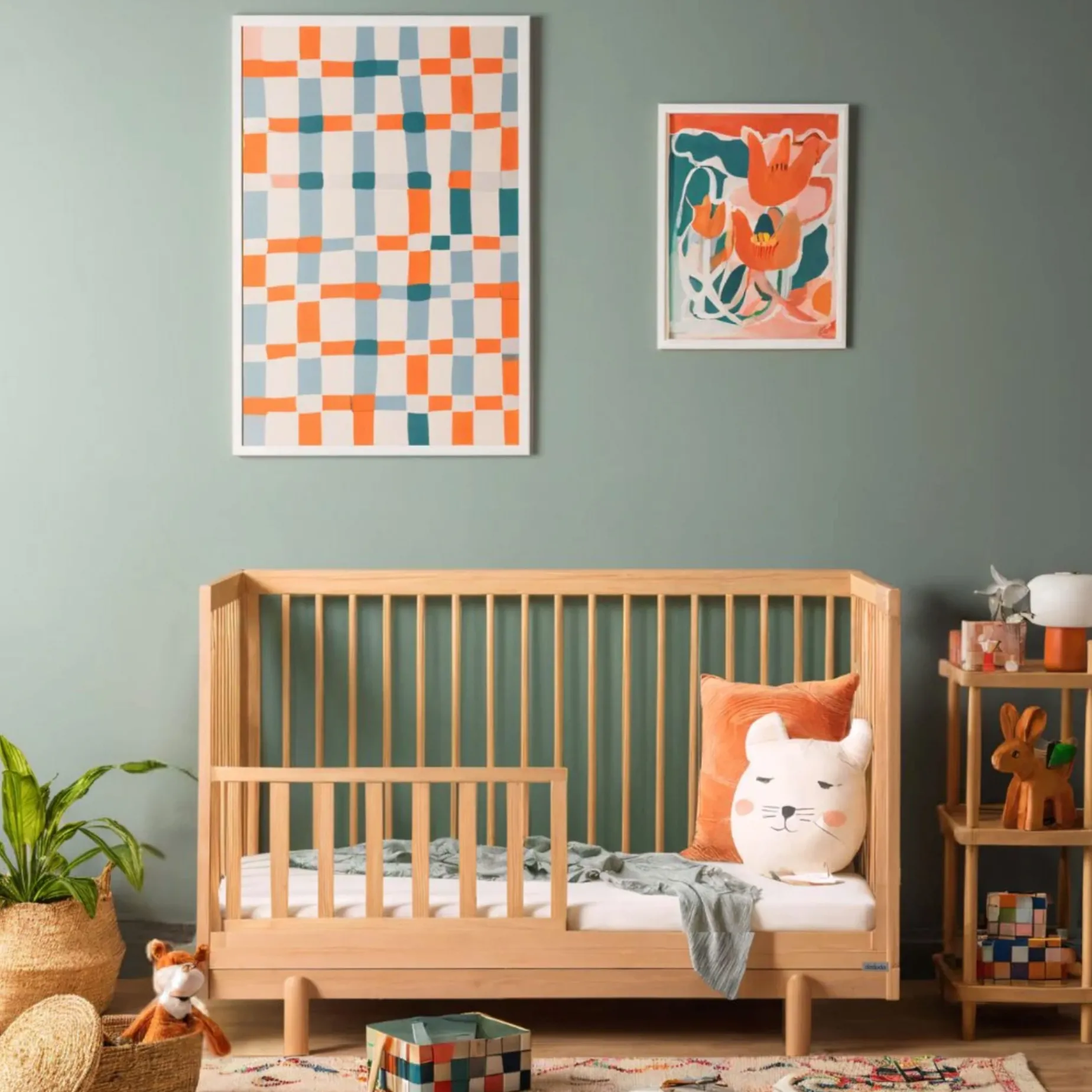 Crib converts to toddler bed, daybed, or floor bed in a few simple steps