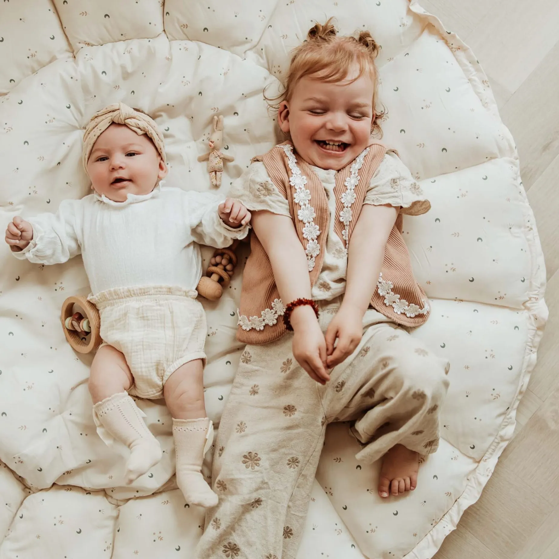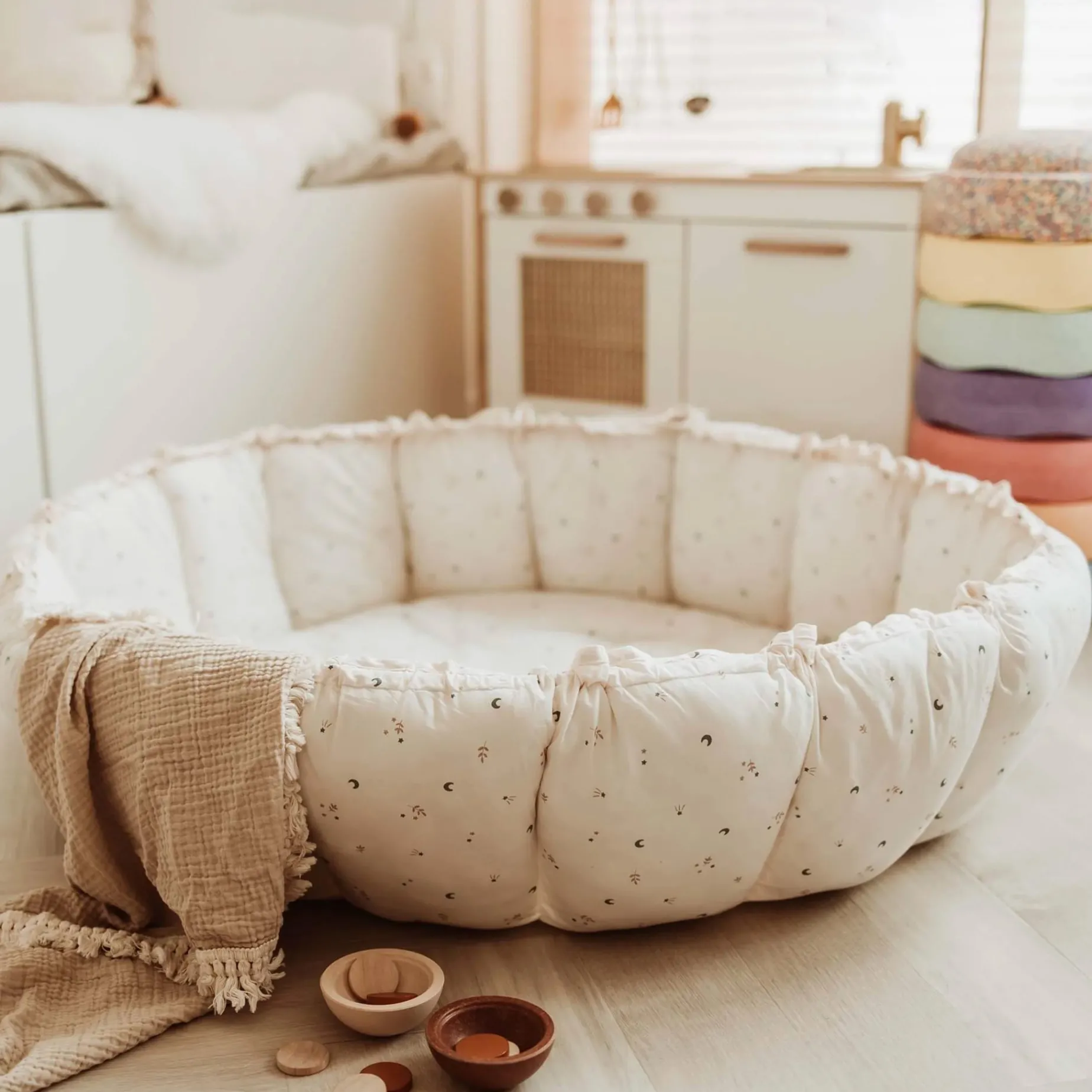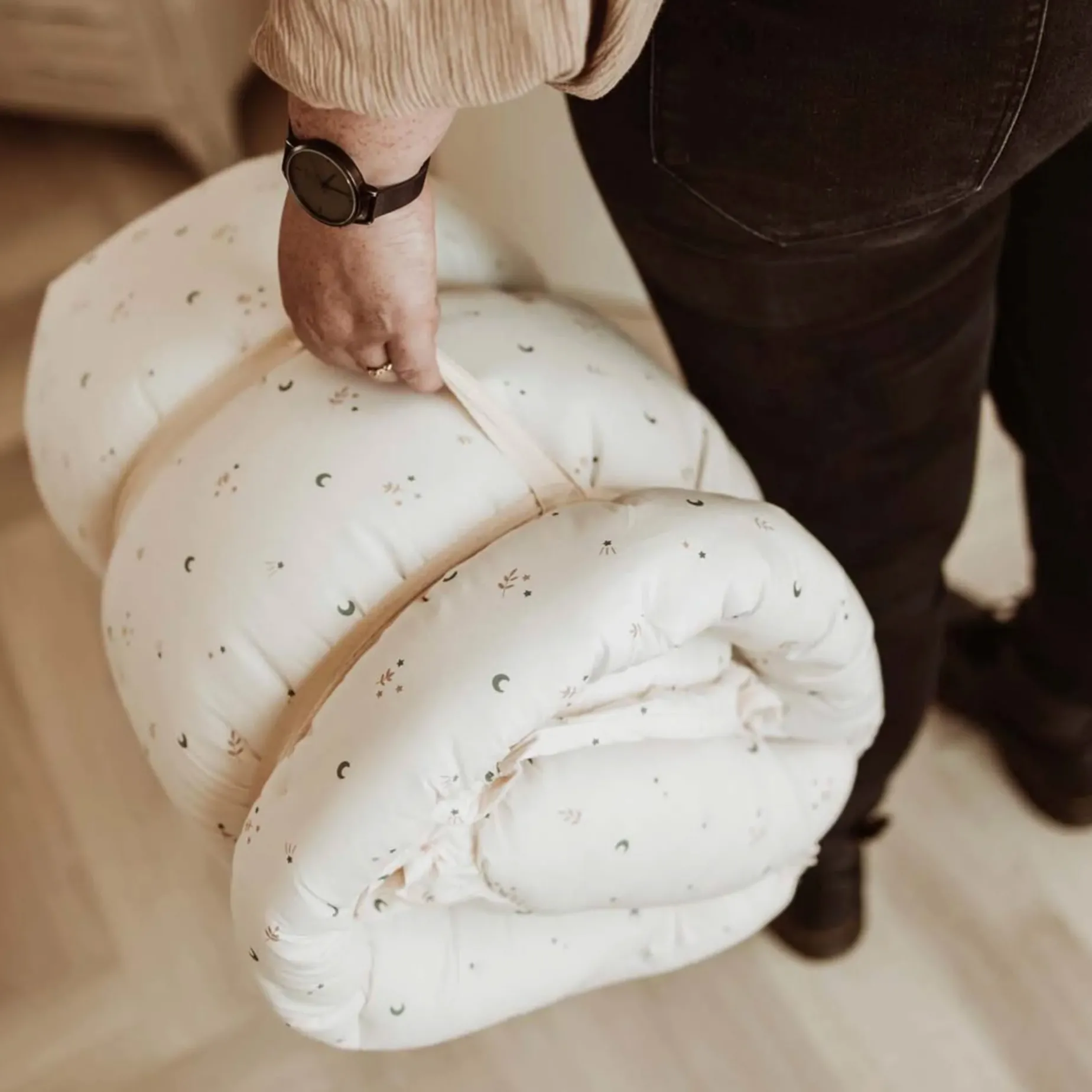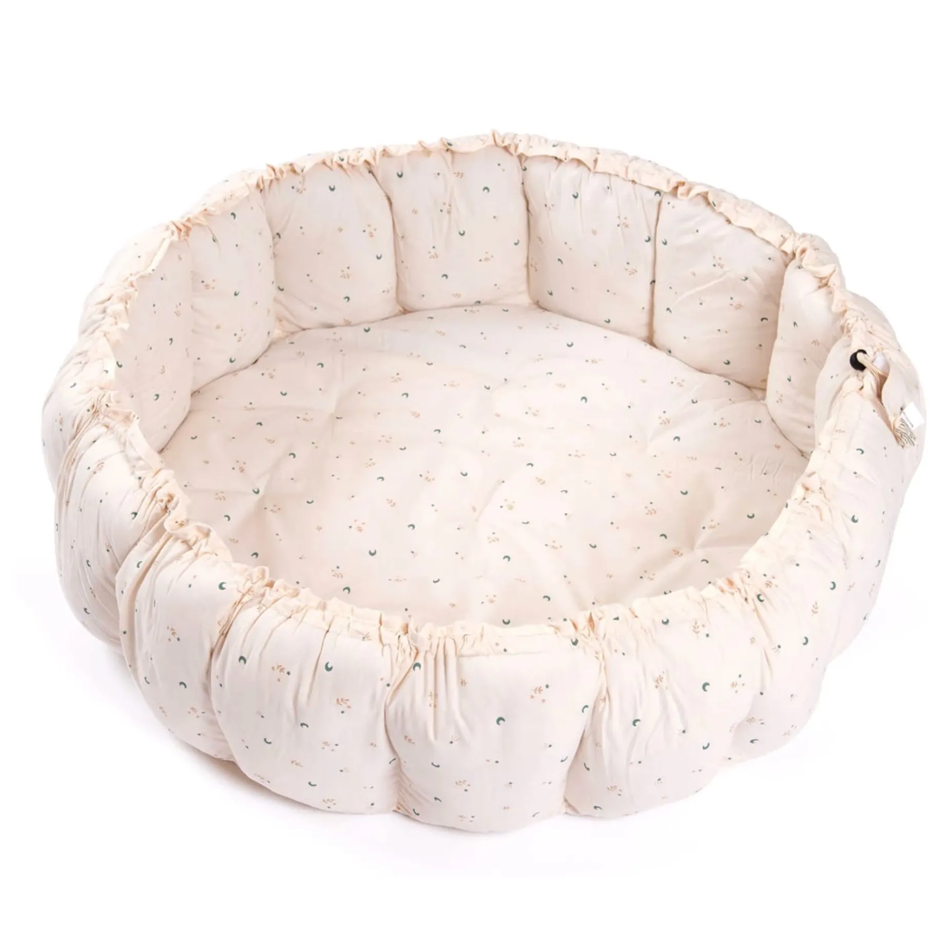 – To switch from playmat to babynest/storage, gently pull the strings to raise the petals