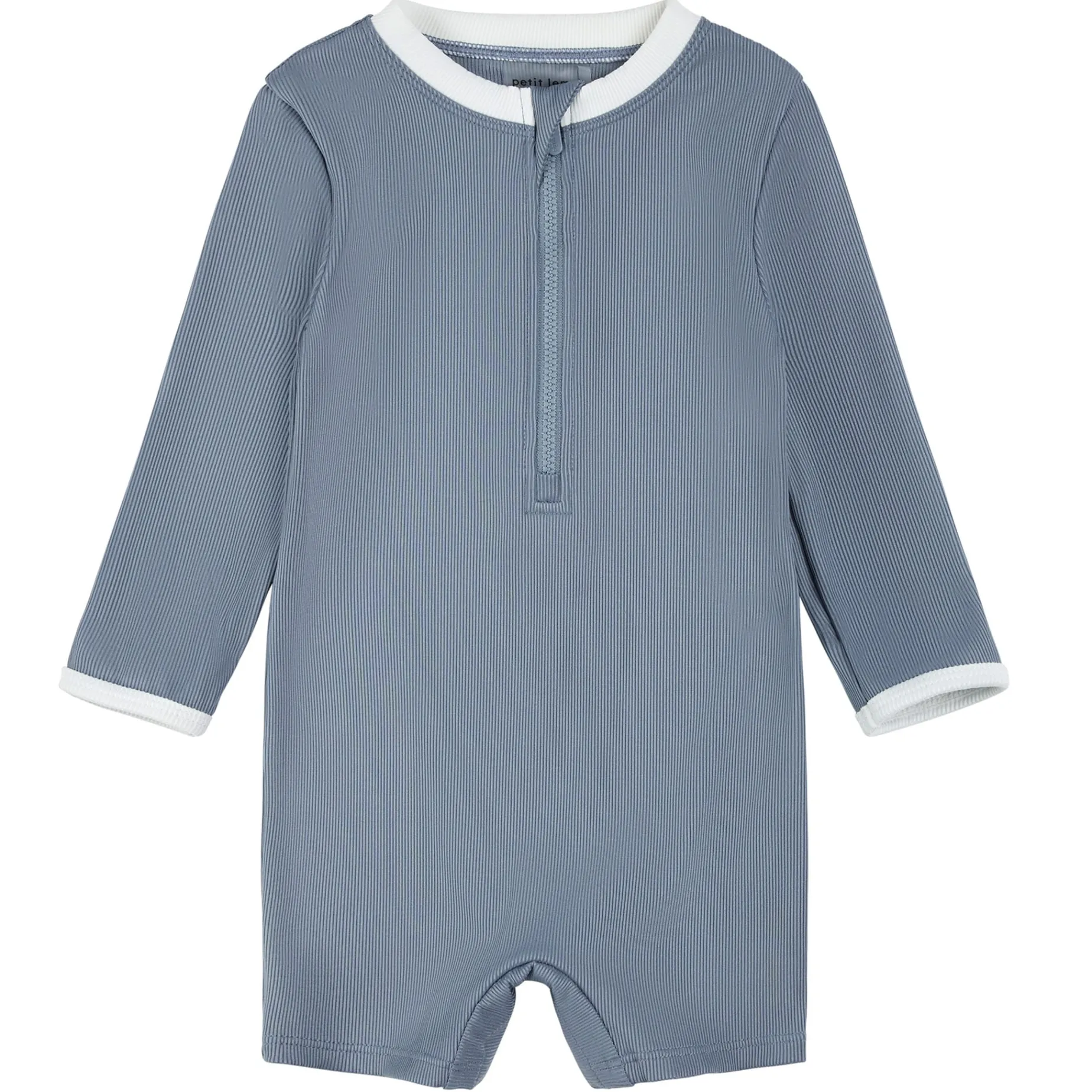 Simple and sun-ready, this long-sleeved swim romper is perfect for covering up the littlest of your explorers. Keeping them warmer in chilly waters, and their skin protected from the sun and salt, the all-in-one is made from a quick-drying fabric with built-in UPF50+. Â The zip at the front makes the piece easier to peel off whether wet or dry.