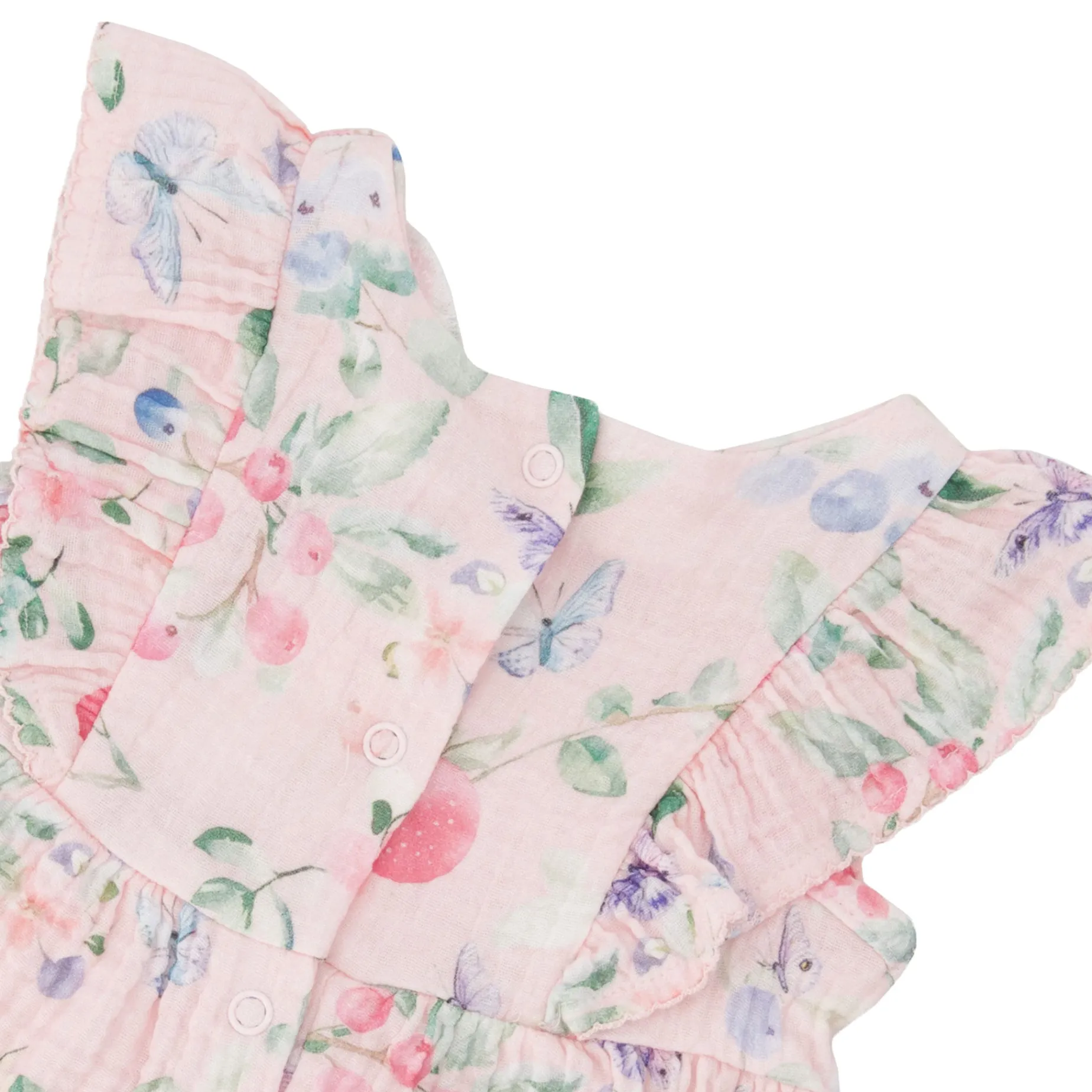 The cotton muslin tunic and rib jersey leggings set pink with printed berries and lilac is a cheerful outfit for baby girls. The sleeveless tunic charms with flutter frills, a gathered waist, and a berry-and-butterfly print that feels like a summer orchard. Paired with lilac rib leggings with an elastic waist, the set offers stretch, breathability, and all-day comfort. Perfect for warm-weather play or festive strolls, it balances sweetness with practicality. A poetic piece from our “Blueberry Cuddles” collection that brightens every occasion.