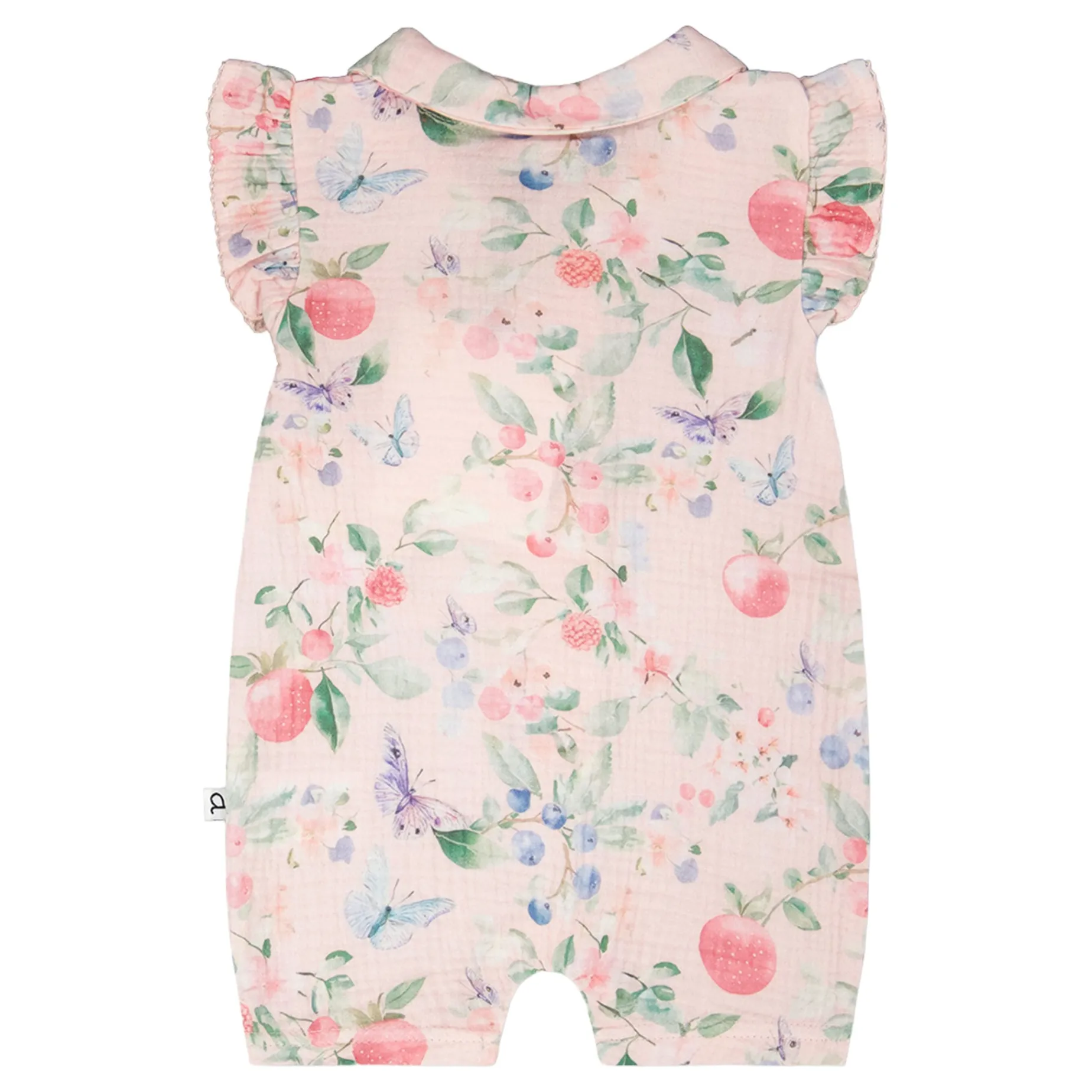 Sweet berries and fluttering butterflies bring a touch of magic to the cotton muslin romper pink with printed berries. This sleeveless item features frilled shoulders, a small flat collar, a button placket down the front, and snap closures at the legs for easy changes. Made from lightweight cotton muslin, the fabric is soft, breathable, and perfect for sunny summer adventures. A cheerful piece from our “Blueberry Cuddles” collection that combines everyday comfort with playful charm.