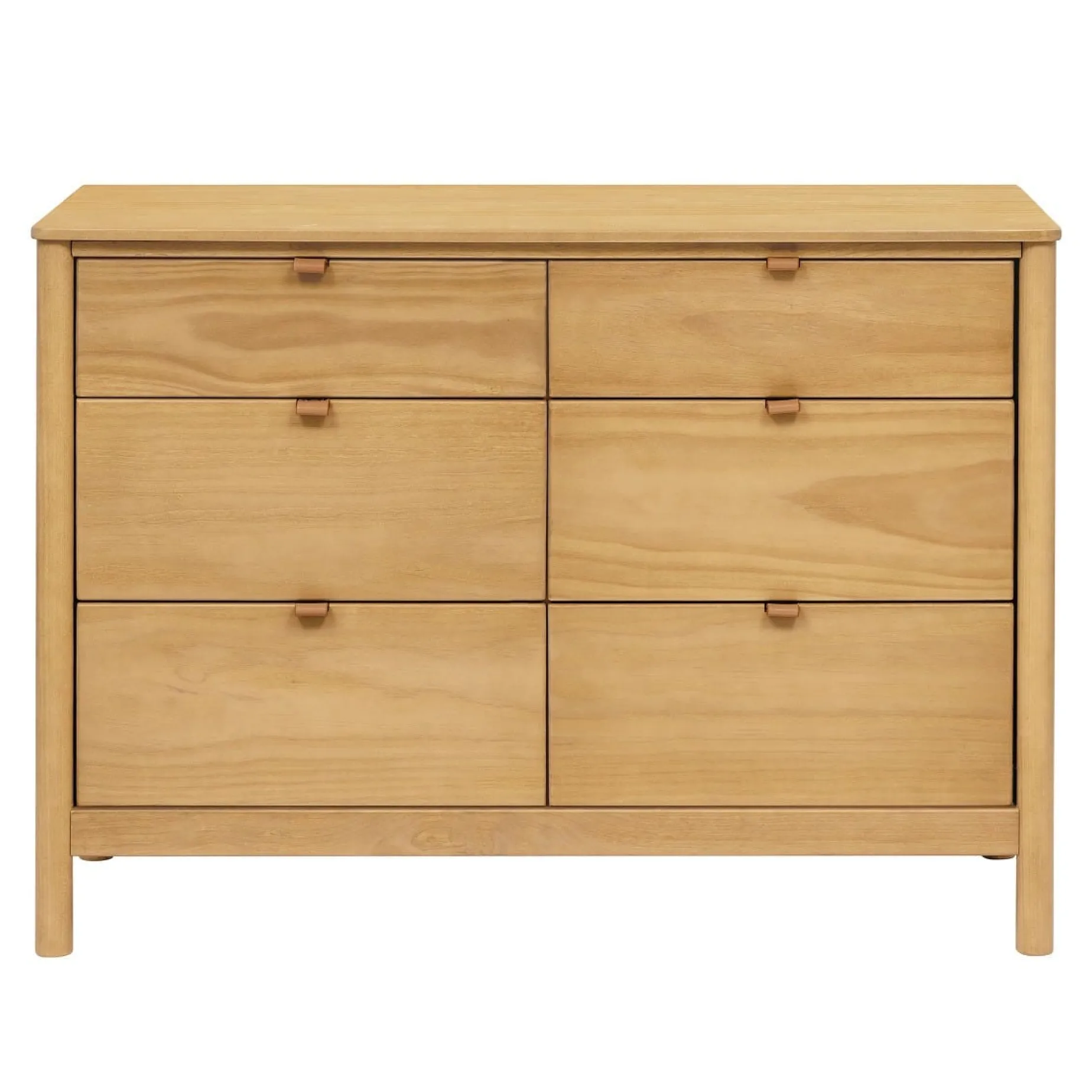 The simple yet sophisticated Bondi 6-Drawer Assembled Dresser complements both the Babyletto Bondi Cane 3-in-1 Crib and the Bondi Boucle 4-in-1 Crib with its warm wood finish and tonal vegan leather drawer pulls, rounded posts and minimalist silhouette. It’s designed for the nursery with spacious smooth-glide drawers, included anti-tip kit for safety, and best-of-all it arrives fully assembled, ready out of the box.