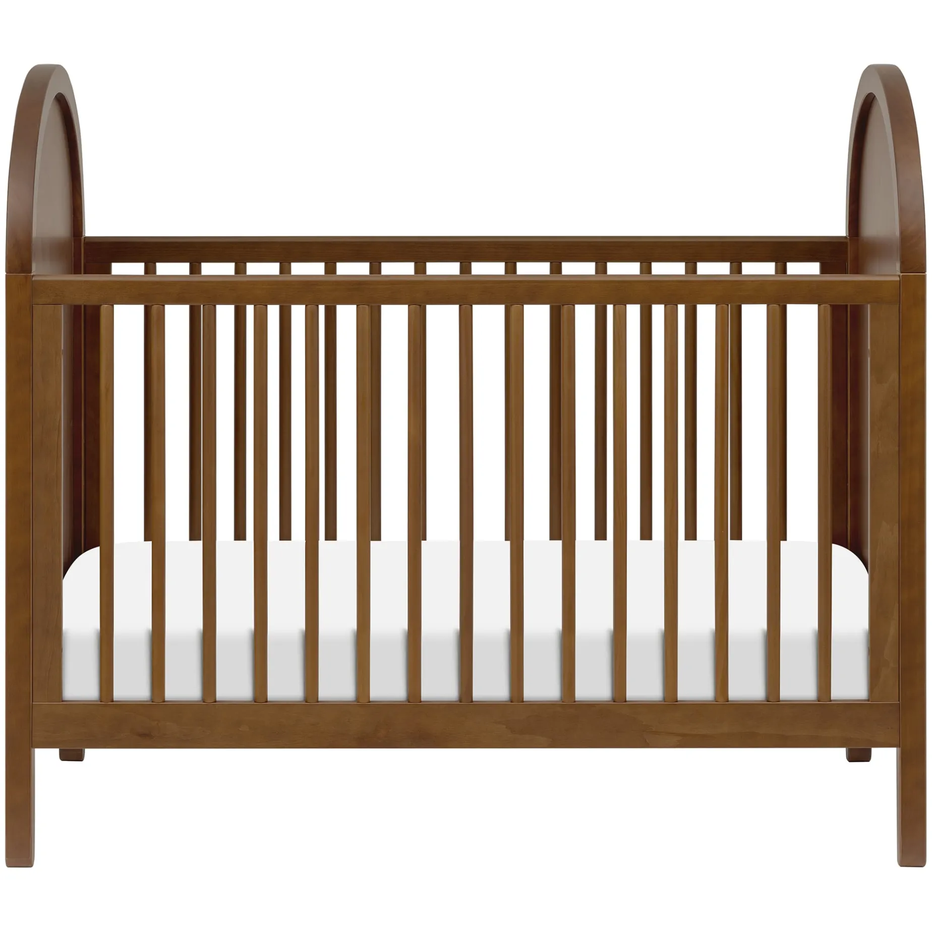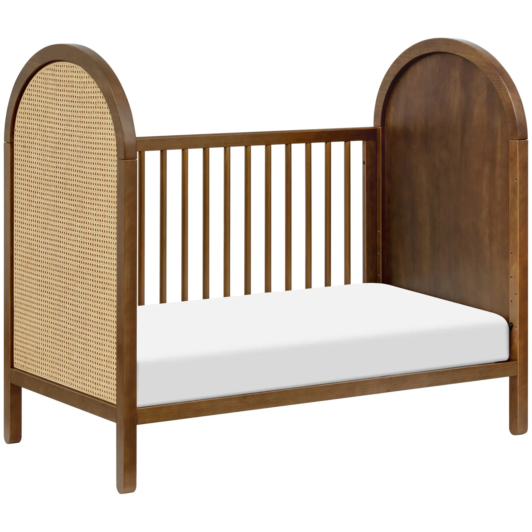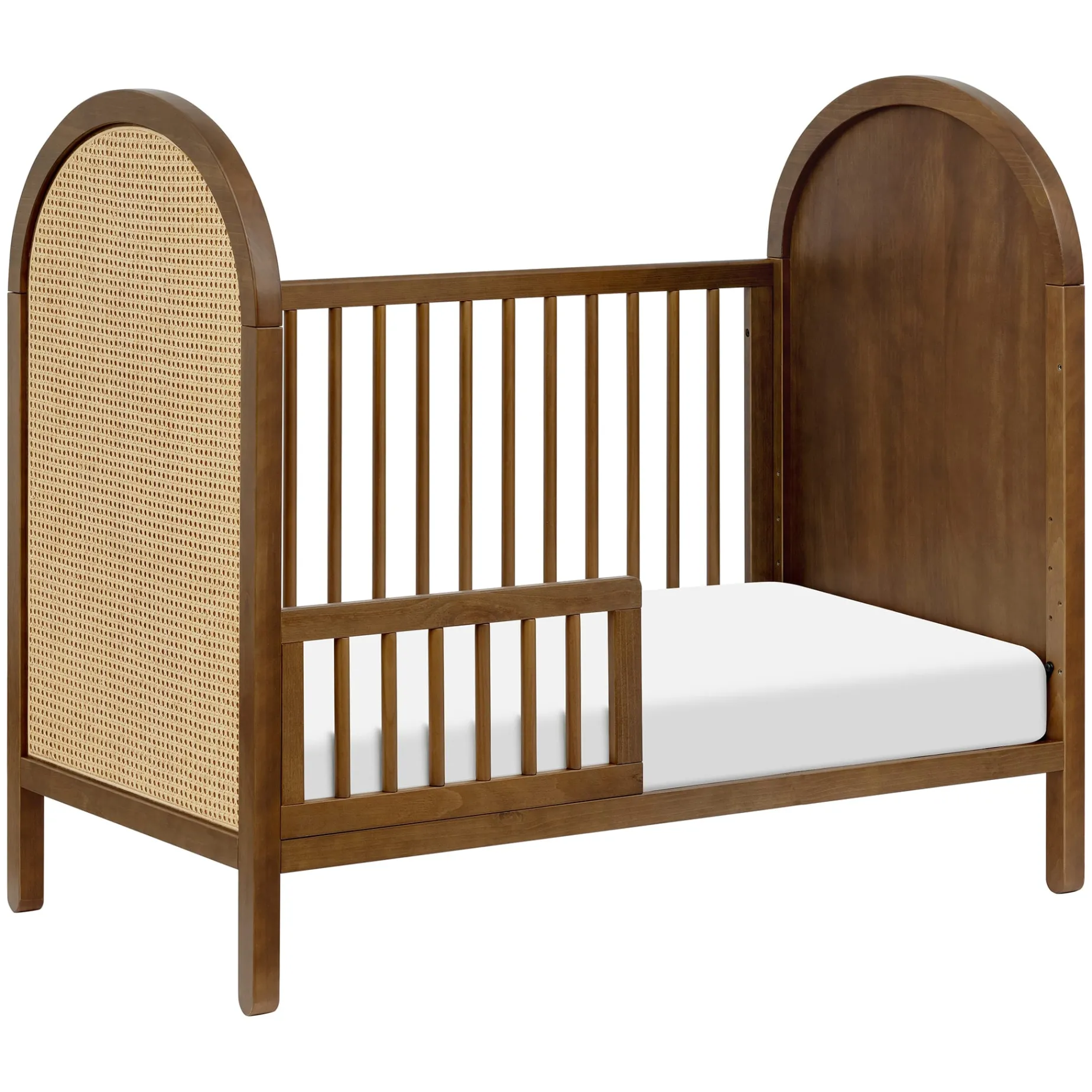 The Bondi Cane 3-in-1 Convertible Crib celebrates boho-inspired design and natural materials with its warm wood tone, playfully arched side panels, curved feet, and woven plant-based cane. The Bondi is designed to grow with your babe using an included toddler bed conversion rail and is screened for harmful chemical emissions to ensure it meets GREENGUARD GOLD Certification.