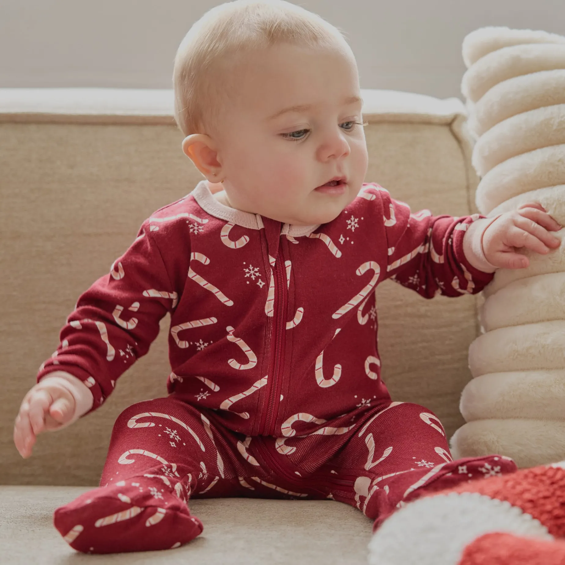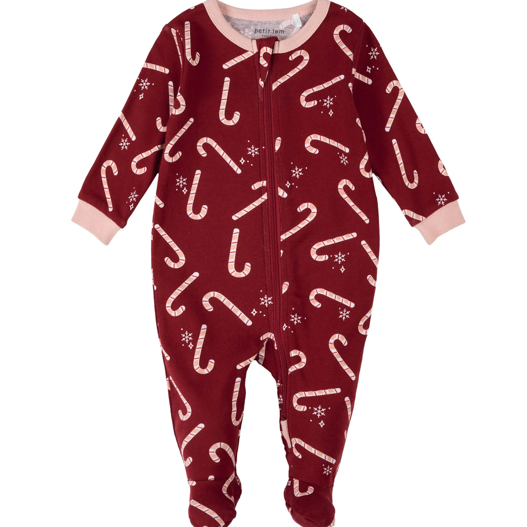 Let them follow a trail of candy canes all the way to dreamland in this jolly red footed sleeper. Made with soft organically grown cotton rib, it’s light yet cozy for chilly December nights. A two-way zipper makes for quick changes while ribbed cuffs keep little hands free to explore. Matching PJs are available for older siblings.