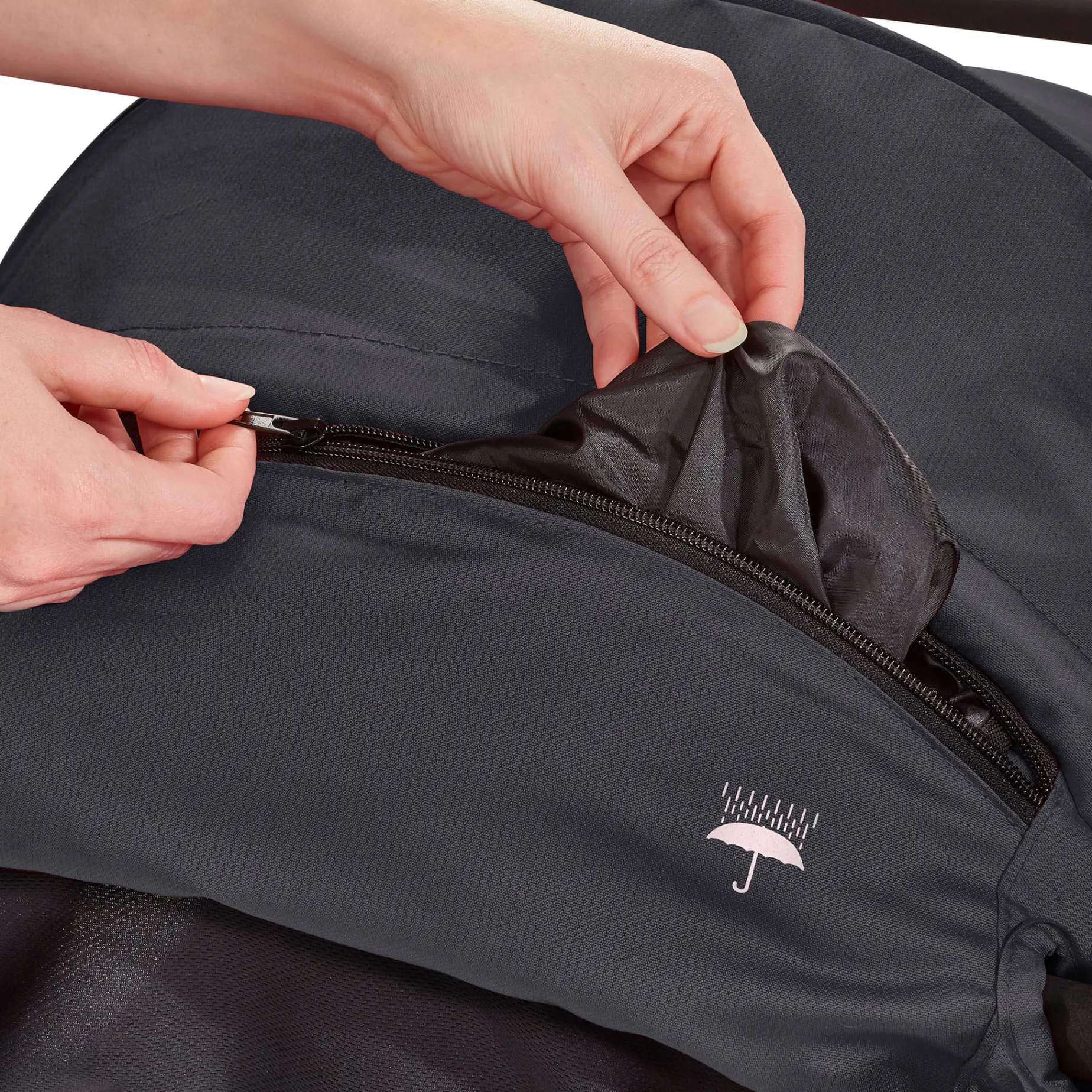 -Second sun canopy in the set of two features a built-in bug cover that safely encloses the caravan in a fine woven mesh to protect passengers from insects and flying debris